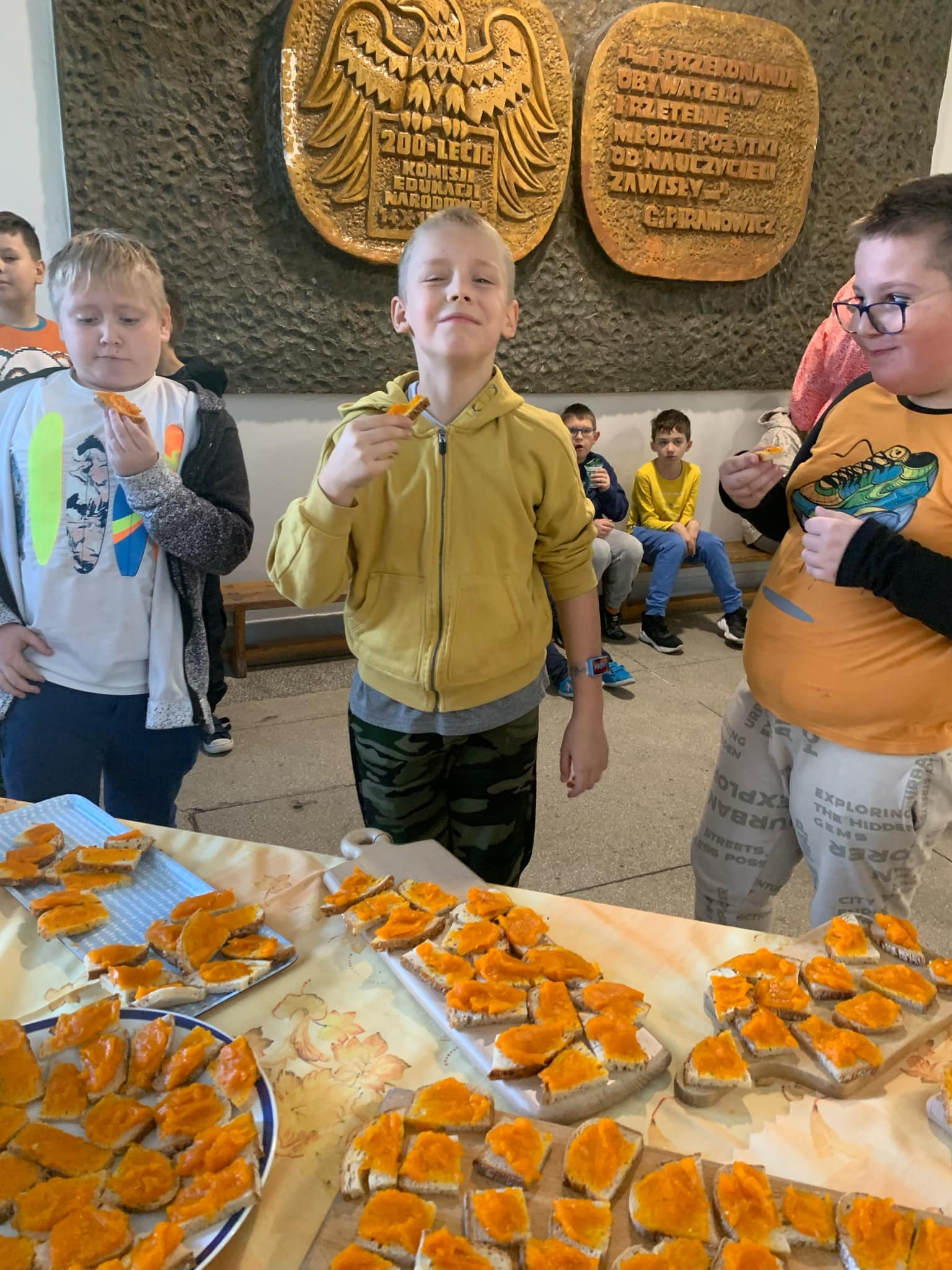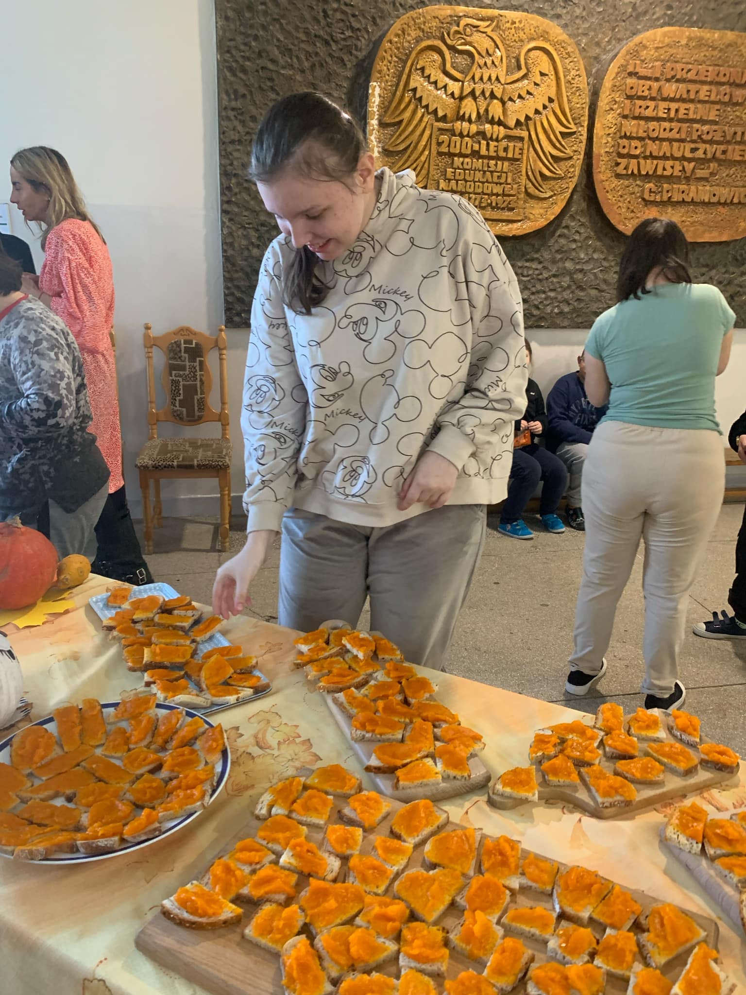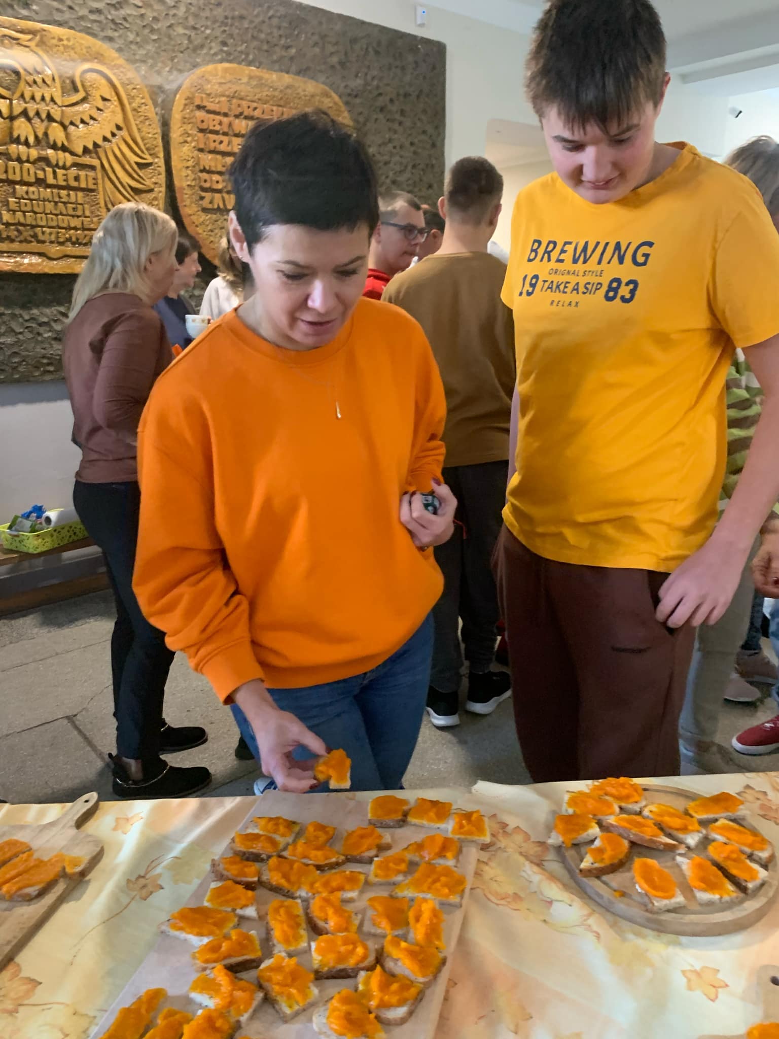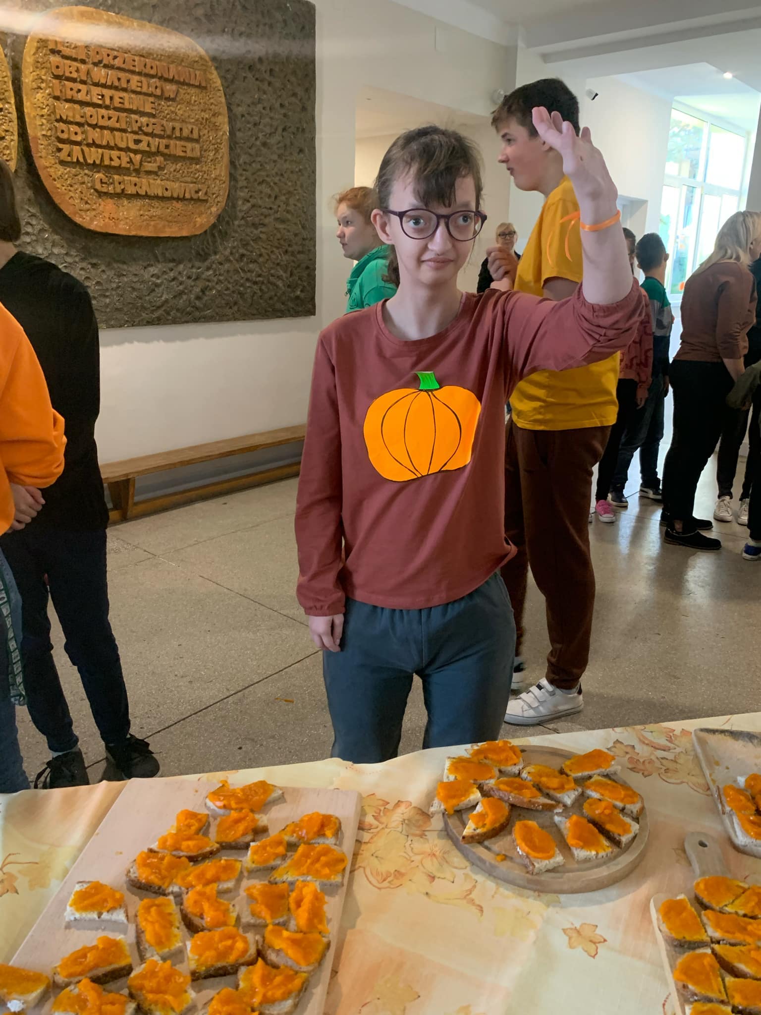 Za nami kolejna edycja konkursu plastycznego z okazji Dnia Dyni. W tym roku dodatkowo obchodziliśmy Pomarańczowy Dzień. Z tej okazji chętni uczniowie i wychowawcy do swojego stroju dodali pomarańczowy akcent. Pojawiły się rożne motywy dyni w ubraniu dzieci. W tym roku w ramach promocji zdrowia i nie marnowania żywności uczniowie szkoły branżowej i podstawowej pod opieką pani Sylwii Gamus i pani Ewy Gadomskiej przygotowali marmoladę z dyni z obniżoną zawartością cukru. Kanapki bardzo szybko znikały ze stołu.