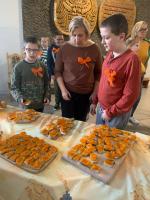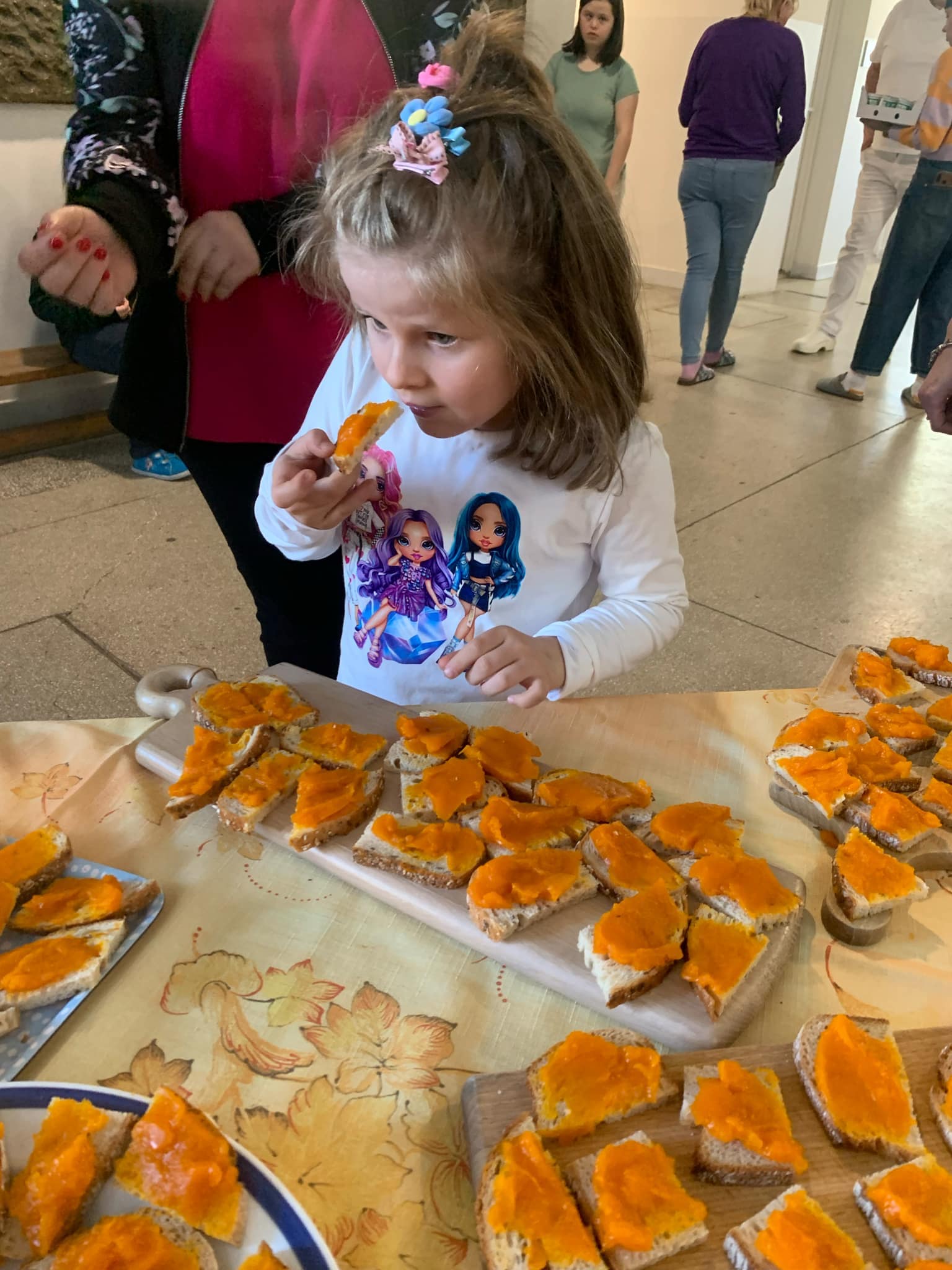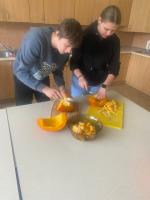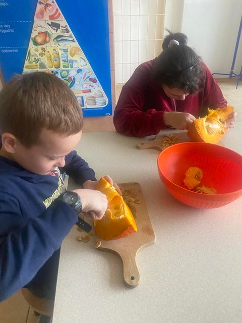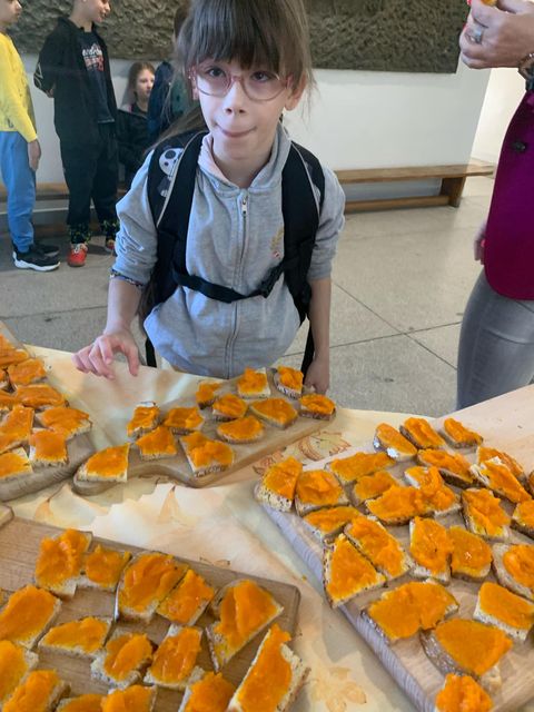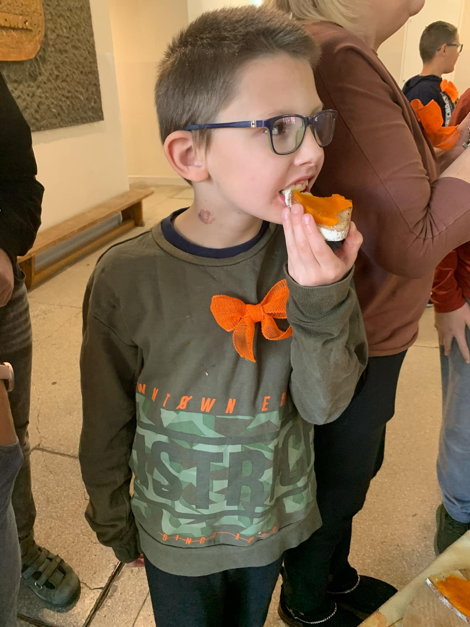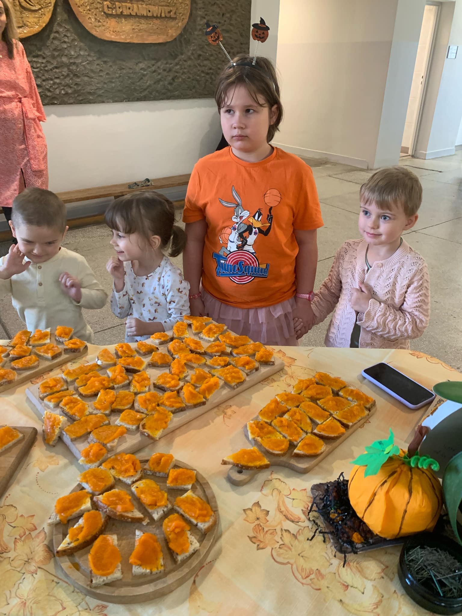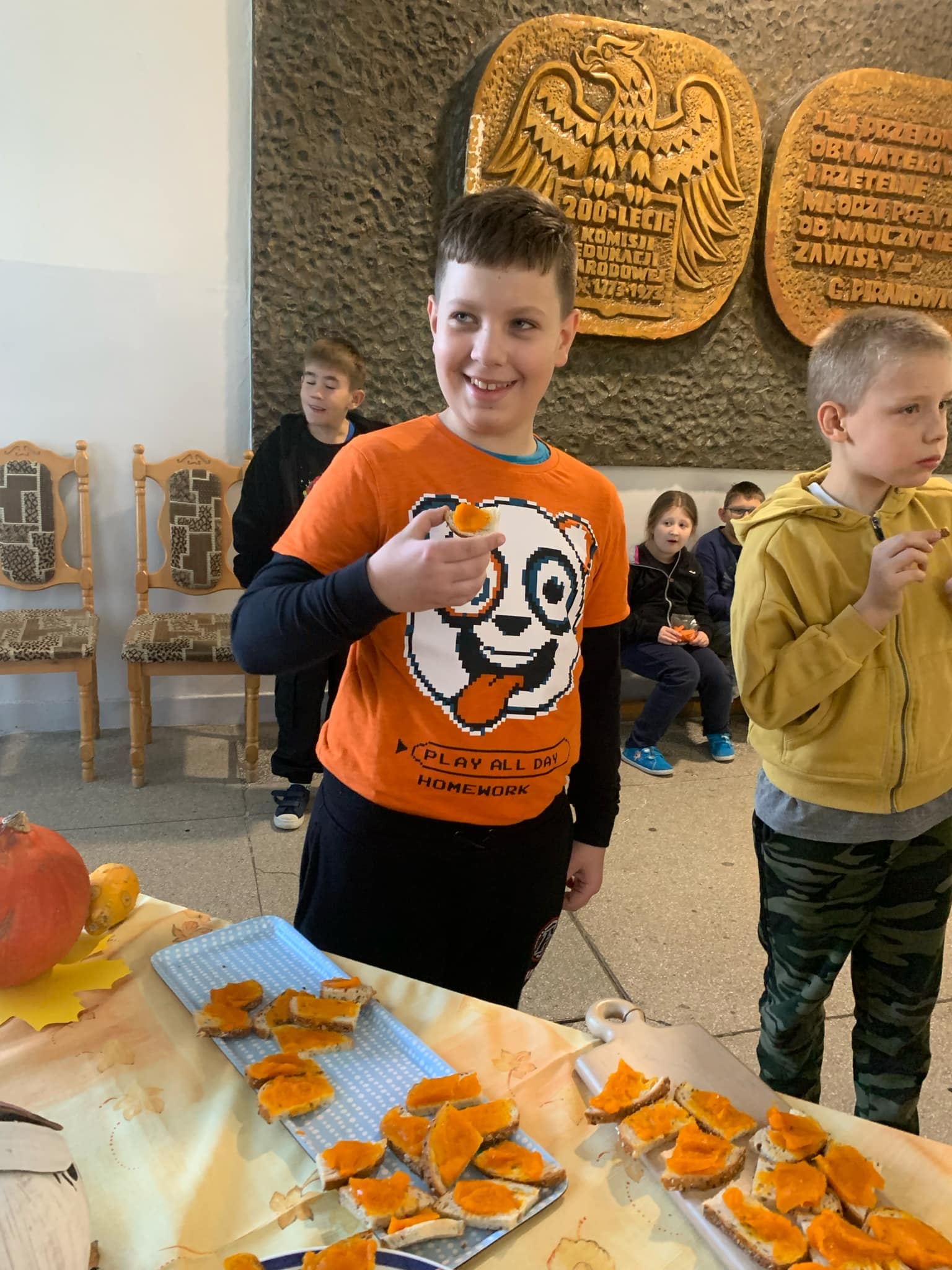 Za nami kolejna edycja konkursu plastycznego z okazji Dnia Dyni. W tym roku dodatkowo obchodziliśmy Pomarańczowy Dzień. Z tej okazji chętni uczniowie i wychowawcy do swojego stroju dodali pomarańczowy akcent. Pojawiły się rożne motywy dyni w ubraniu dzieci. W tym roku w ramach promocji zdrowia i nie marnowania żywności uczniowie szkoły branżowej i podstawowej pod opieką pani Sylwii Gamus i pani Ewy Gadomskiej przygotowali marmoladę z dyni z obniżoną zawartością cukru. Kanapki bardzo szybko znikały ze stołu.