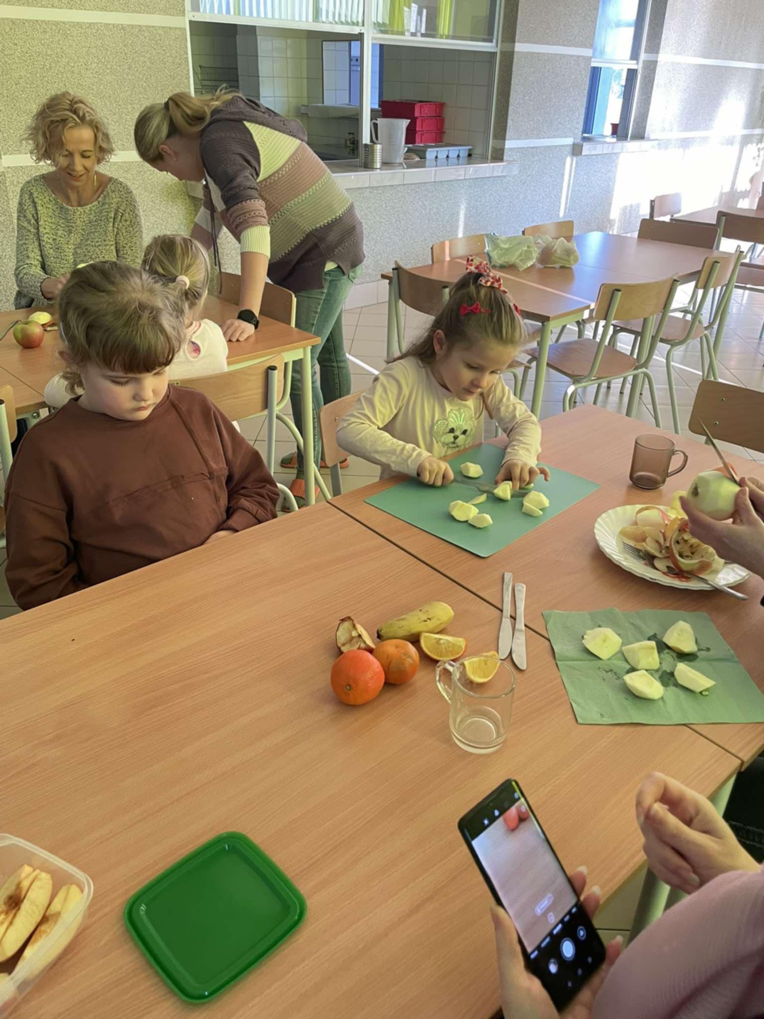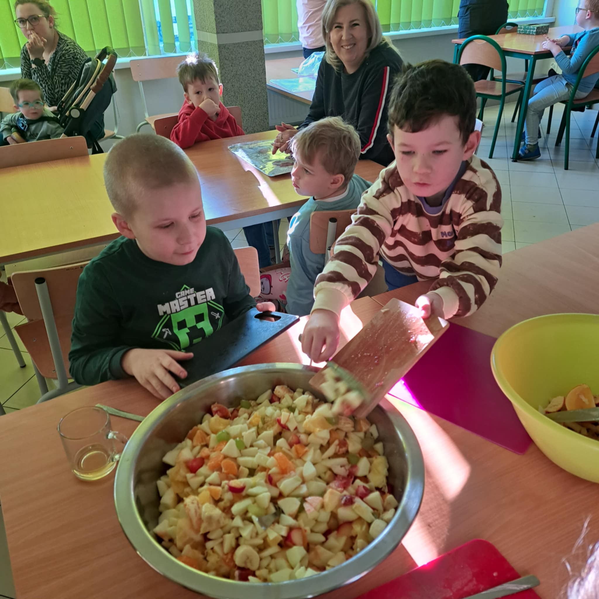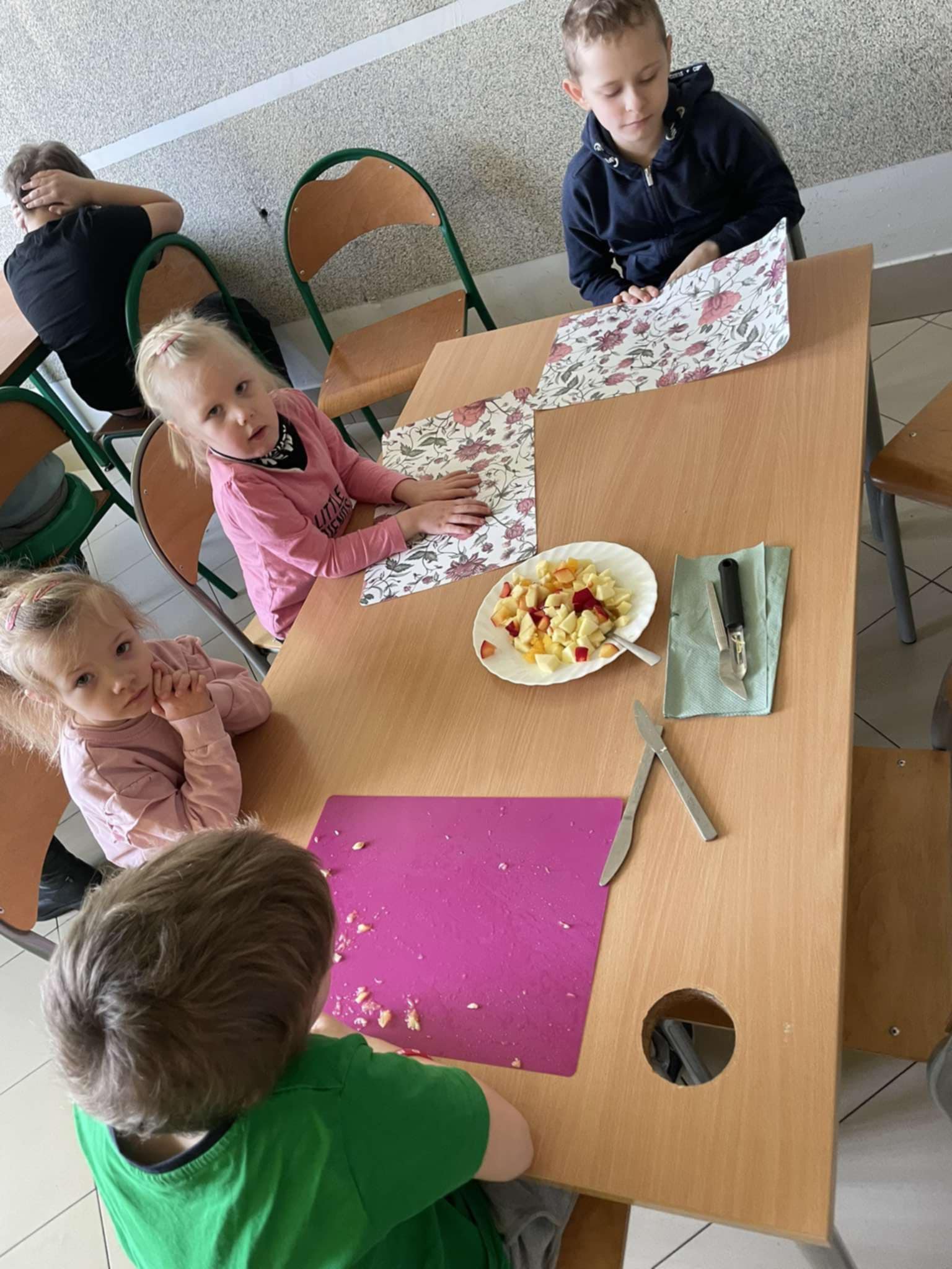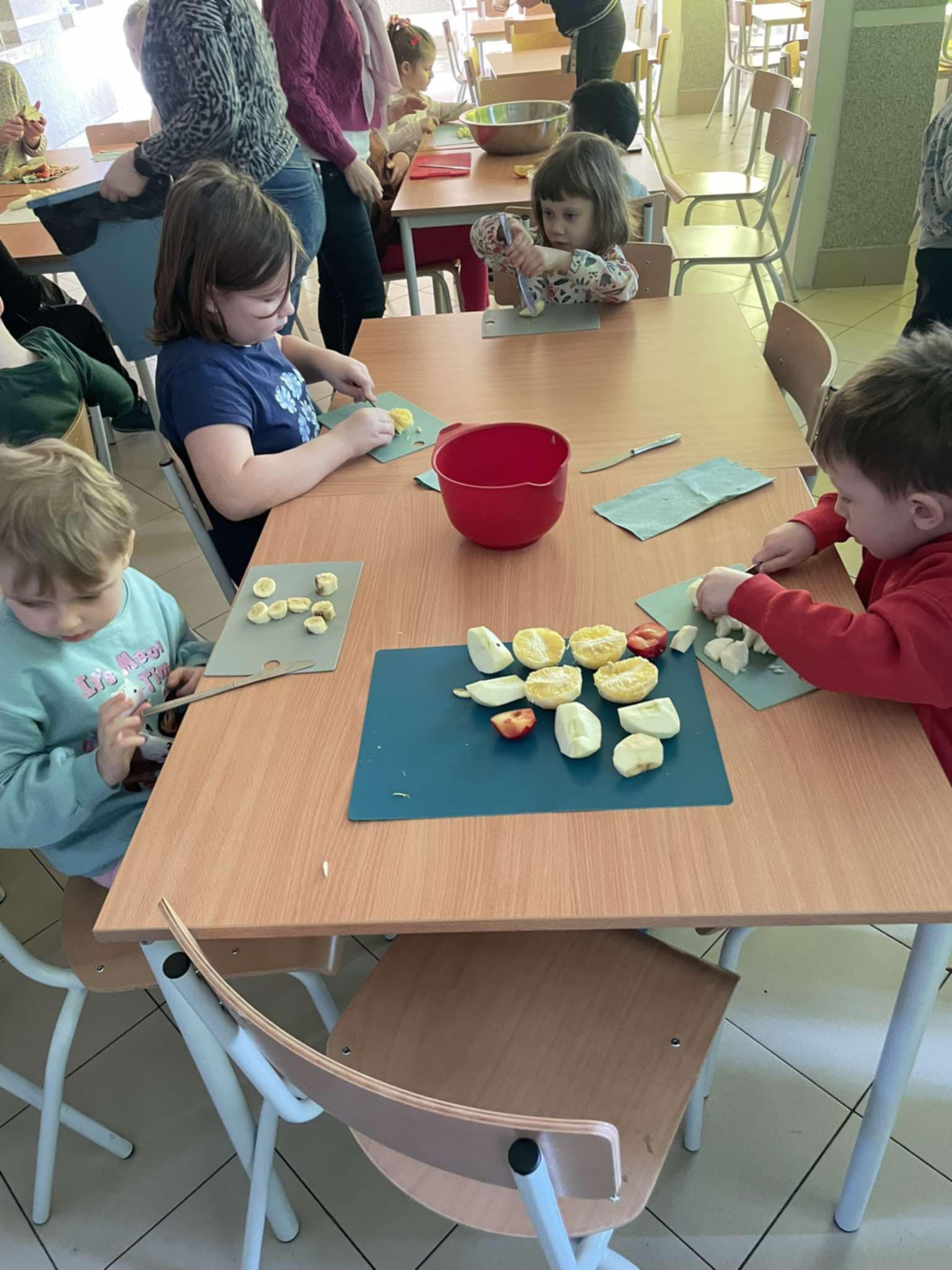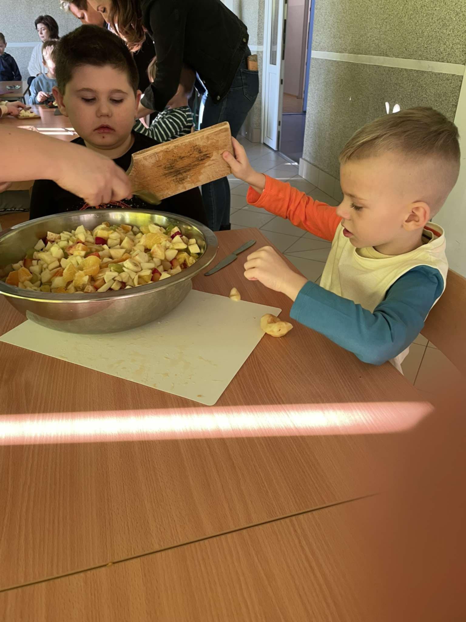 W ramach promocji zdrowia przedszkolaki przygotowały sałatkę owocową - Projekt "Mali kucharze - gotować każdy może".