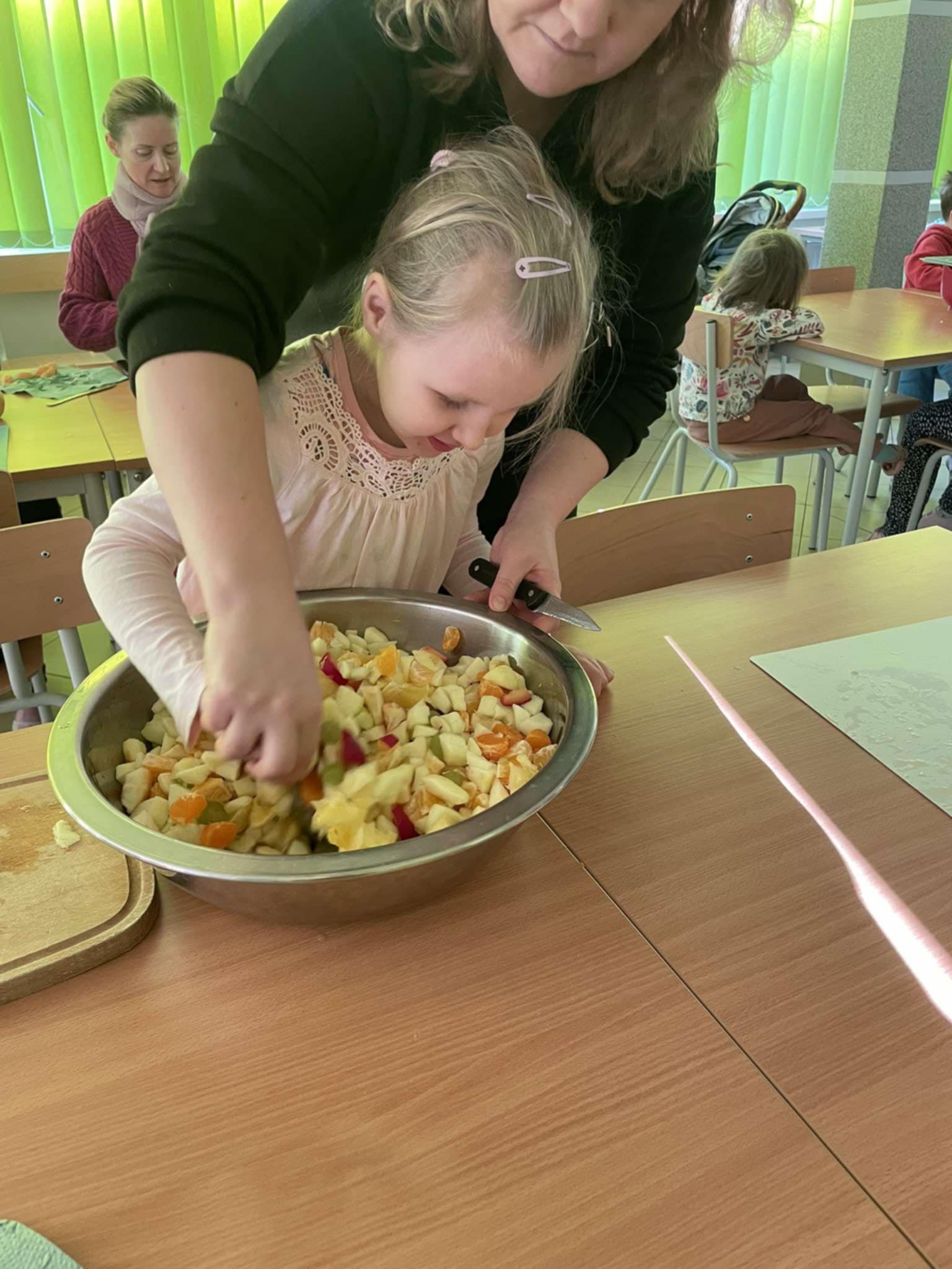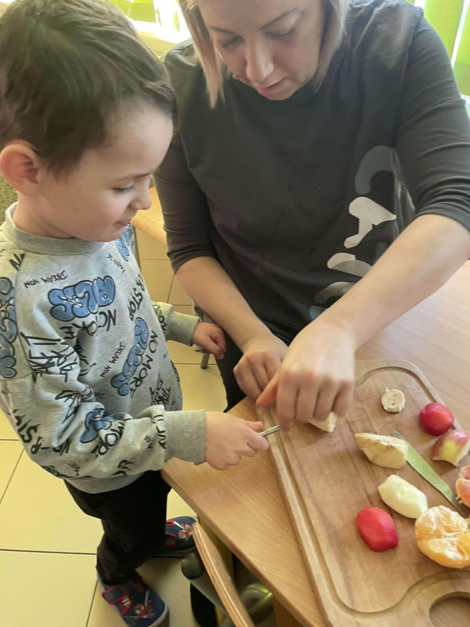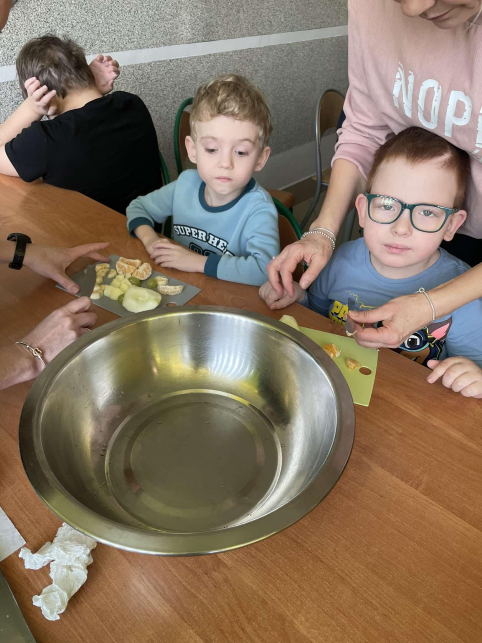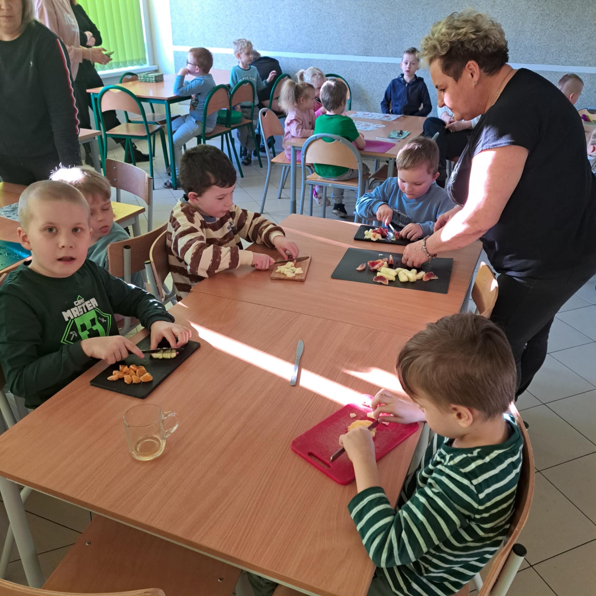 W ramach promocji zdrowia przedszkolaki przygotowały sałatkę owocową - Projekt "Mali kucharze - gotować każdy może".