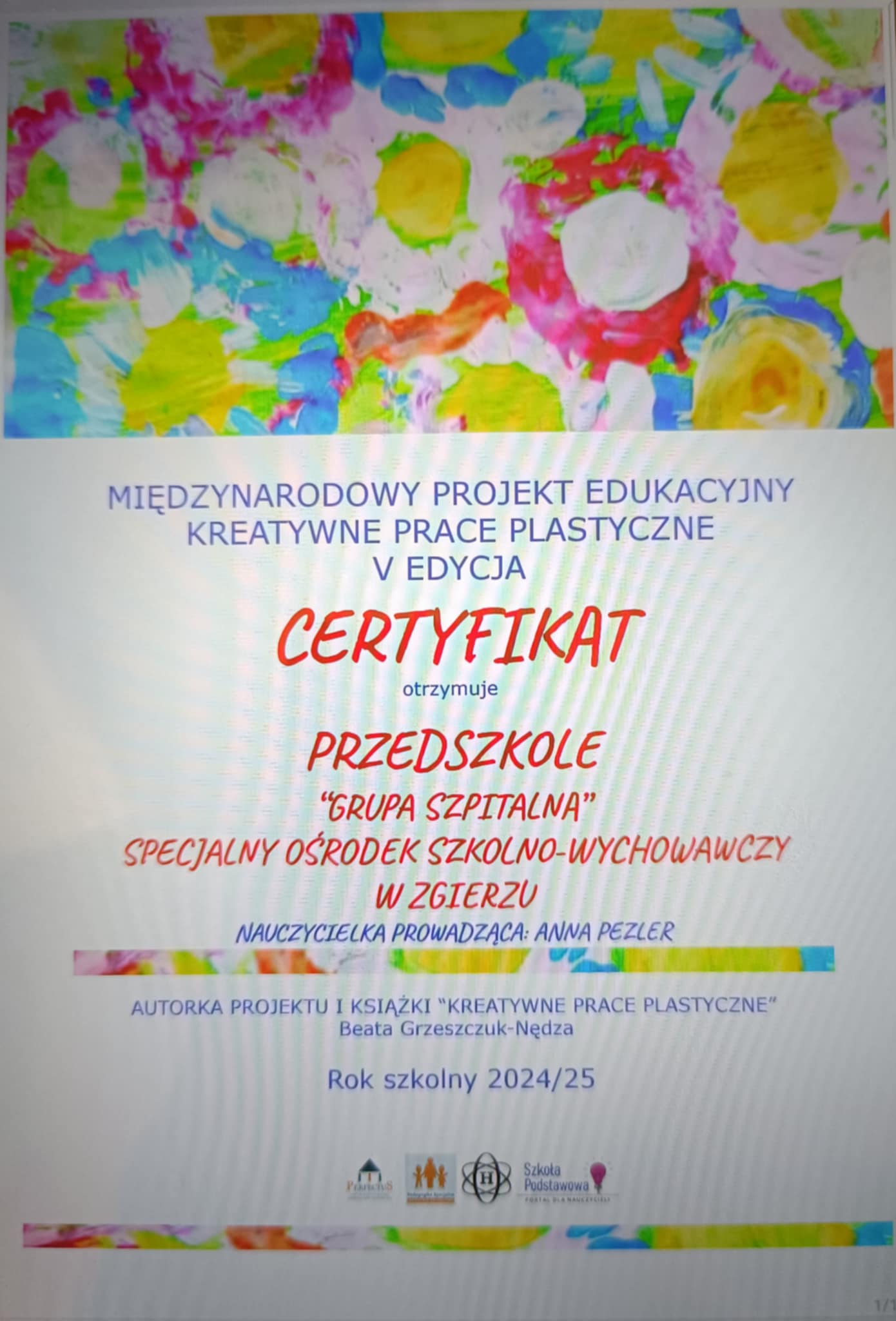 Po raz kolejny przedszkolaki z "Grupy szpitalnej" zakończyły swoją przygodę z Międzynarodowym Projektem Edukacyjnym "Kreatywne prace plastyczne". Co miesiąc wykonywały zadania, które pozwoliły im na zaspokojenie naturalnej potrzeby tworzenia i aktywności plastycznej w zakresie eksperymentowania z różnymi materiałami i technikami plastycznymi. Oto niektóre z zadań.