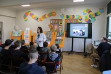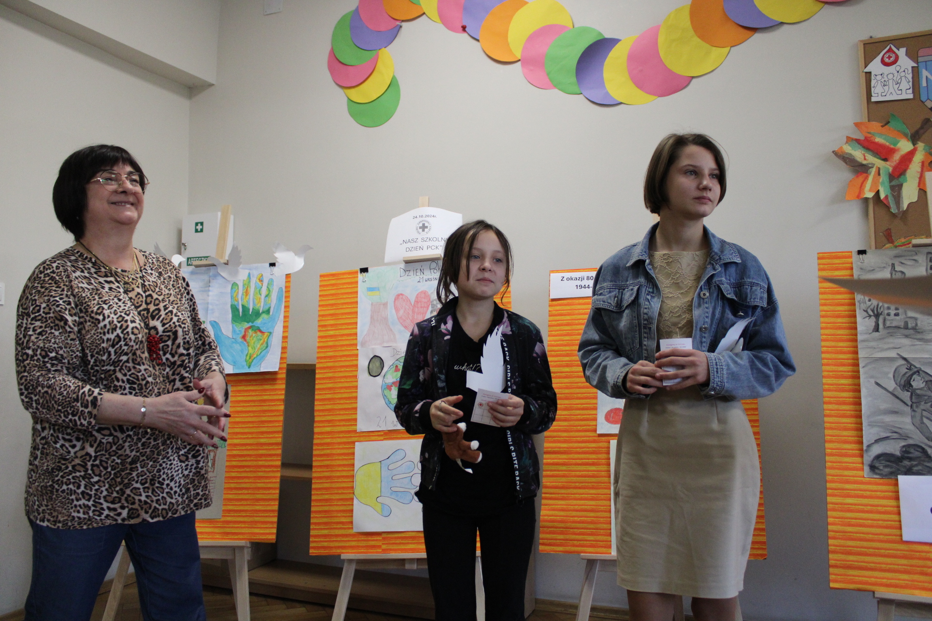 Po prezentacji prawidłowe odpowiedzi związane z jej treścią były nagradzane, a każdy uczestnik tego spotkania otrzymał białego gołębia wyciętego z kartonu jako symbolu pokoju. Podczas uroczystości odbyło się również wręczenie "Legitymacji Członkowskiej PCK" uczniom naszego Ośrodka Szkolno - Wychowawczego, którzy z dniem 24.10.2024r weszli w szeregi członków PCK. Legitymacje w 1 turze uroczystości wręczyła Pani Dyrektor Ilona Kowalska, w 2 turze Pani Dyrektor Beata Strojek, a w 3 turze Pielęgniarka Pani Ilona Malinowska.