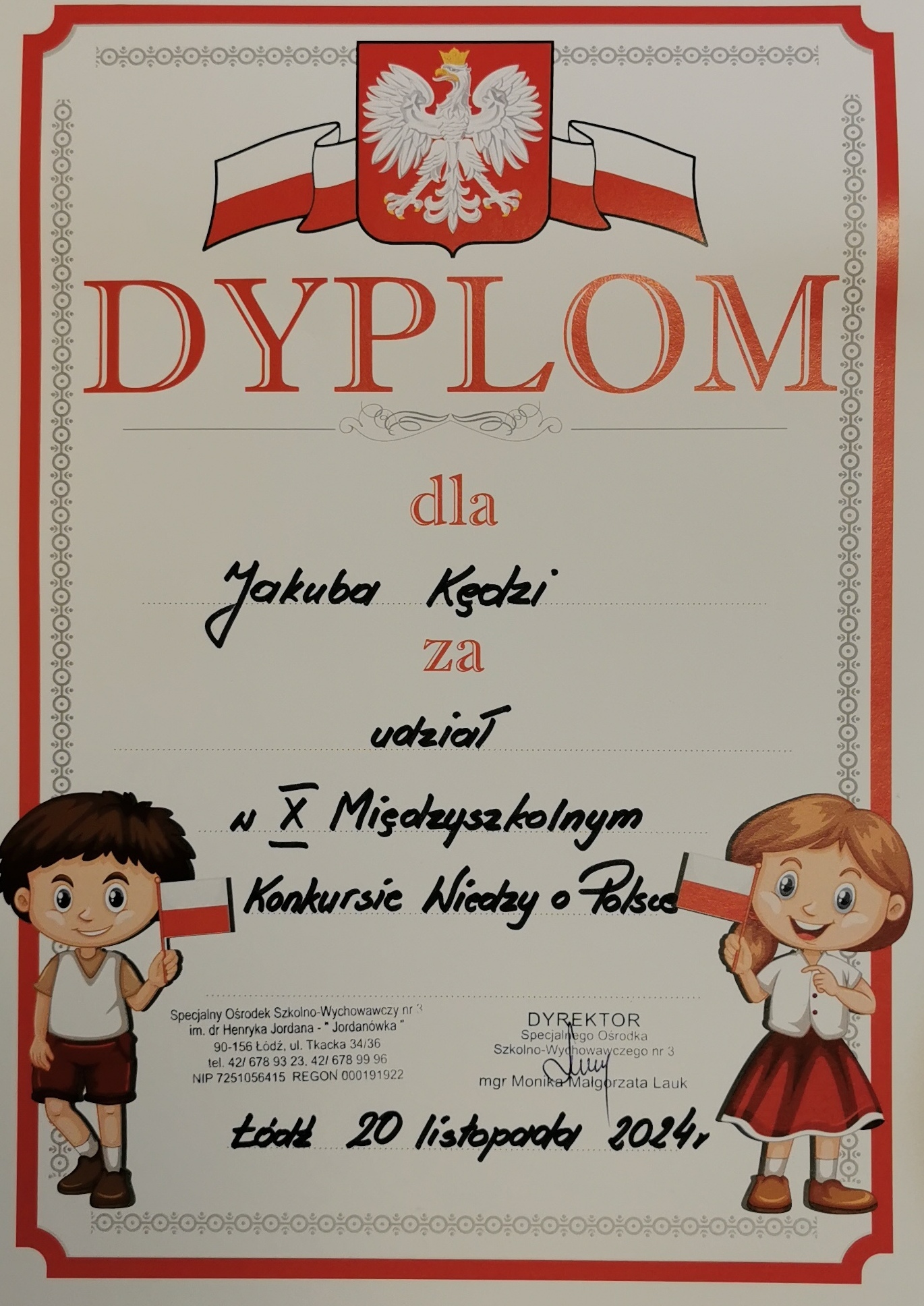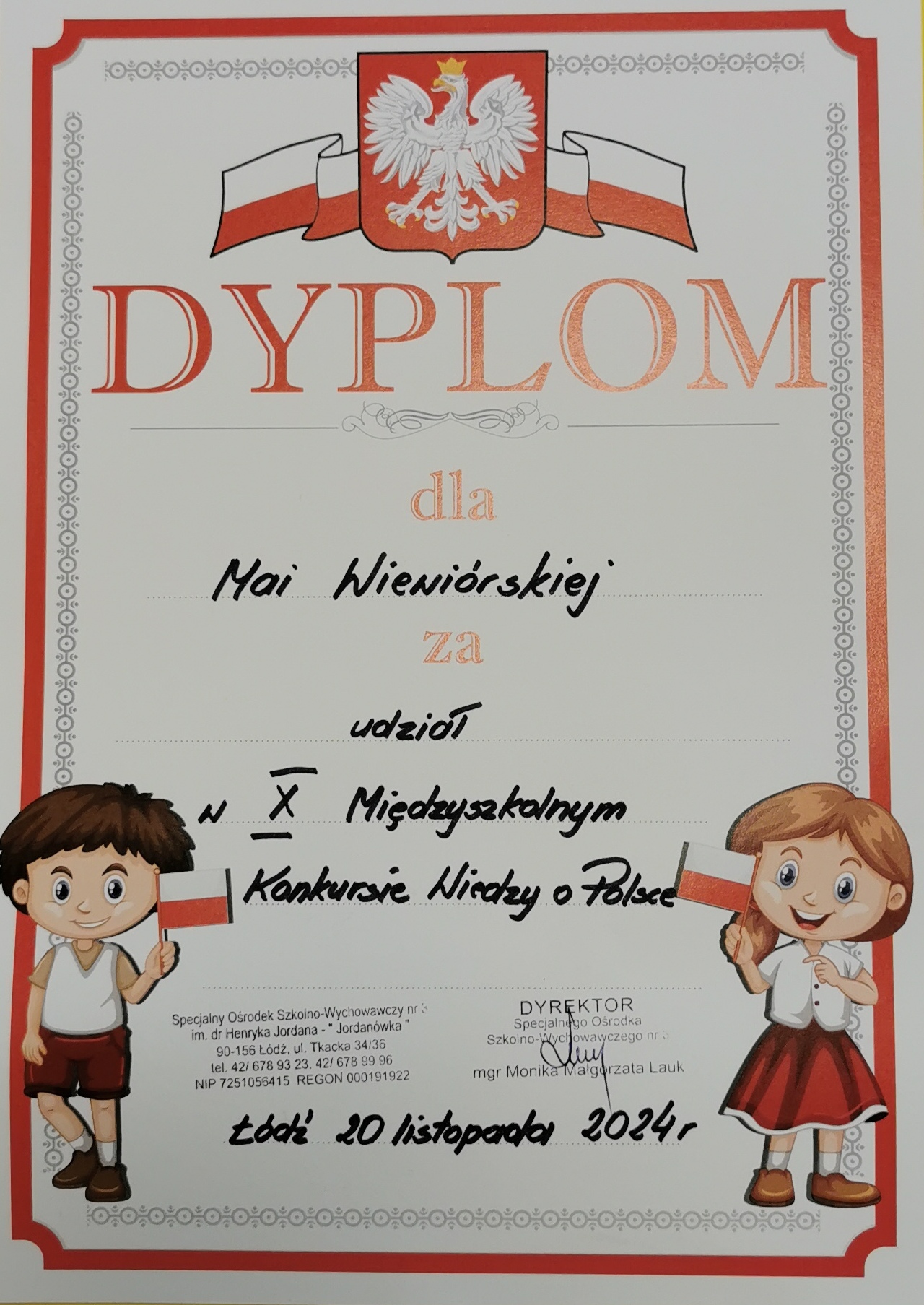 20 listopada 2024 roku Maja i Kuba reprezentowali naszą placówkę w X Międzyszkolnym Konkursie Wiedzy o Polsce pt. „Polska – nasza duma”. Celem konkursu było zachęcanie uczniów do pogłębiania wiedzy na temat swojego kraju oraz wzbudzanie poczucia patriotyzmu i tożsamości narodowej.