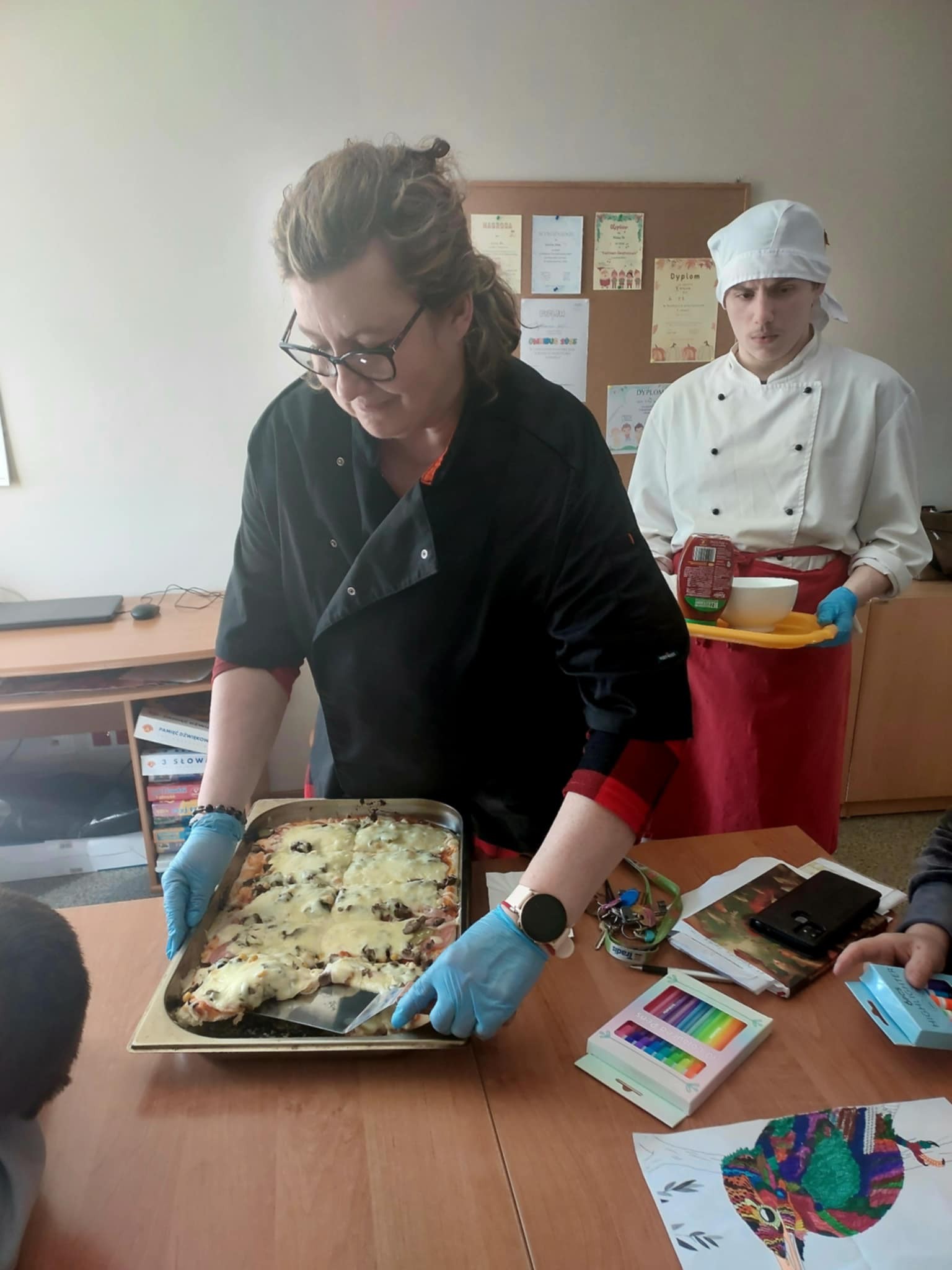 Na zakończenie wydarzenia klasa branżowa o zawodzie kucharz pod opieką pani B. Strojek zadbała o nasze podniebienia, przygotowując dla wszystkich przepyszną pizzę oraz kubek pełen zdrowych owoców. To był idealny sposób na zakończenie tego wspaniałego dnia!