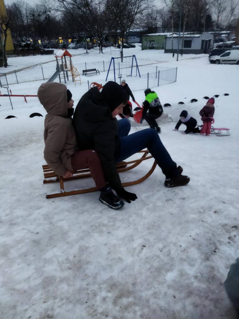 Choć niektórzy narzekają na śnieg - że zimno i ślisko i trzeba odśnieżać - to my wręcz przeciwnie! My wiemy, że "zima lubi dzieci najbardziej na świecie", więc kiedy tylko nadarza się okazja - korzystamy z jej uroków i czerpiemy pełnymi garściami! Wolny czas spędzamy aktywnie na świeżym powietrzu rzucając się ścieżkami lub zjeżdżając na sankach z górki. Wiemy też, że wspólna zabawa na śniegu sprzyja wzmacnianiu odporności, hartuje i krzepi.