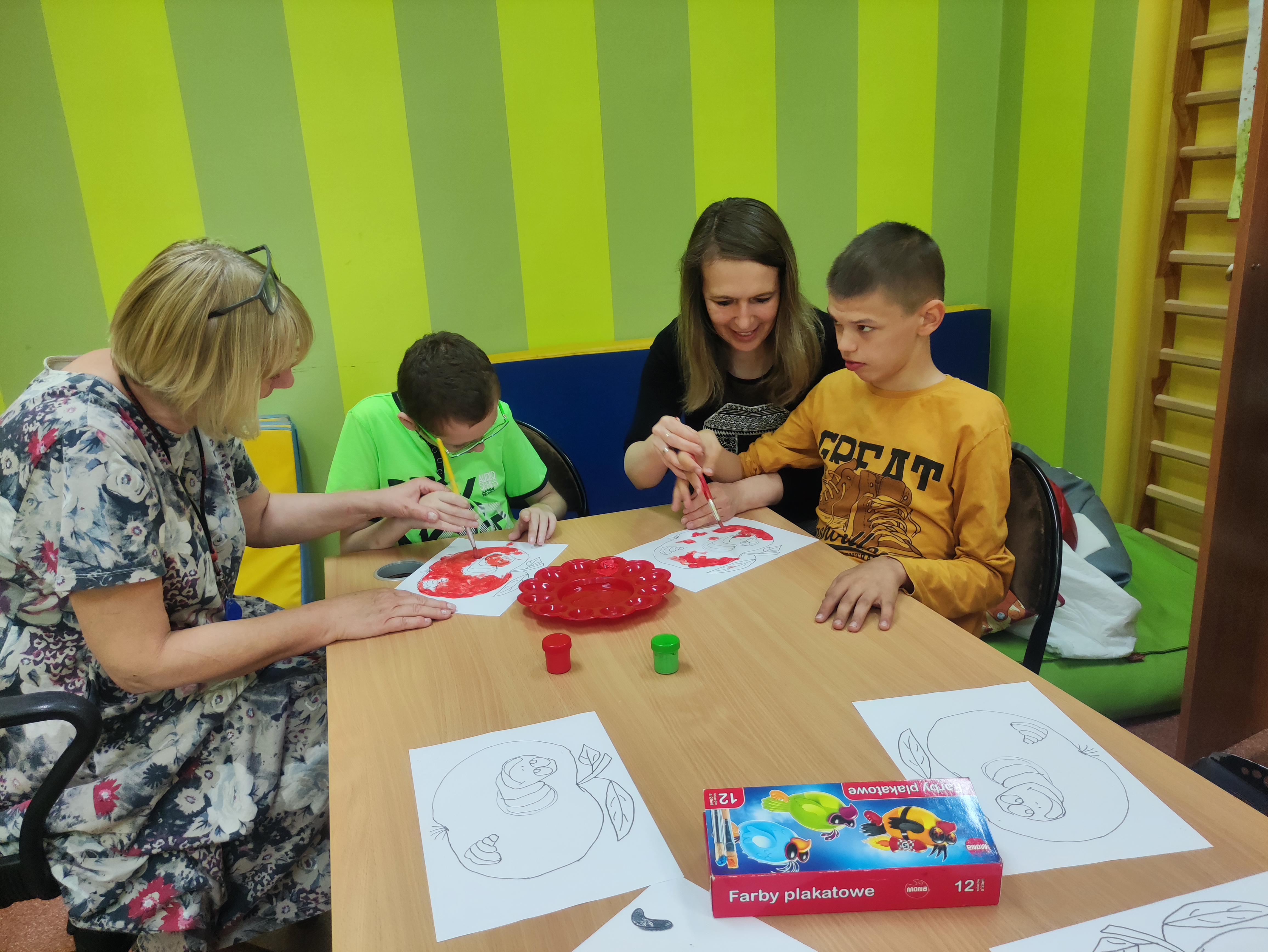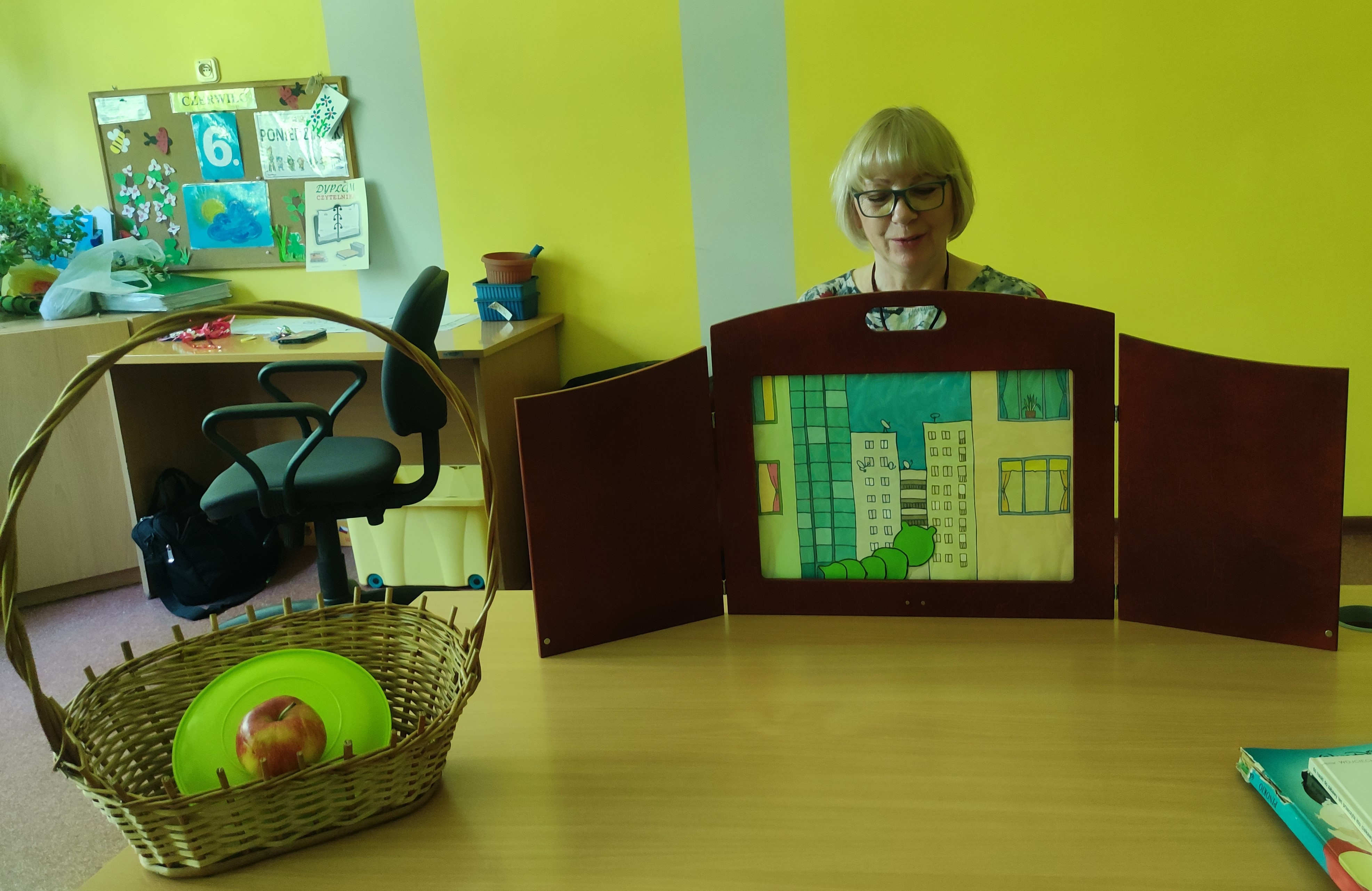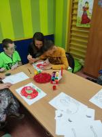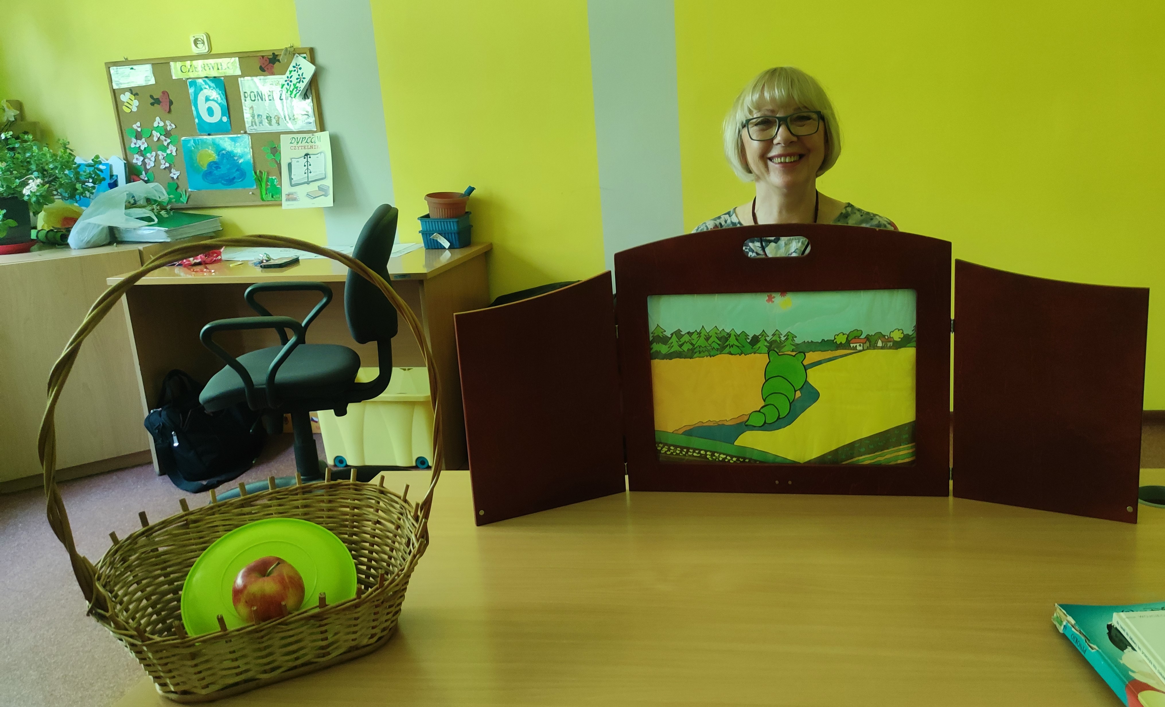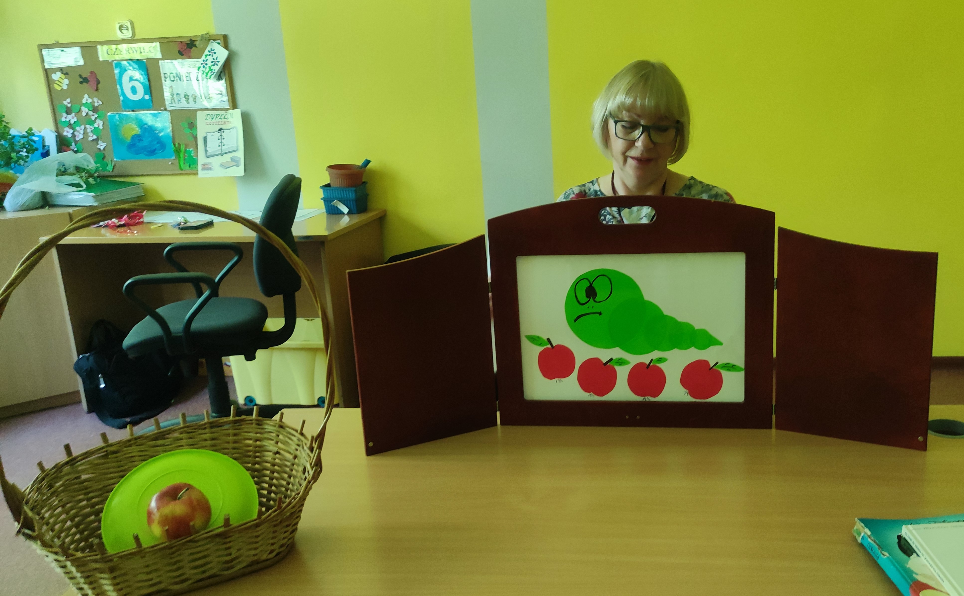 W Zespołach Rewalidacyjno-Wychowawczych gościliśmy Panią Basię z biblioteki, która zaprezentowała przedstawienie wiersza Jana Brzechwy „Entliczek – Pentliczek”. Pani uaktywniła również naszych podopiecznych poprzez zajęcia plastyczne. Malowaliśmy farbami plakatowymi narysowane jabłka z robaczkiem i motylem.