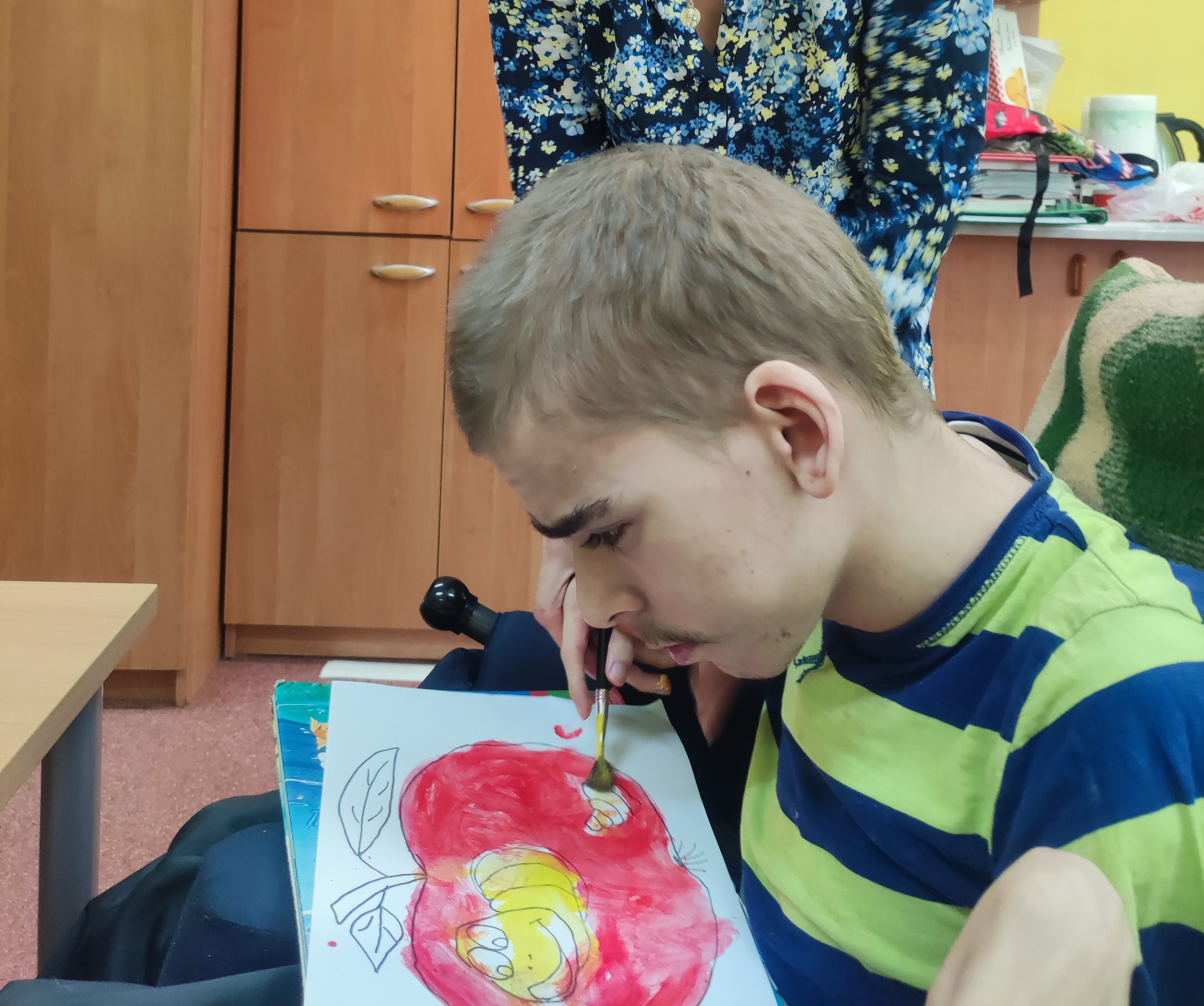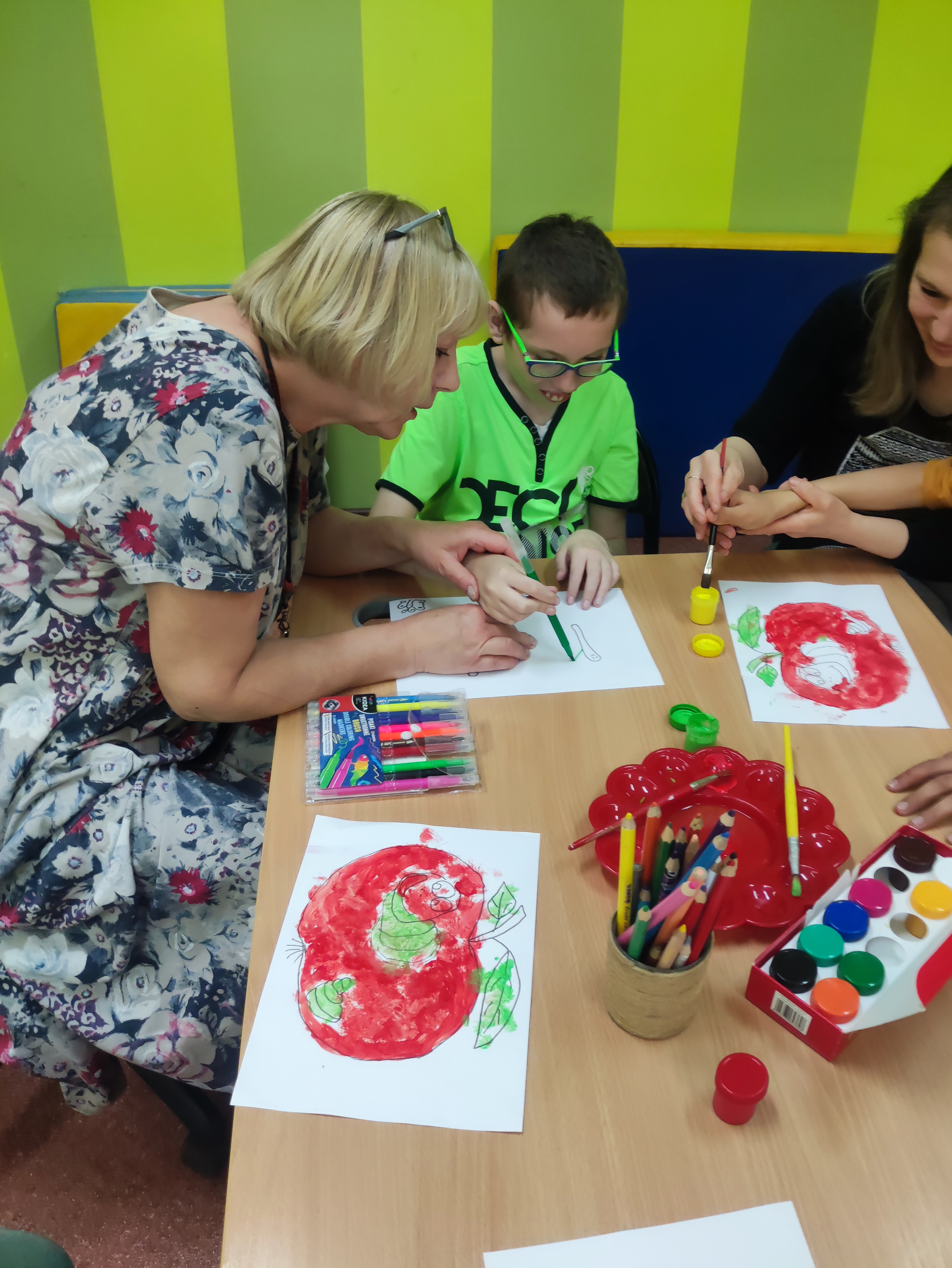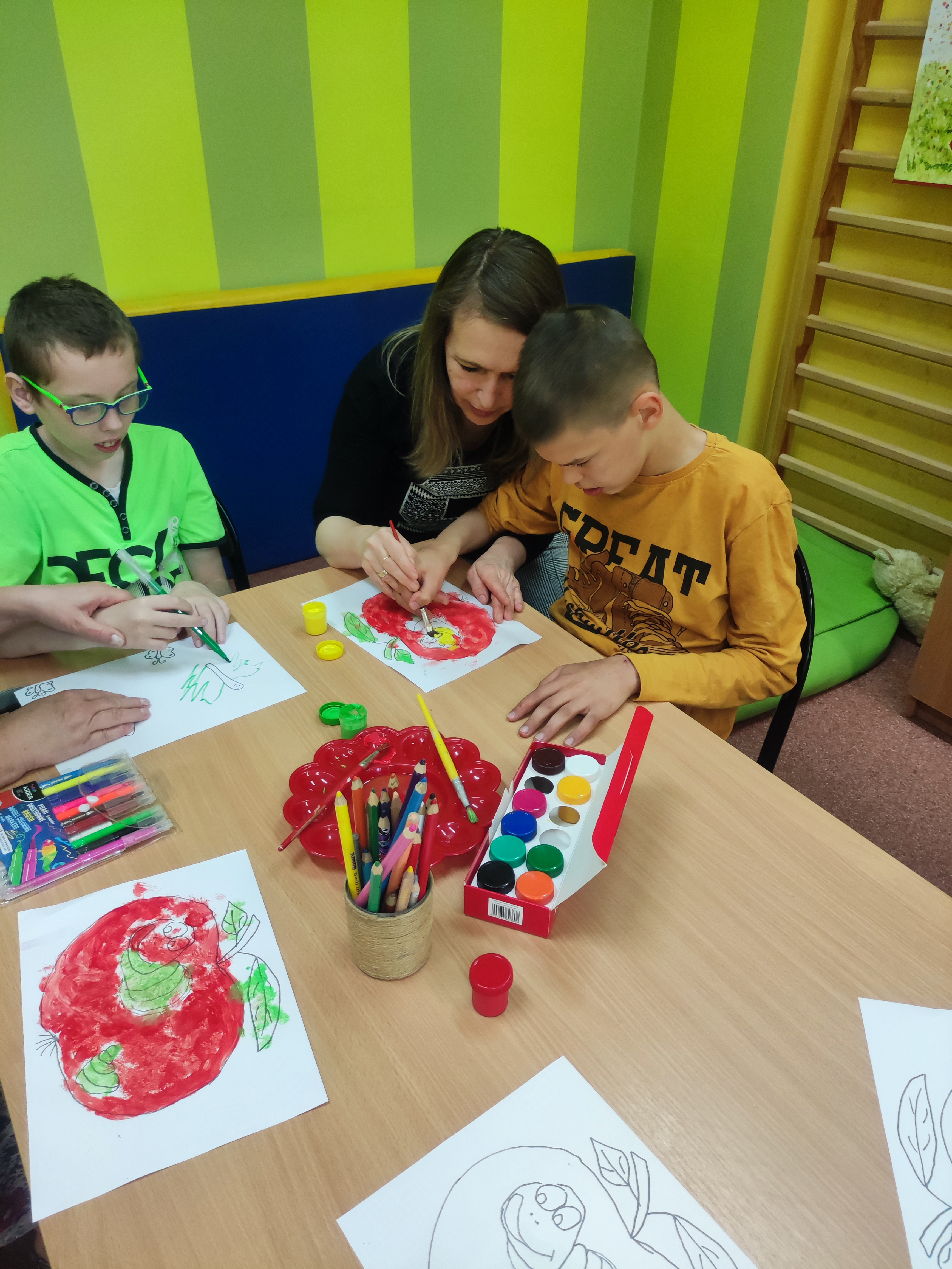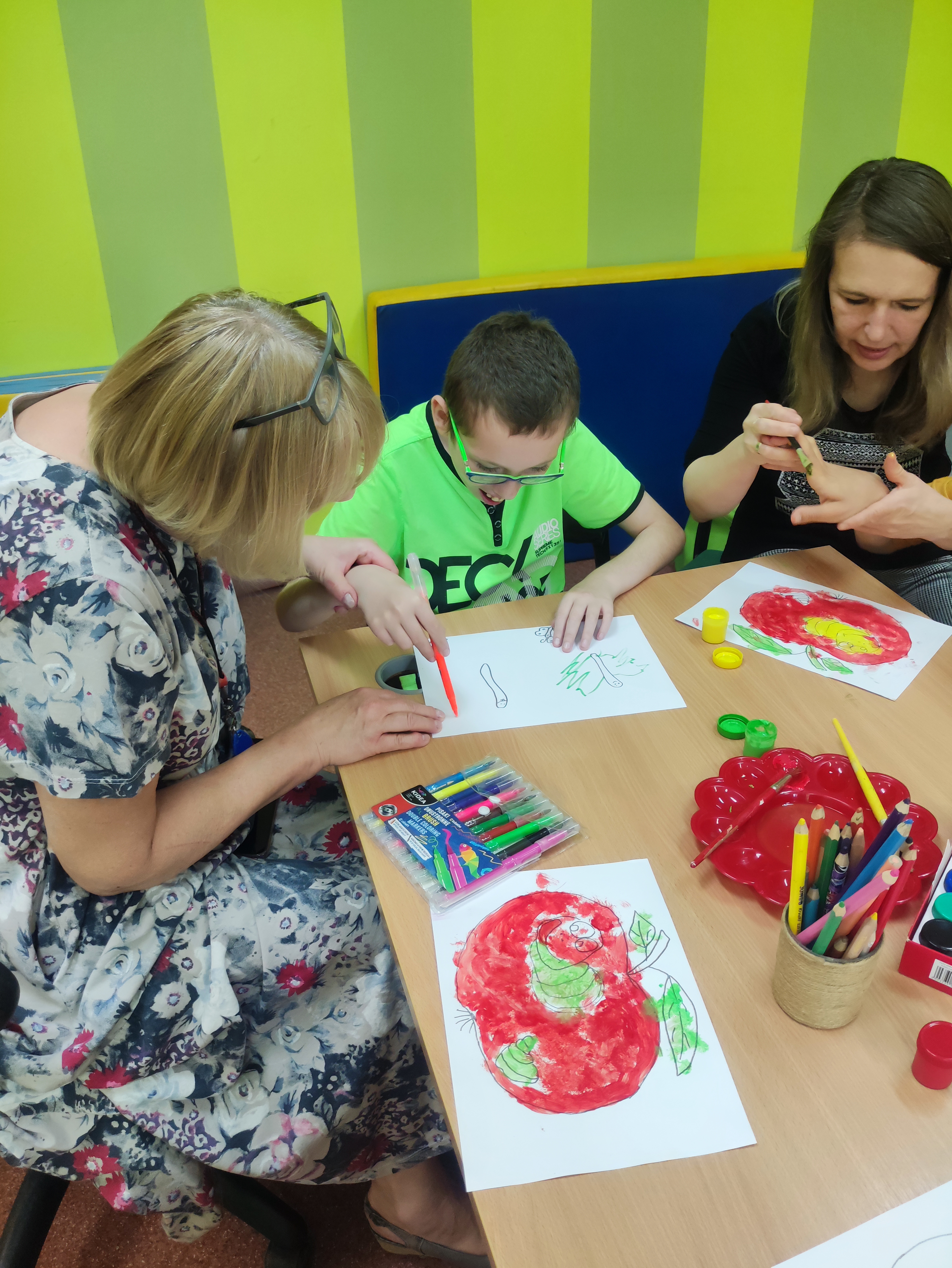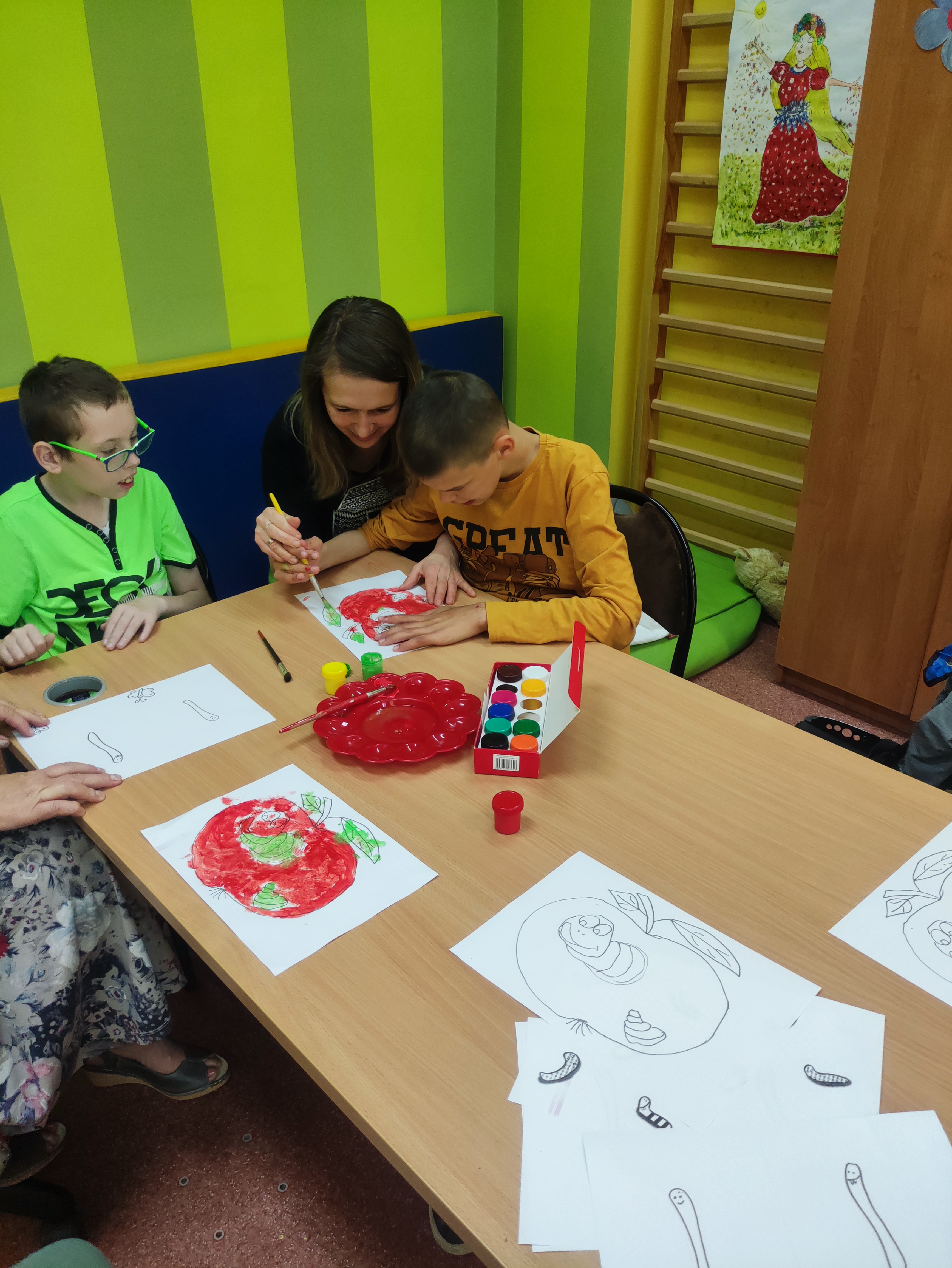 W Zespołach Rewalidacyjno-Wychowawczych gościliśmy Panią Basię z biblioteki, która zaprezentowała przedstawienie wiersza Jana Brzechwy „Entliczek – Pentliczek”. Pani uaktywniła również naszych podopiecznych poprzez zajęcia plastyczne. Malowaliśmy farbami plakatowymi narysowane jabłka z robaczkiem i motylem.