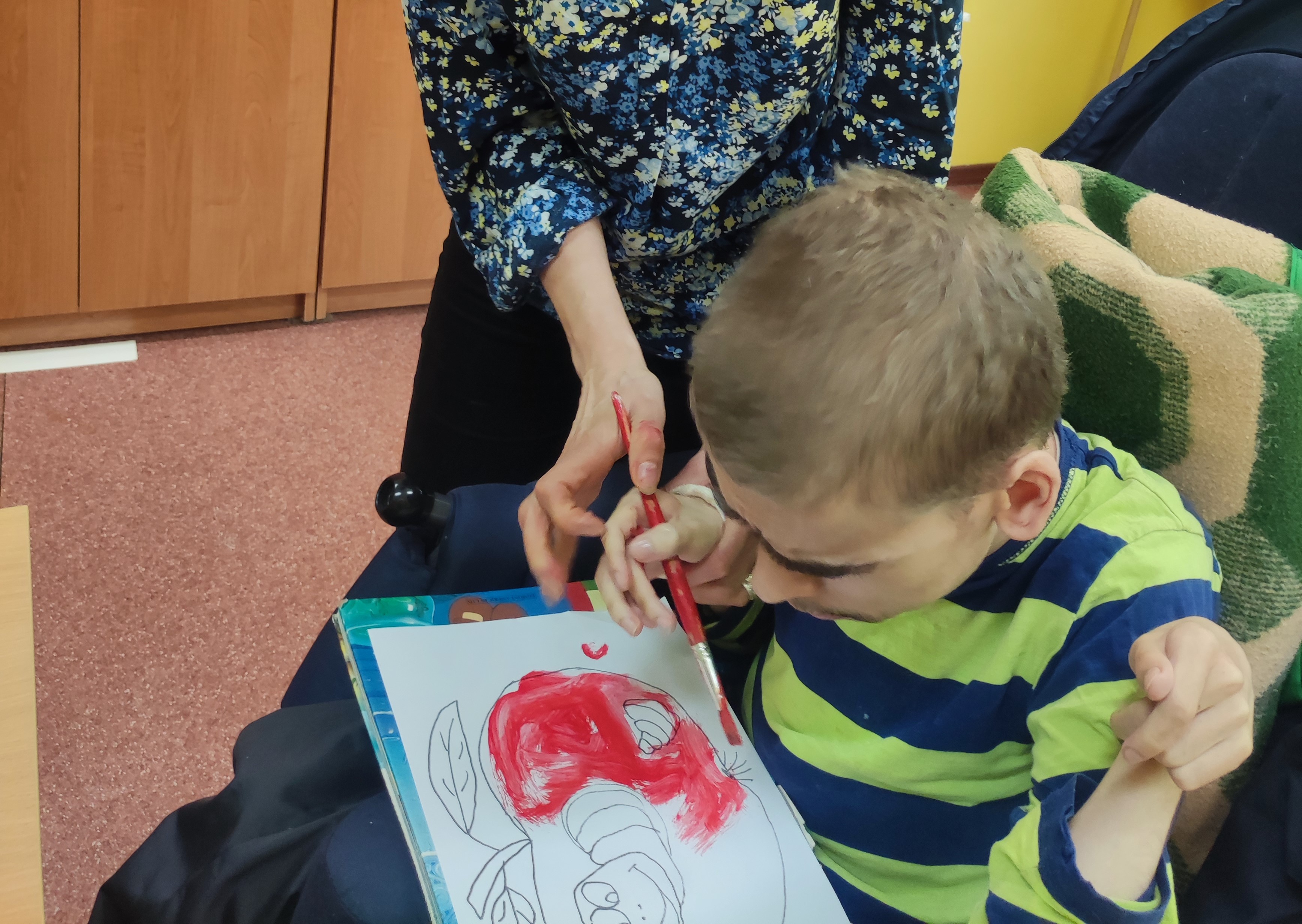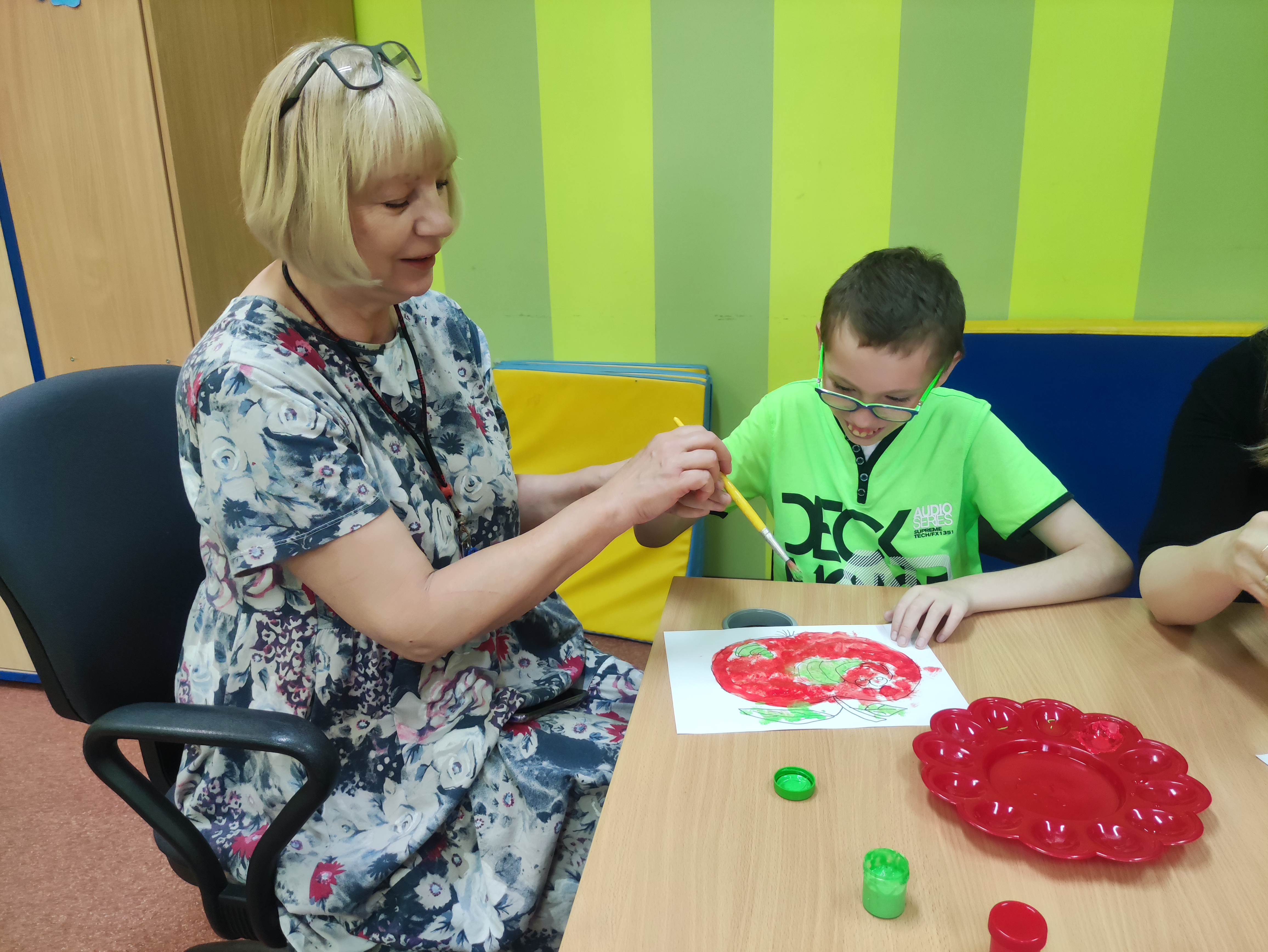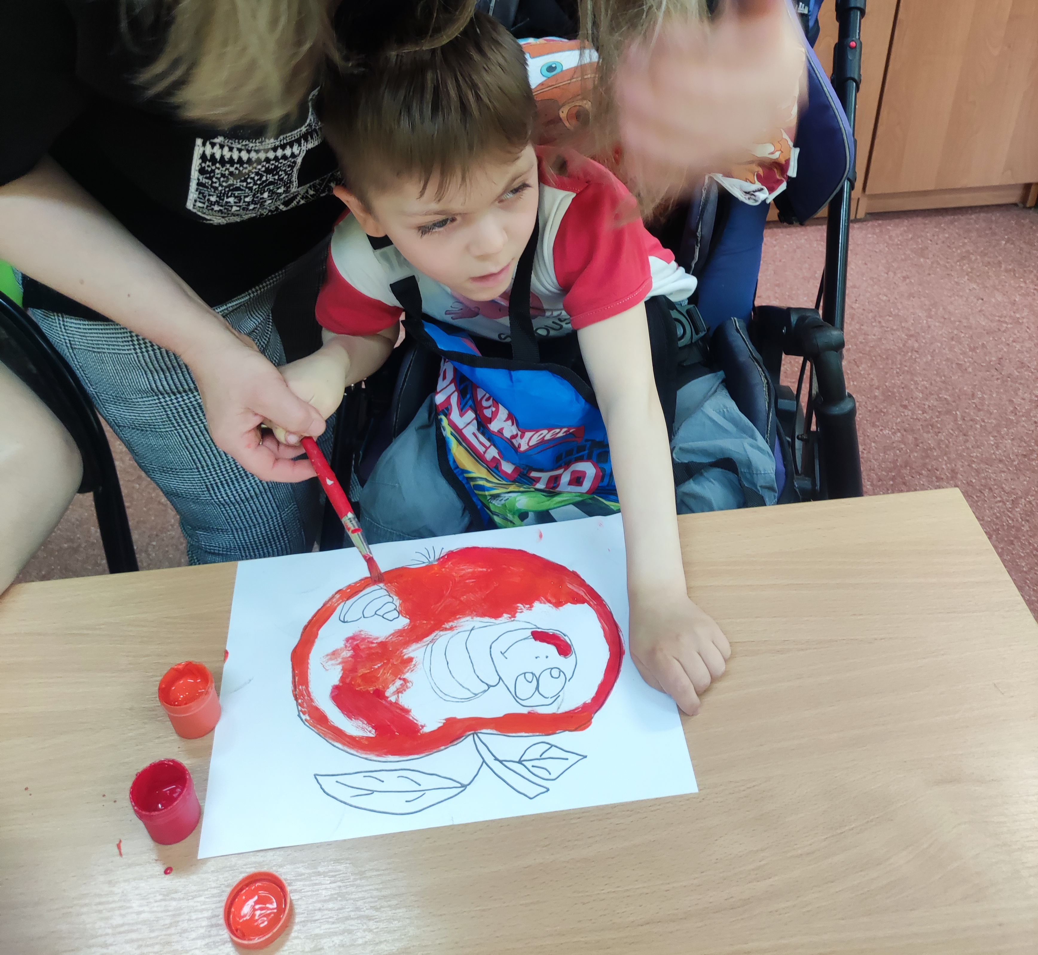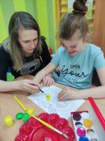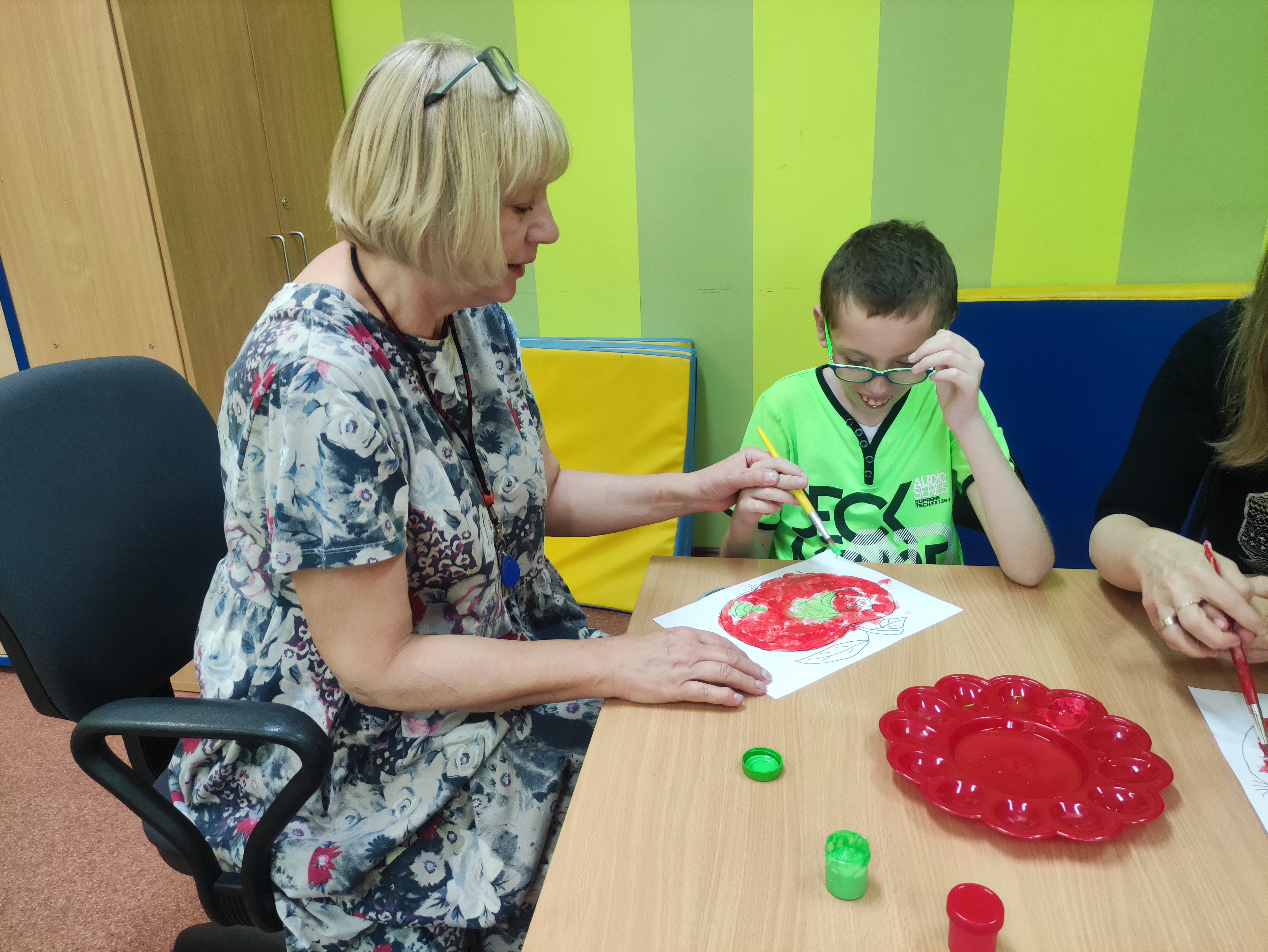 W Zespołach Rewalidacyjno-Wychowawczych gościliśmy Panią Basię z biblioteki, która zaprezentowała przedstawienie wiersza Jana Brzechwy „Entliczek – Pentliczek”. Pani uaktywniła również naszych podopiecznych poprzez zajęcia plastyczne. Malowaliśmy farbami plakatowymi narysowane jabłka z robaczkiem i motylem.