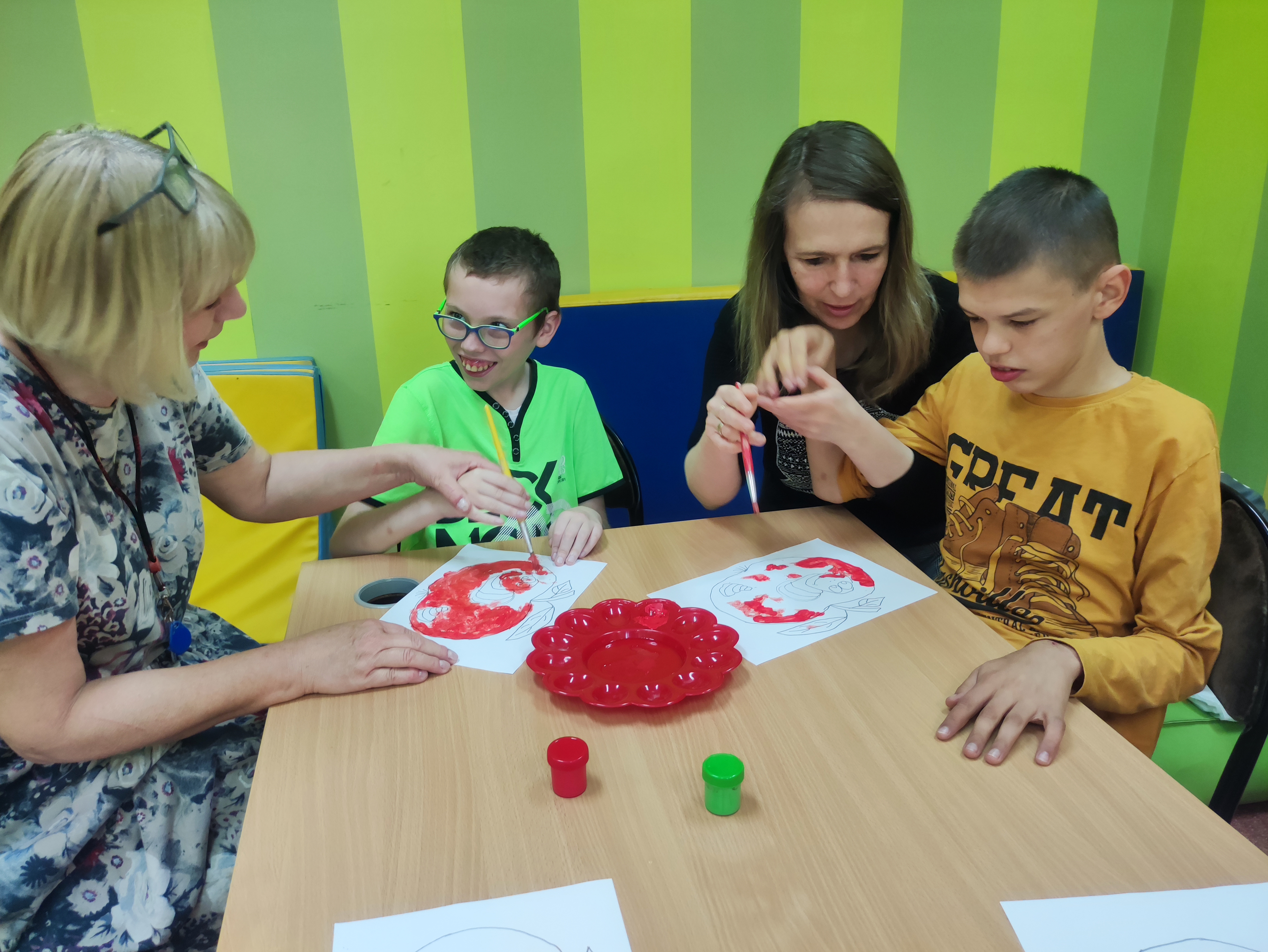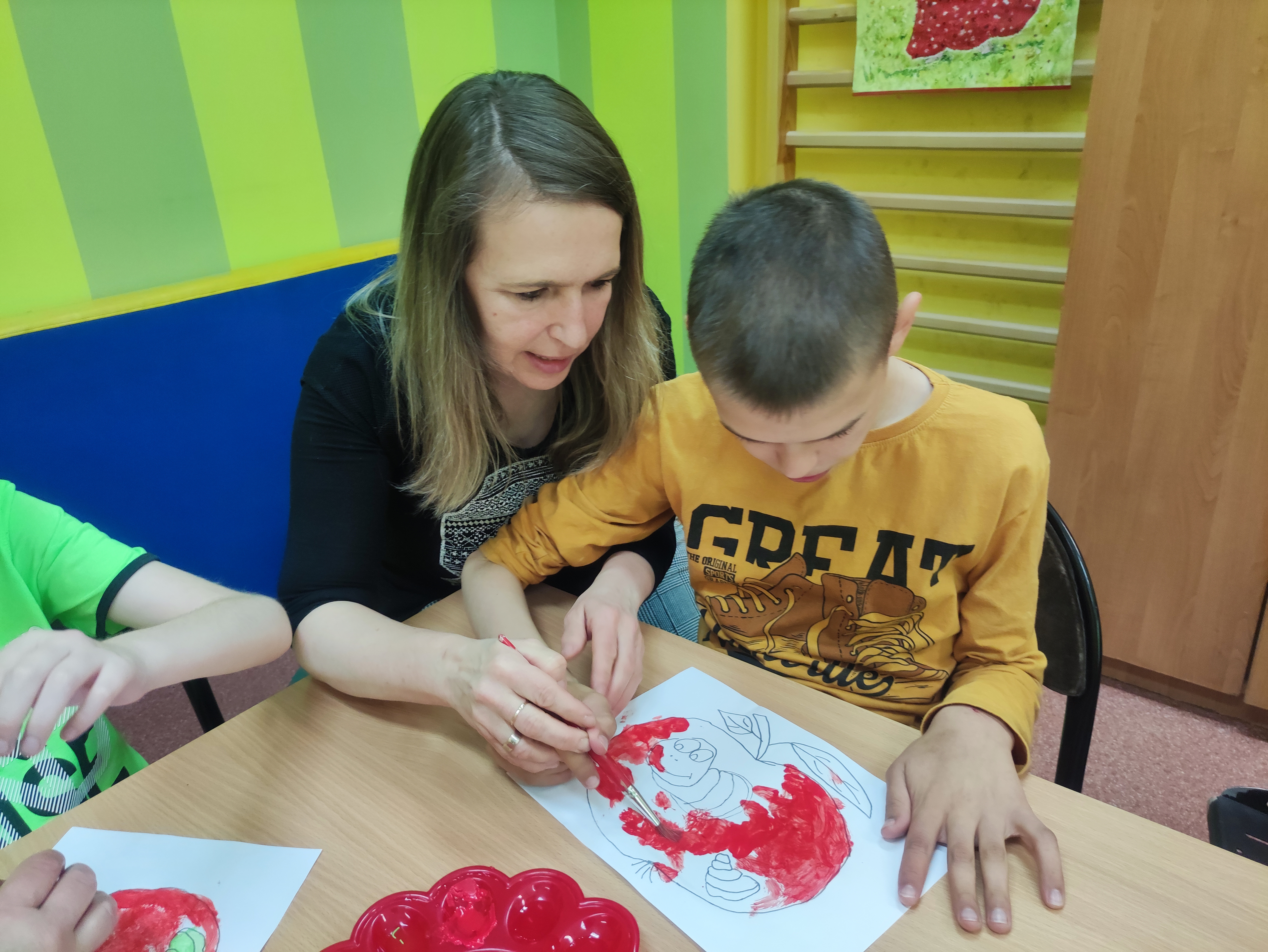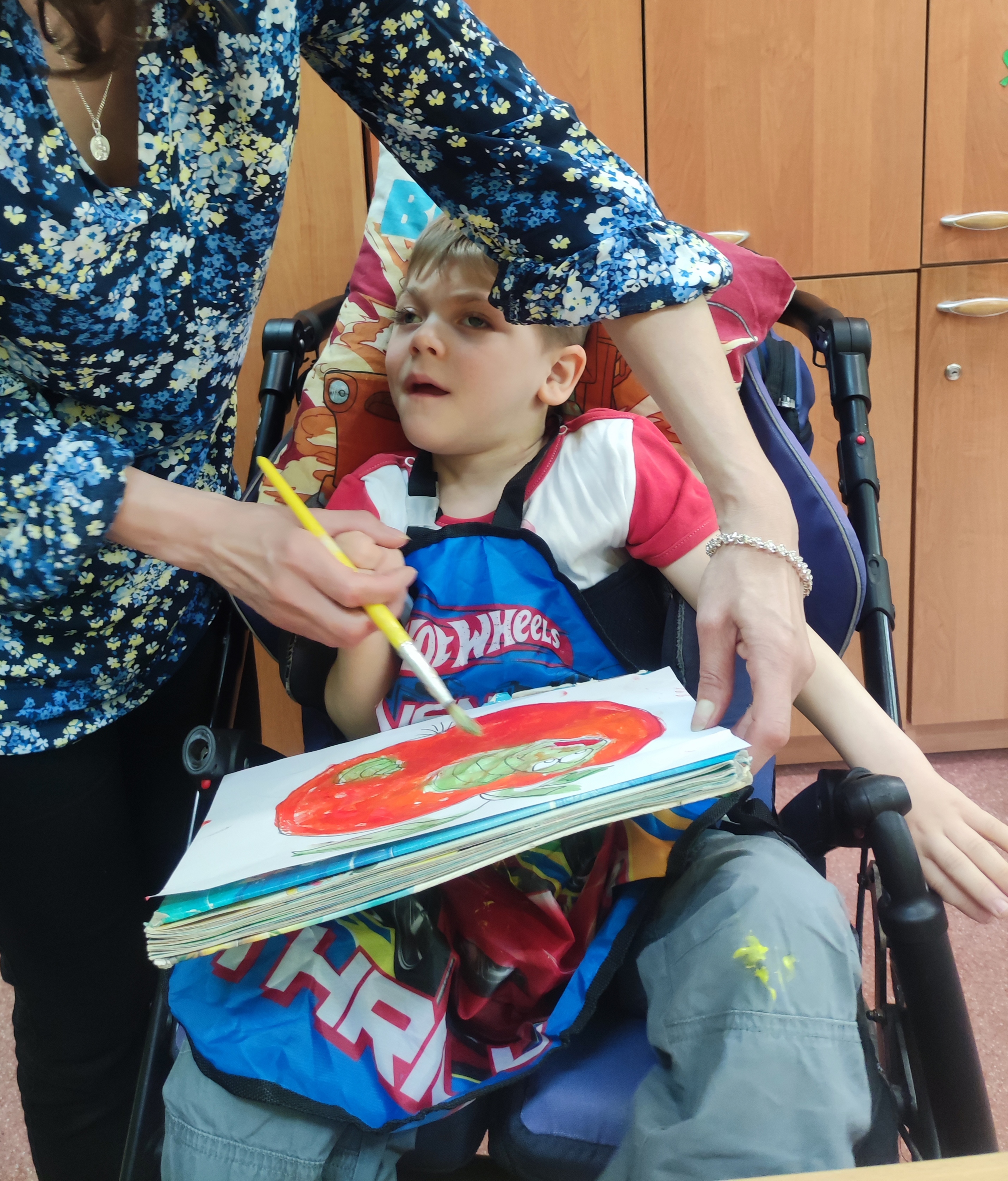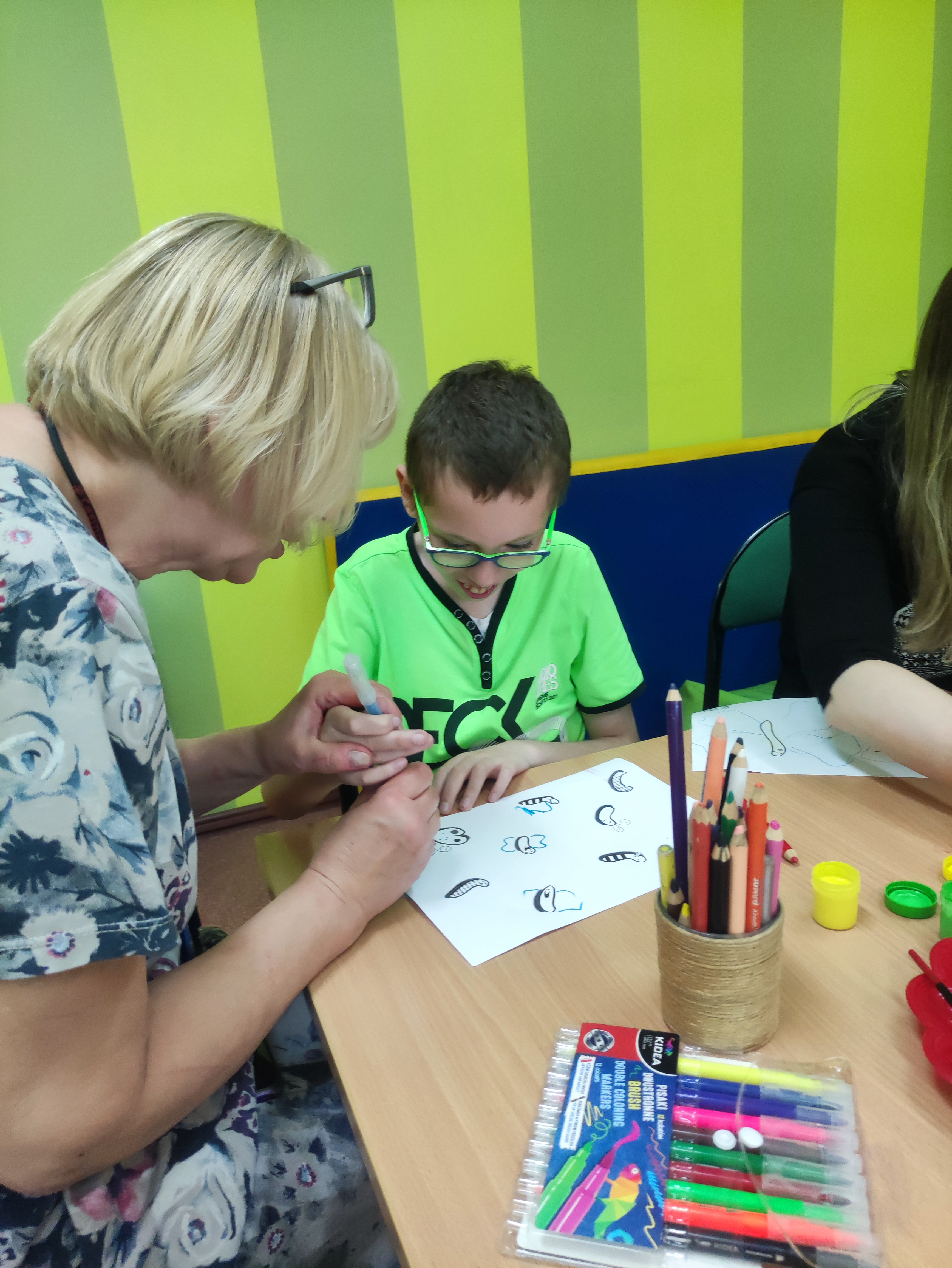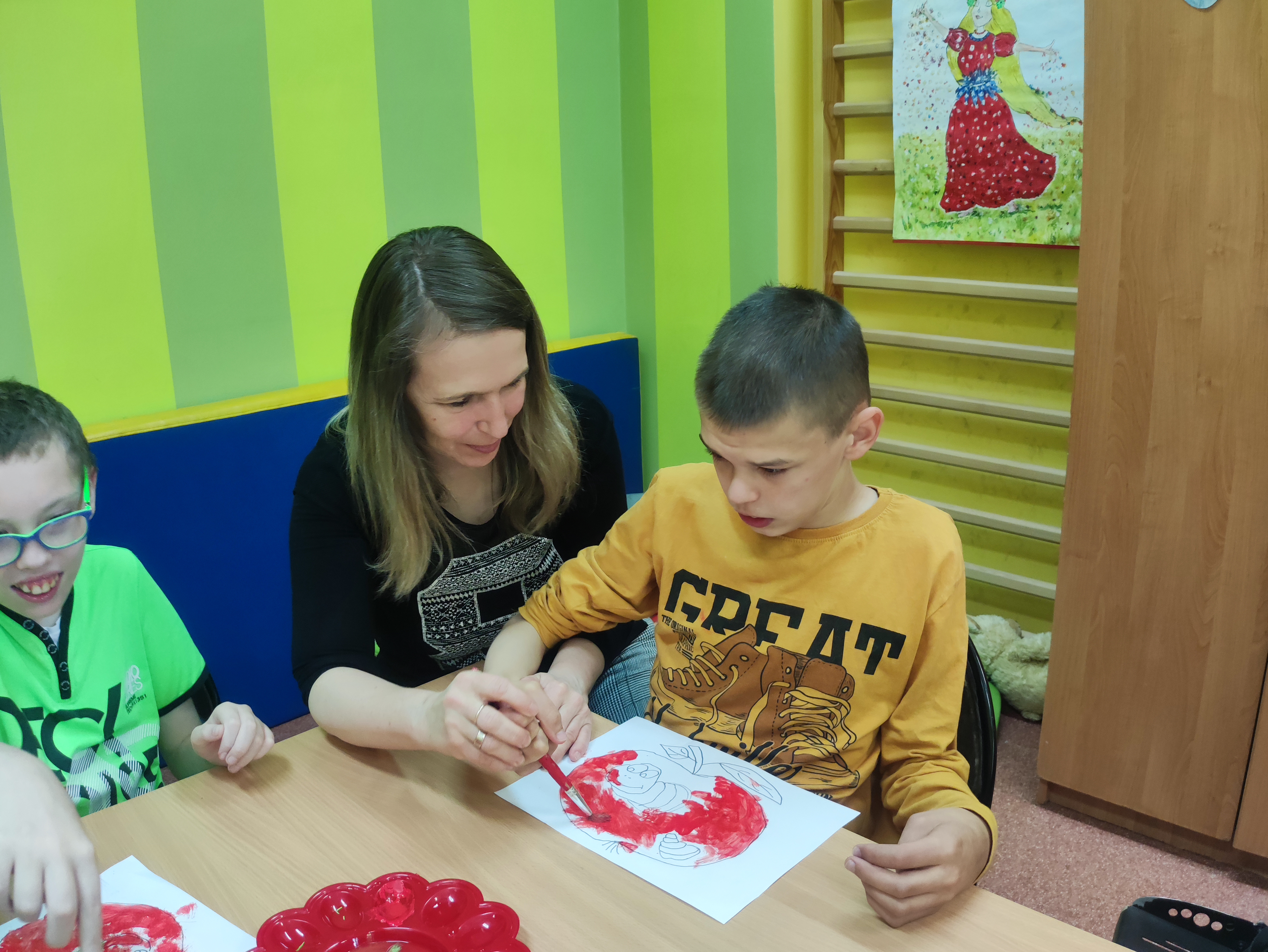 W Zespołach Rewalidacyjno-Wychowawczych gościliśmy Panią Basię z biblioteki, która zaprezentowała przedstawienie wiersza Jana Brzechwy „Entliczek – Pentliczek”. Pani uaktywniła również naszych podopiecznych poprzez zajęcia plastyczne. Malowaliśmy farbami plakatowymi narysowane jabłka z robaczkiem i motylem.