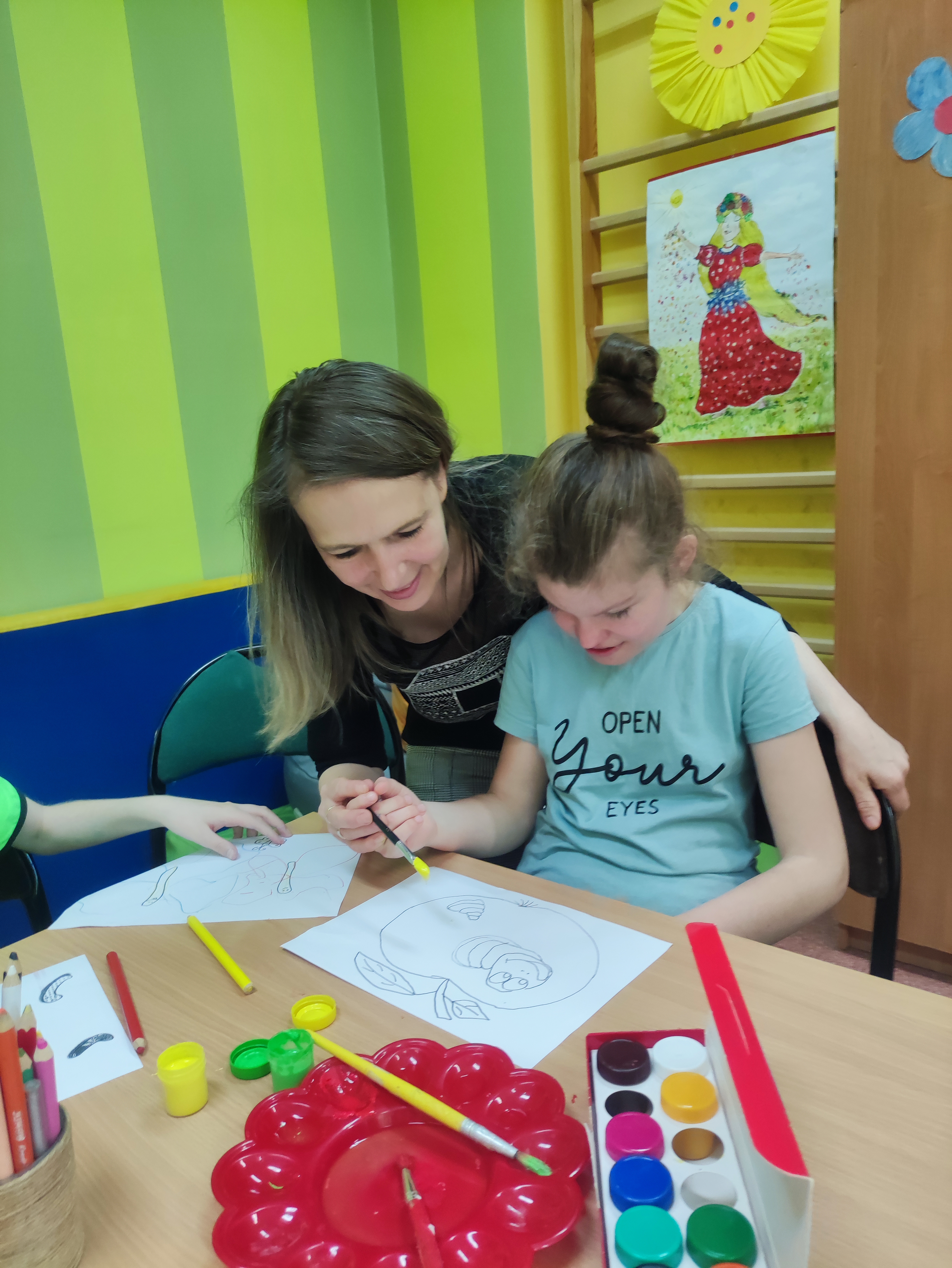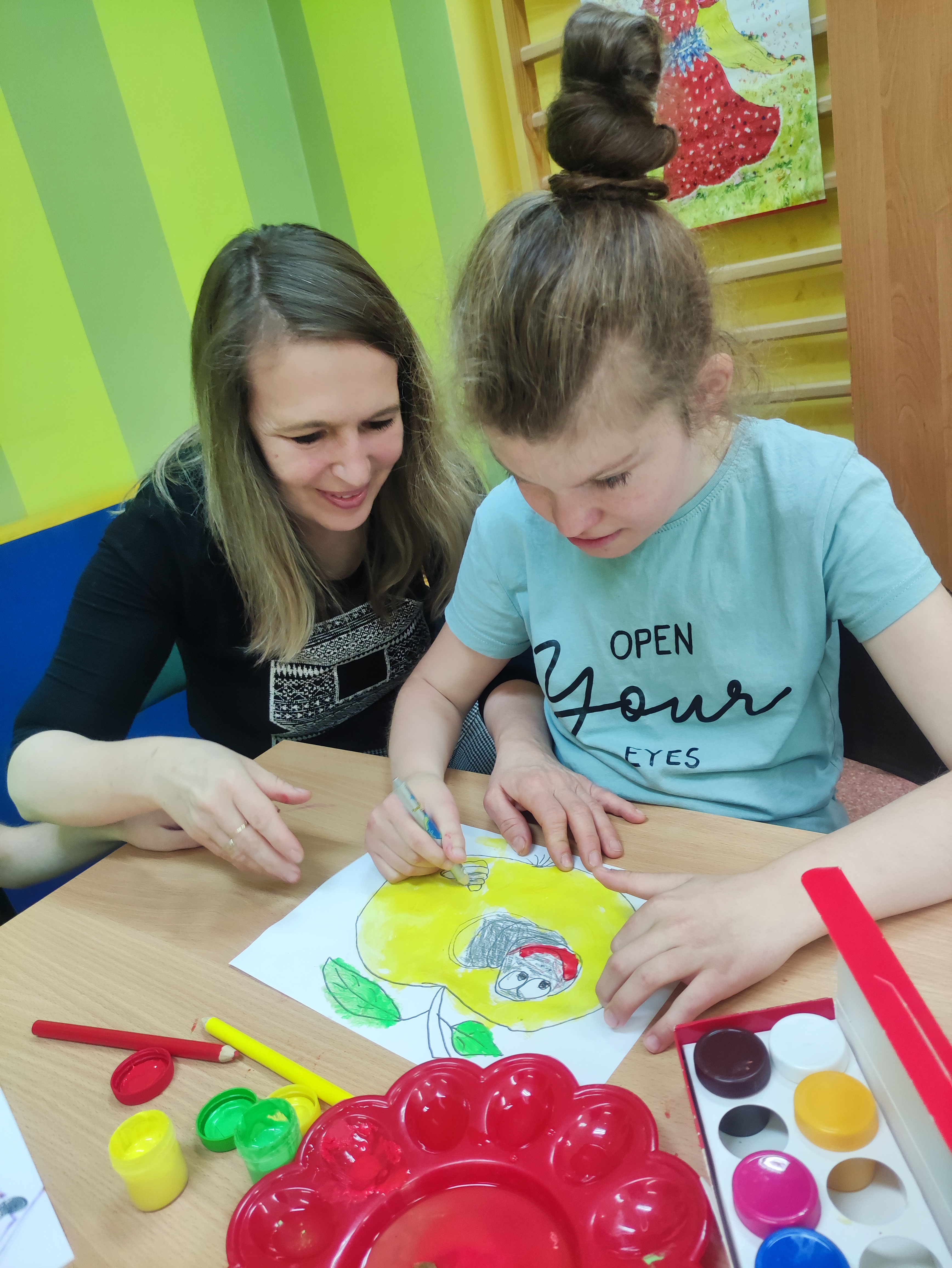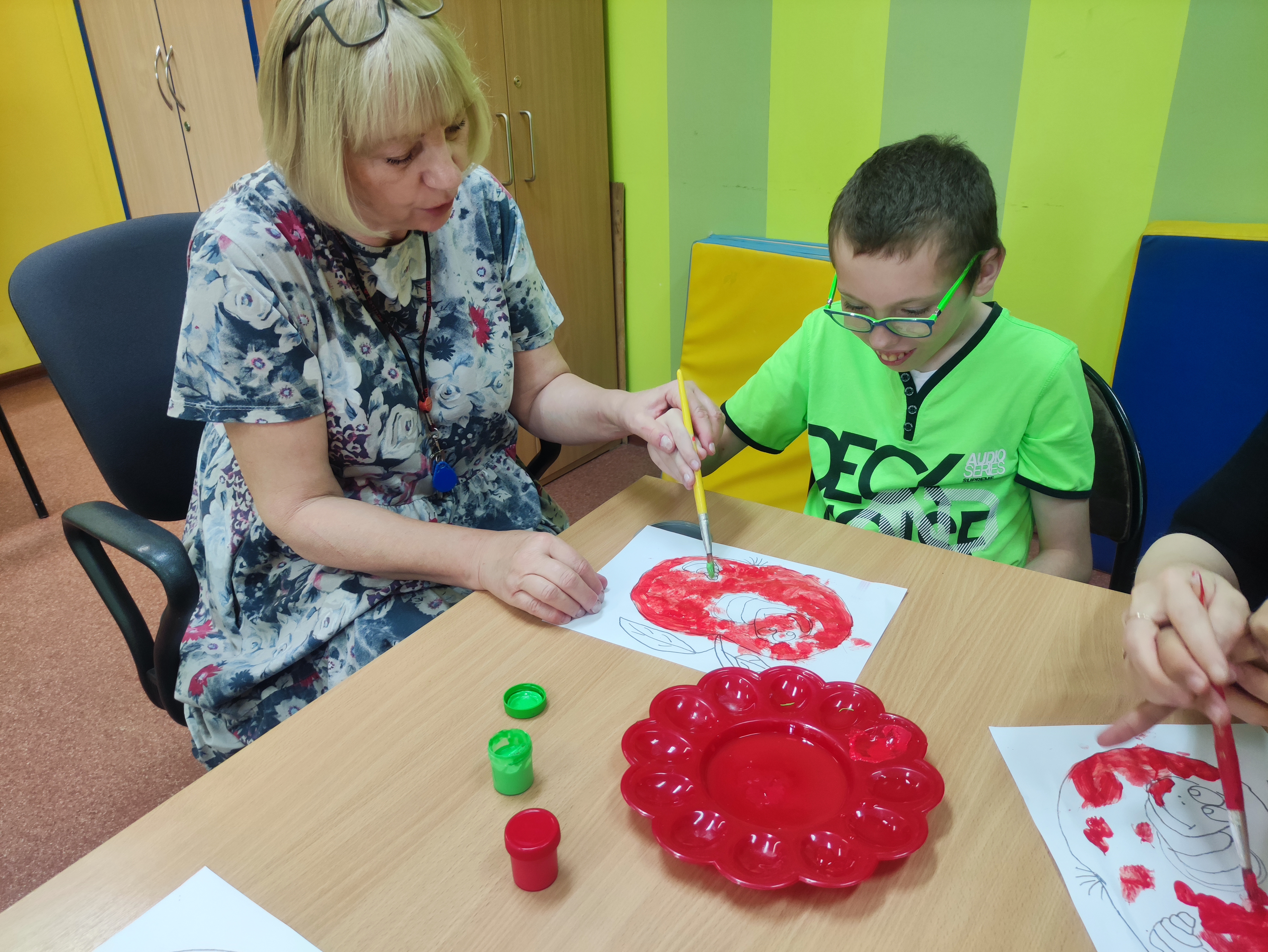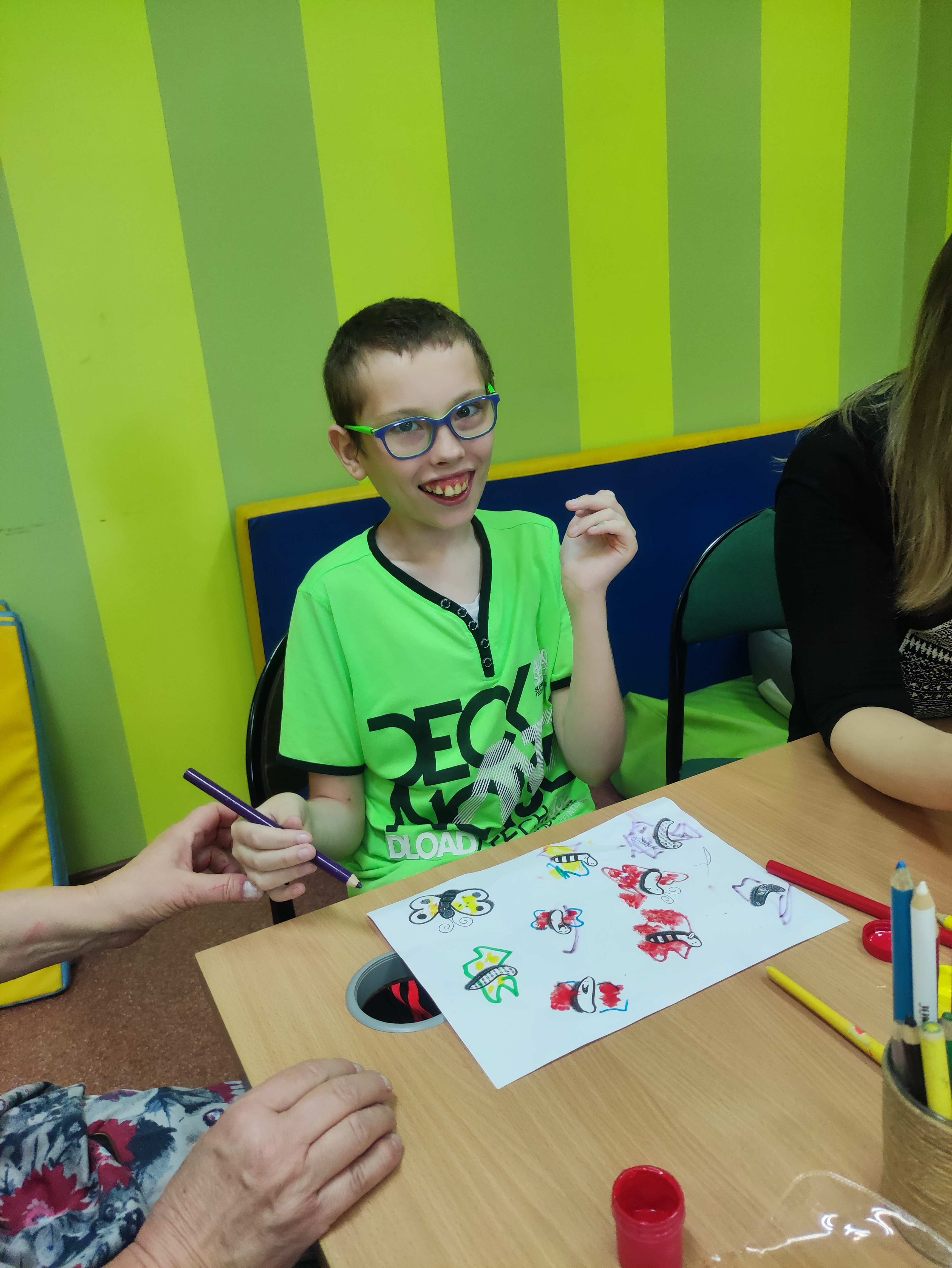 W Zespołach Rewalidacyjno-Wychowawczych gościliśmy Panią Basię z biblioteki, która zaprezentowała przedstawienie wiersza Jana Brzechwy „Entliczek – Pentliczek”. Pani uaktywniła również naszych podopiecznych poprzez zajęcia plastyczne. Malowaliśmy farbami plakatowymi narysowane jabłka z robaczkiem i motylem.
