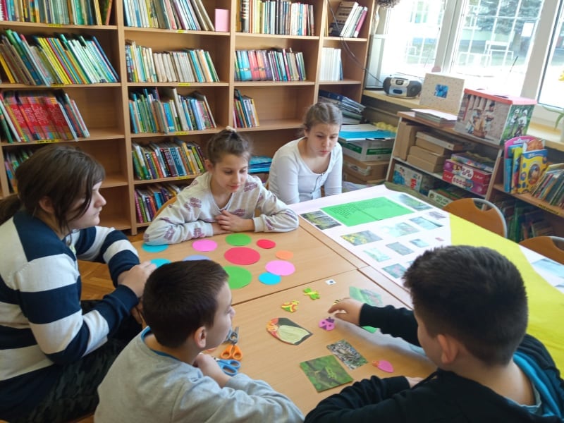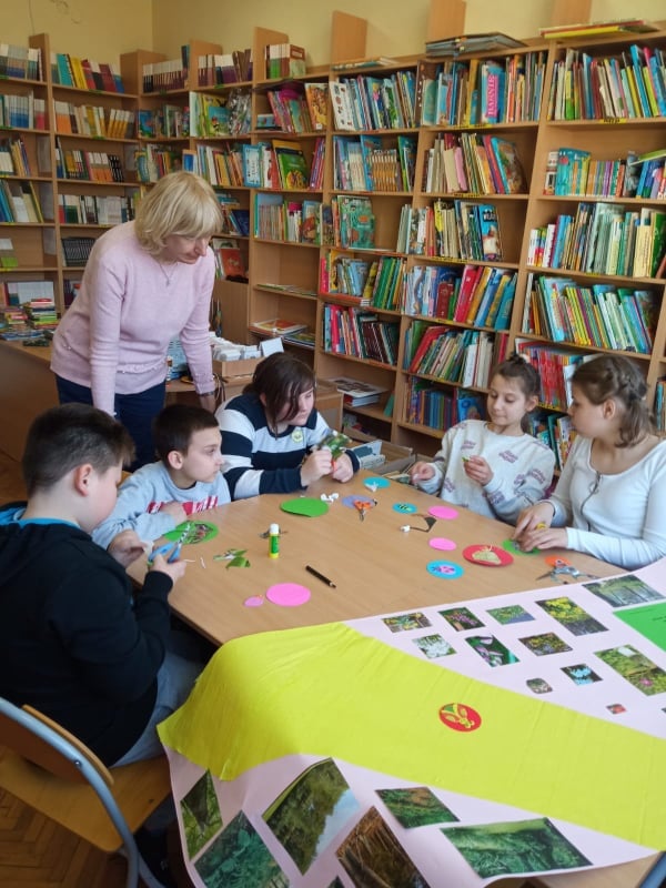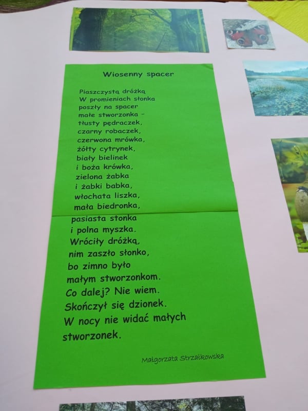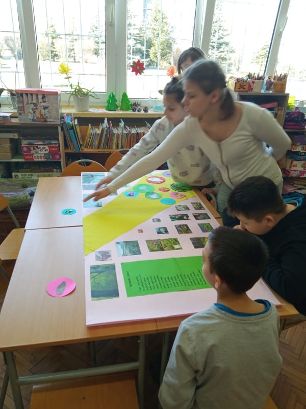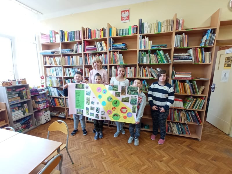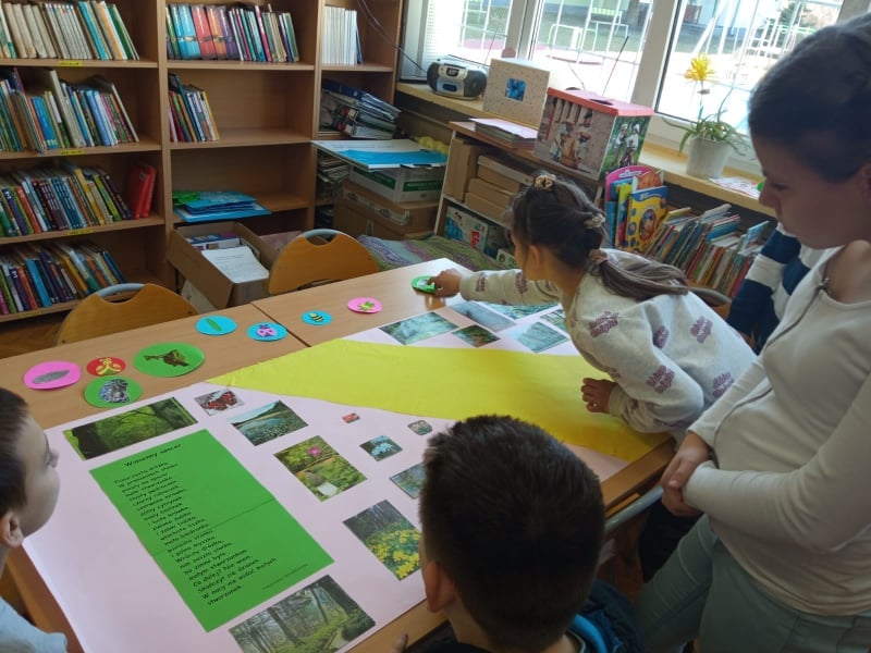 Uczniowie klasy 2-3b na zajęciach bibliotecznych w pierwszym dniu wiosny tropili oznaki wiosny w przyrodzie na podstawie wiersza "Wiosenny spacer". Uwieńczeniem naszych poszukiwań tej pięknej pory roku był plakat.