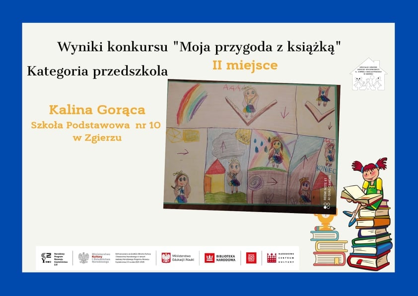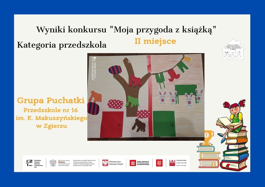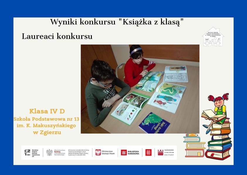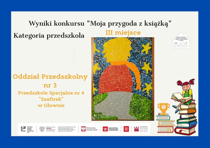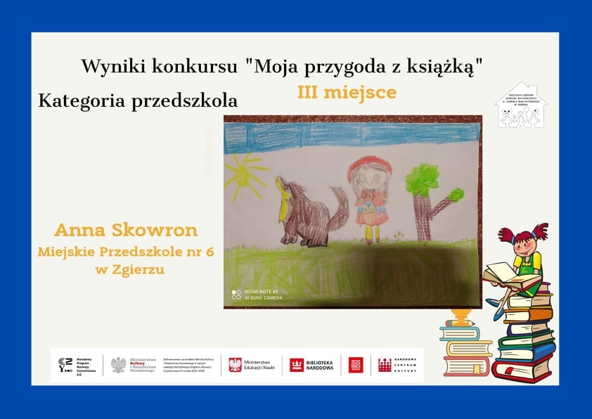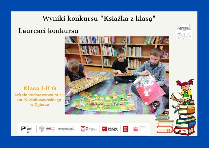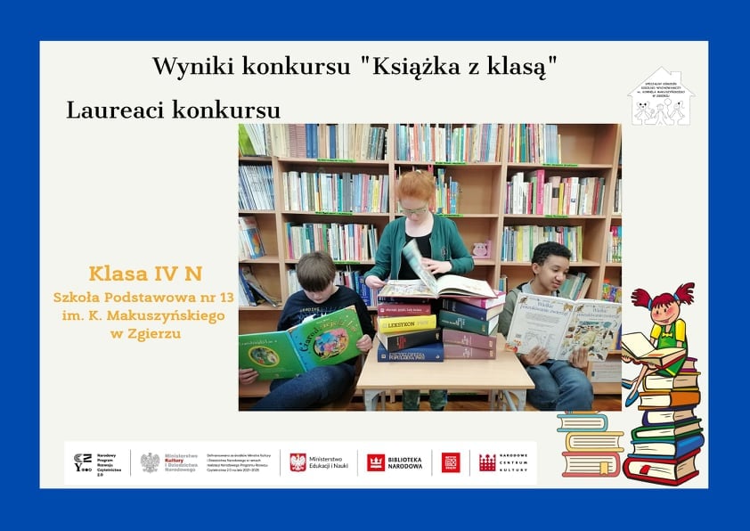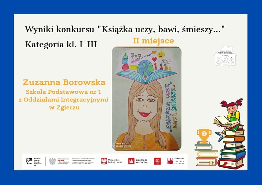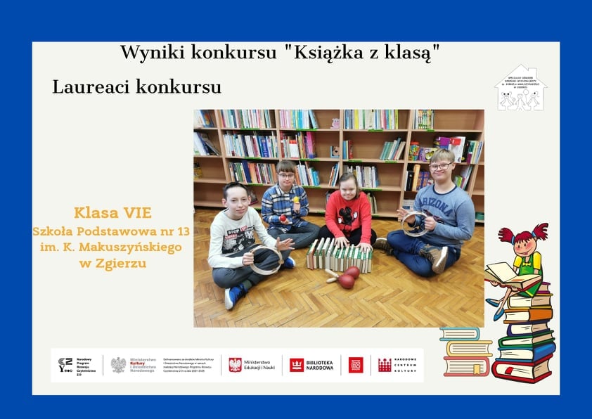 Konkursy: "Książka uczy, bawi, śmieszy", "Moja przygoda z książką", "Klasa z książką" organizowane przez Specjalny Ośrodek Szkolno-Wychowawczy im. K. Makuszyńskiego w Zgierzu w ramach realizacji zadania Narodowy Program Rozwoju Czytelnictwa 2.0 na lata 2021-2025 rozstrzygnięte. Wszystkim uczestnikom dziękujemy za udział. Laureatom gratulujemy!