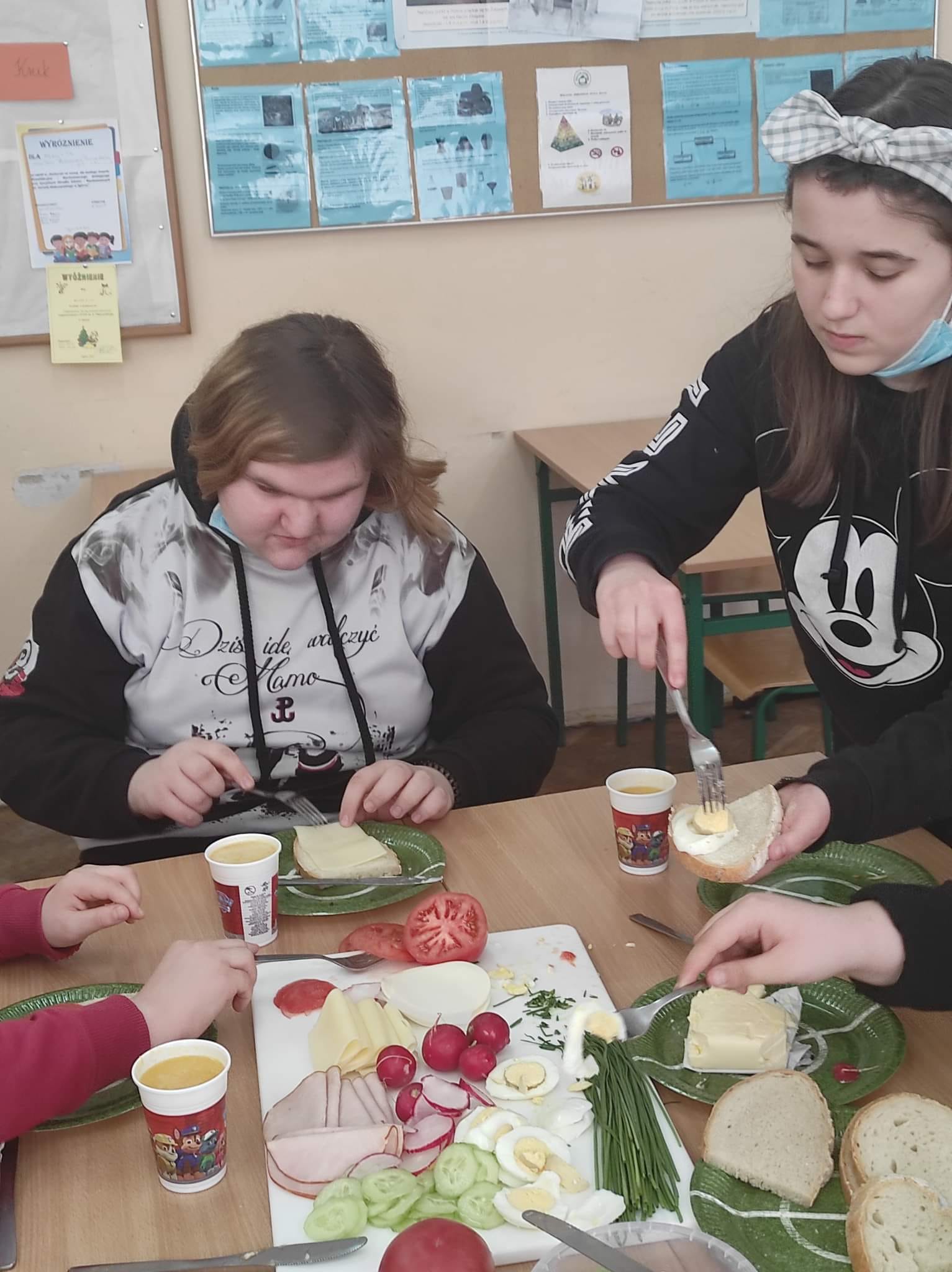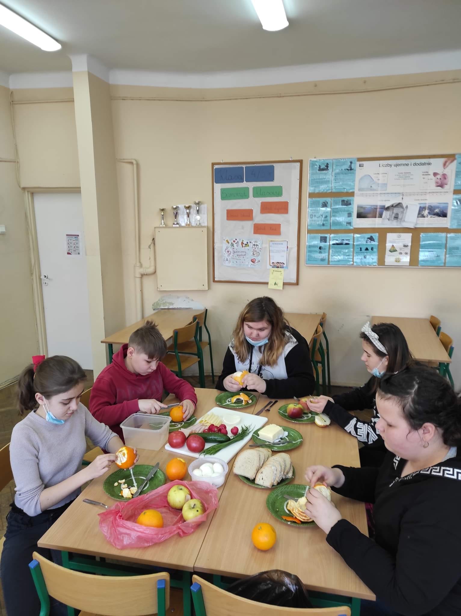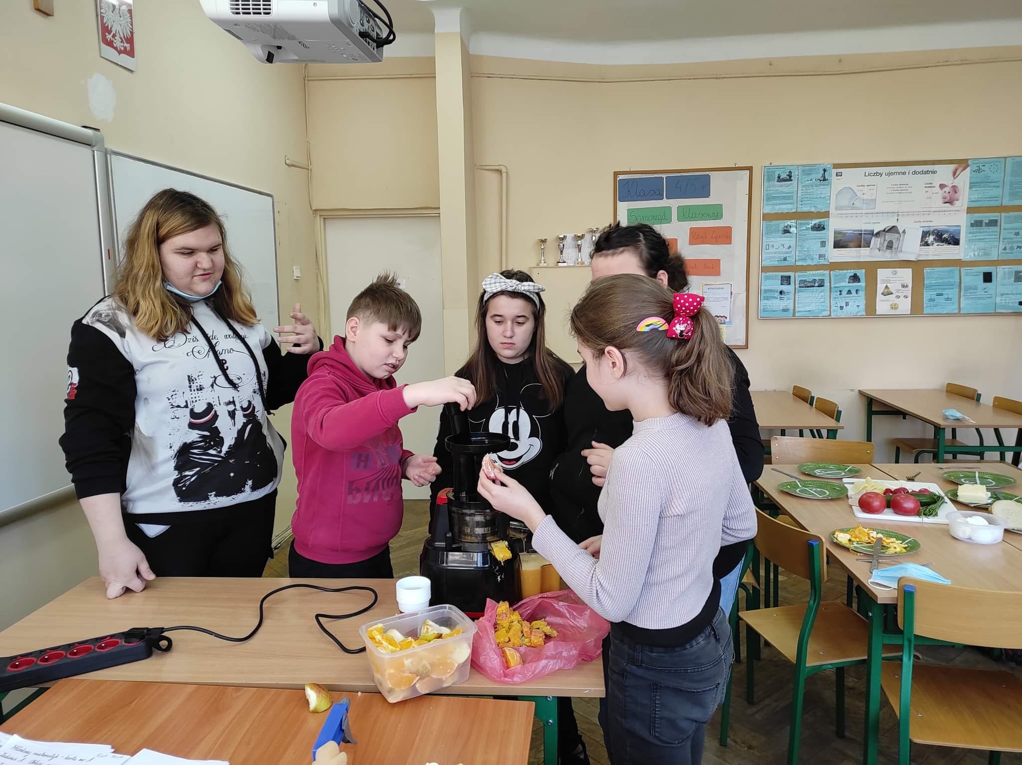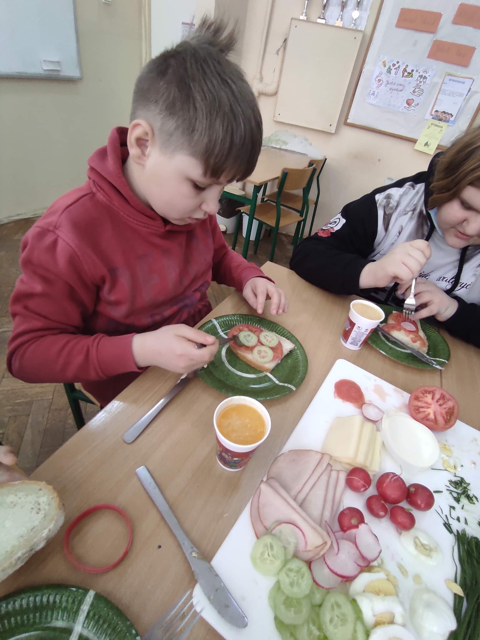 Uczniowie klas IV – V Szkoły Podstawowej kolejny raz zrealizowali zadanie w ramach Ogólnopolskiego Projektu Edukacyjnego "Uczymy się i bawimy". Tym razem uczestniczyli w zajęciach na temat "Wiem, co jem", których celem było zwiększenie świadomości na temat zasad prawidłowego odżywiania się. Uczniowie samodzielnie przygotowali kolorowe i pomysłowe kanapki oraz świeżo wyciśnięty sok owocowy.