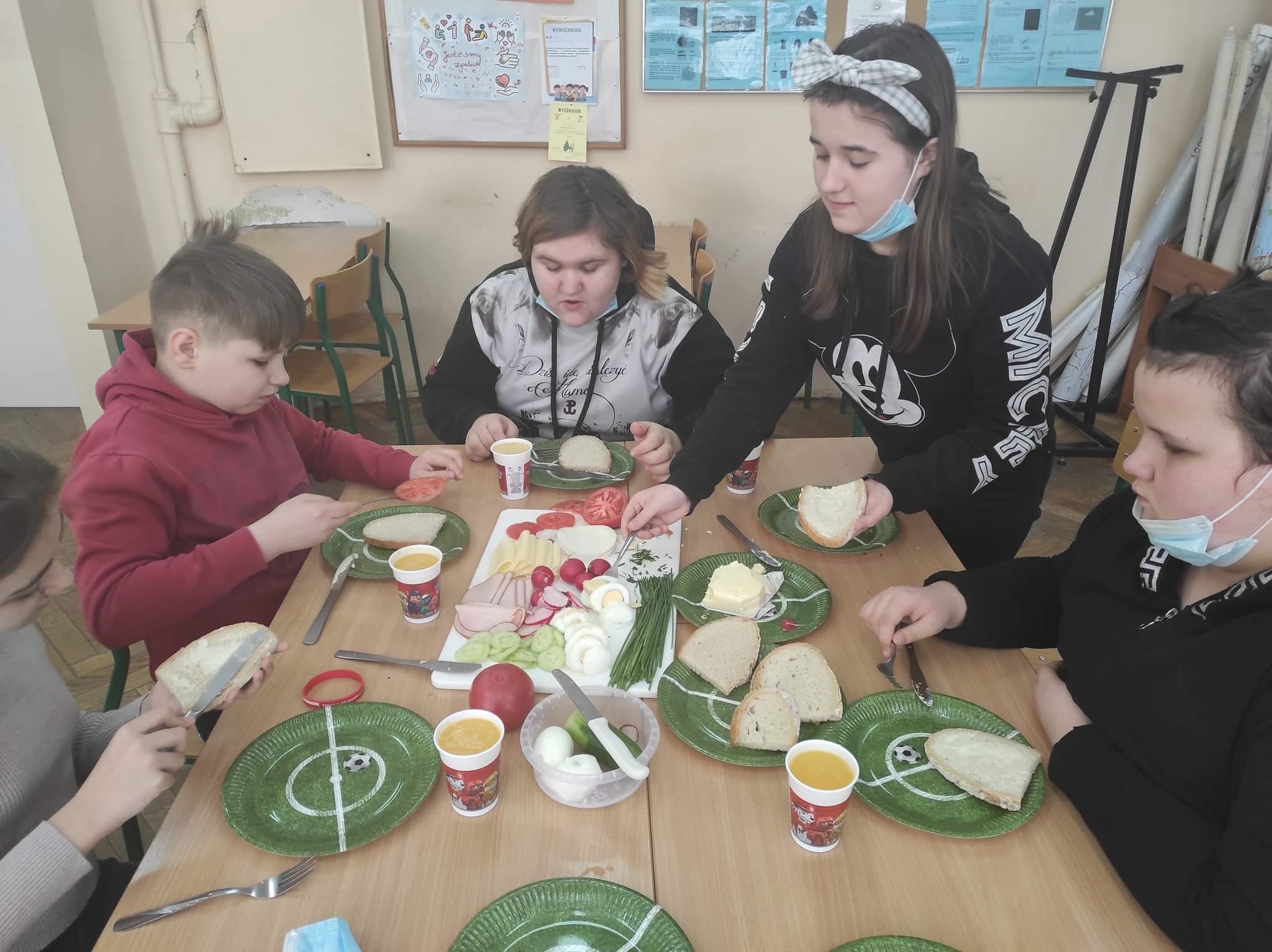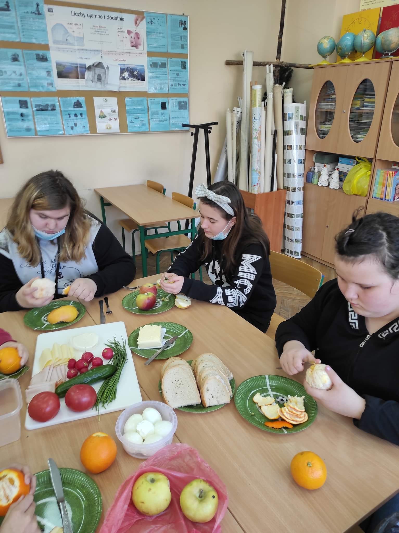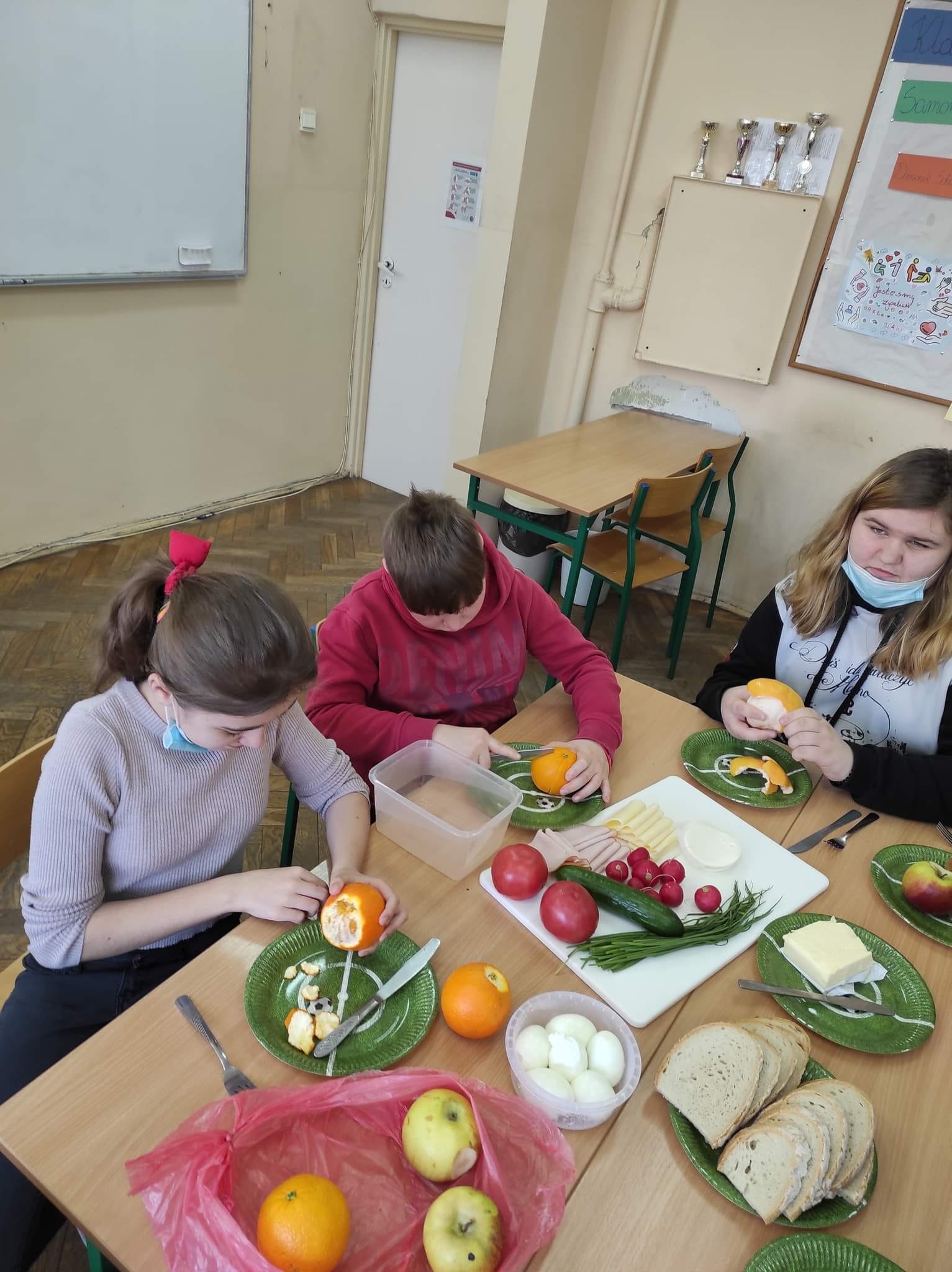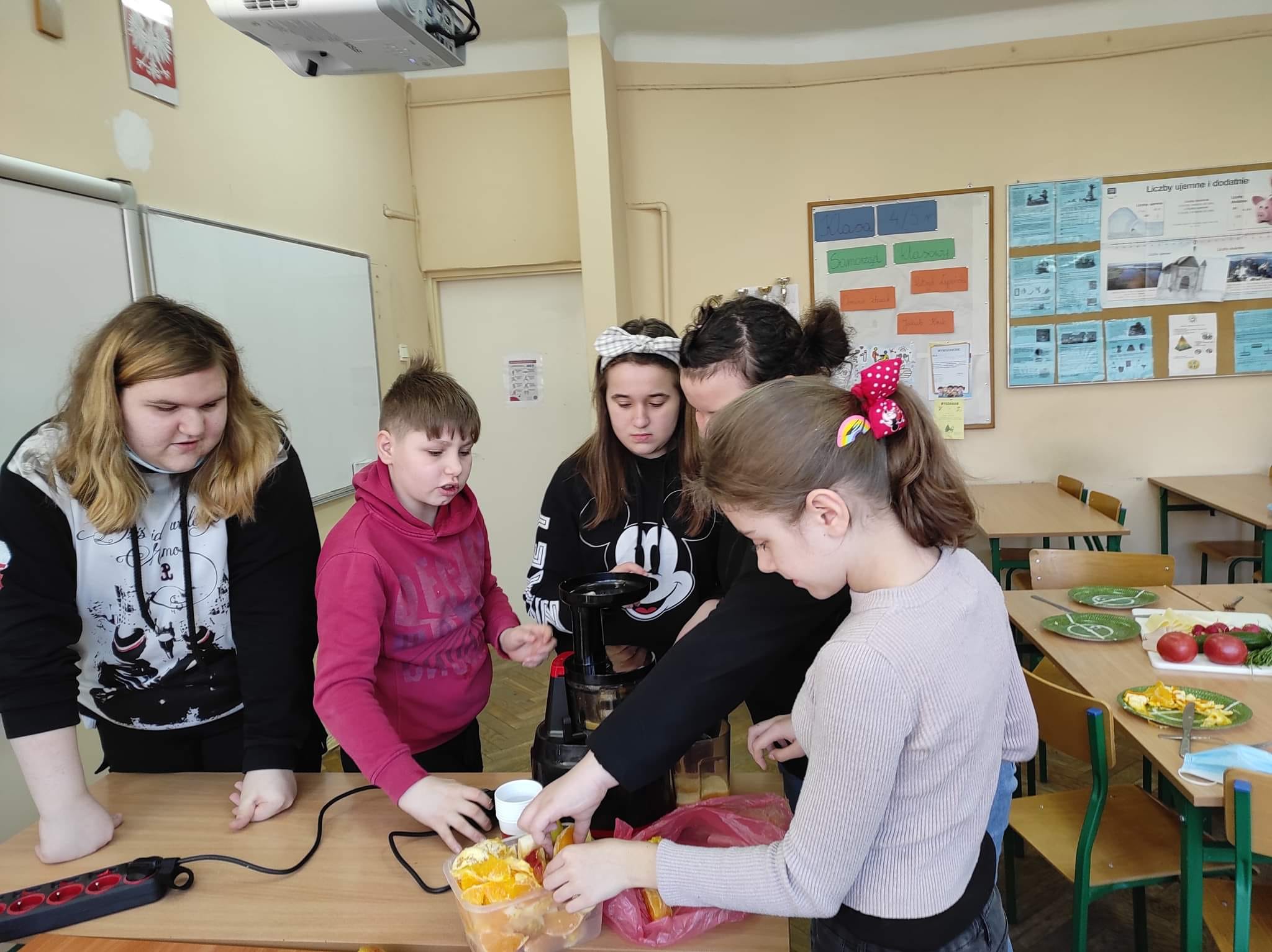 Uczniowie klas IV – V Szkoły Podstawowej kolejny raz zrealizowali zadanie w ramach Ogólnopolskiego Projektu Edukacyjnego "Uczymy się i bawimy". Tym razem uczestniczyli w zajęciach na temat "Wiem, co jem", których celem było zwiększenie świadomości na temat zasad prawidłowego odżywiania się. Uczniowie samodzielnie przygotowali kolorowe i pomysłowe kanapki oraz świeżo wyciśnięty sok owocowy.
