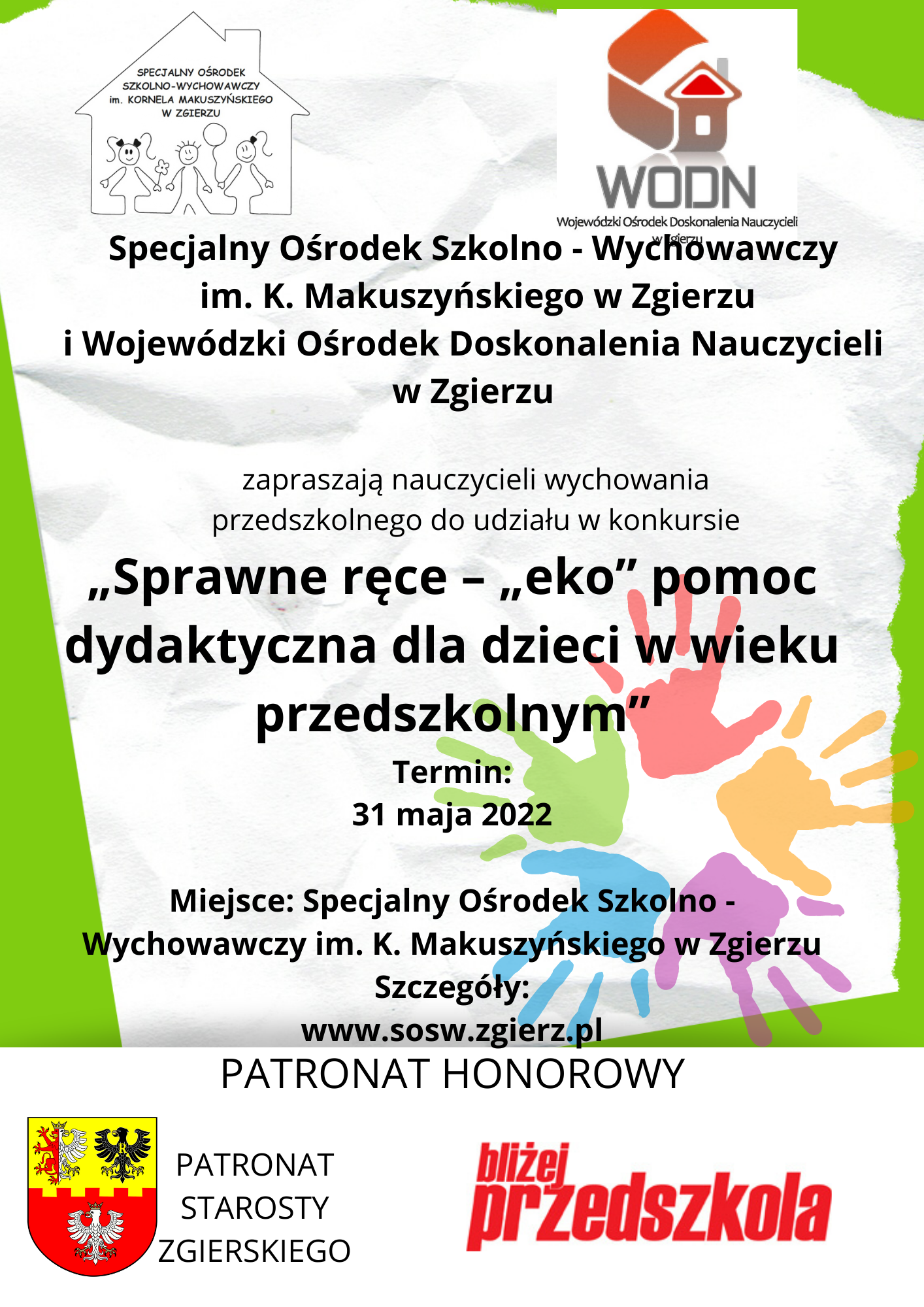 Specjalny Ośrodek Szkolno – Wychowawczy im. Kornela Makuszyńskiego w Zgierzu i Wojewódzki Ośrodek Doskonalenia Nauczycieli w Zgierzu serdecznie zapraszają nauczycieli wychowania przedszkolnego z powiatu zgierskiego do udziału w konkursie.