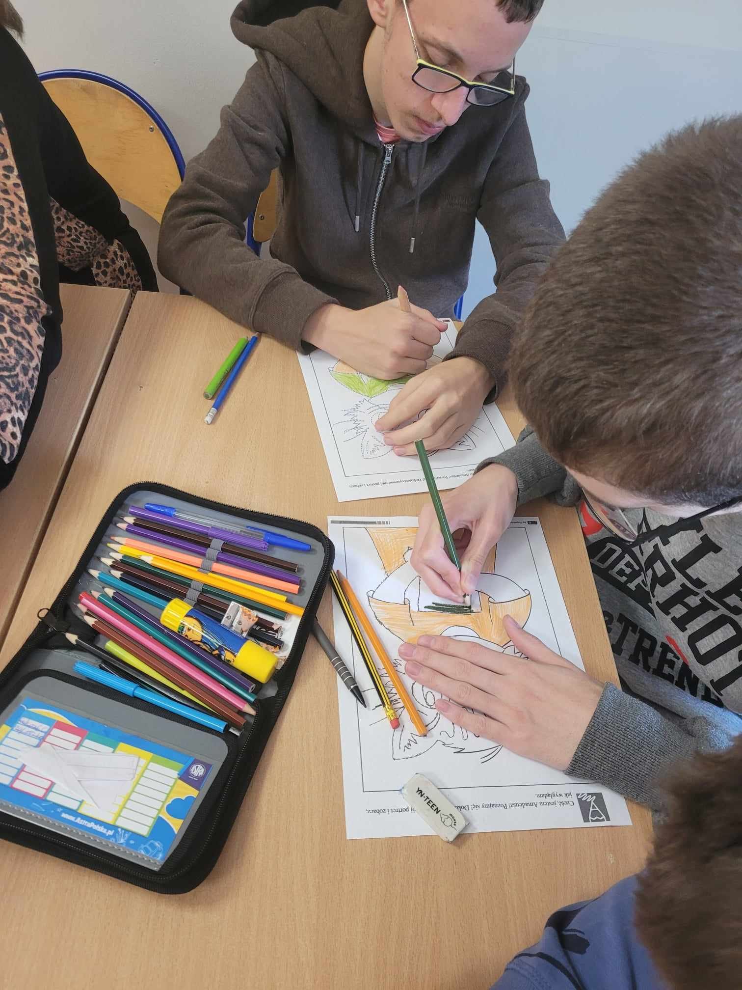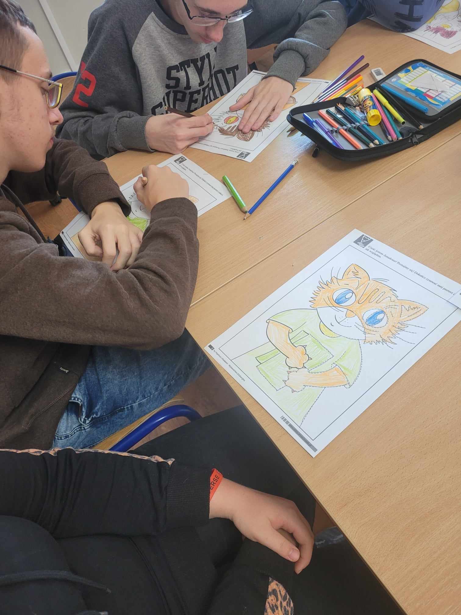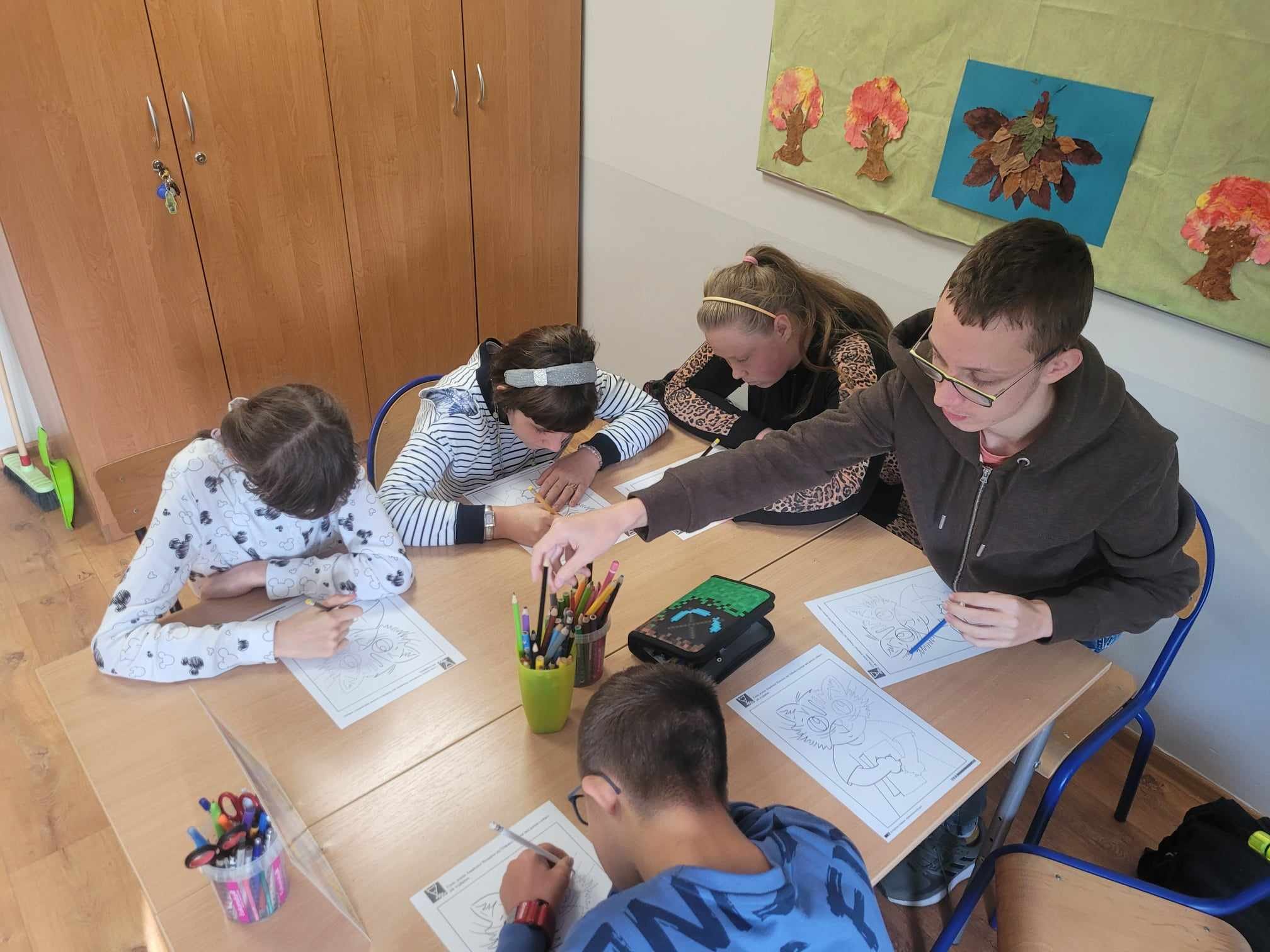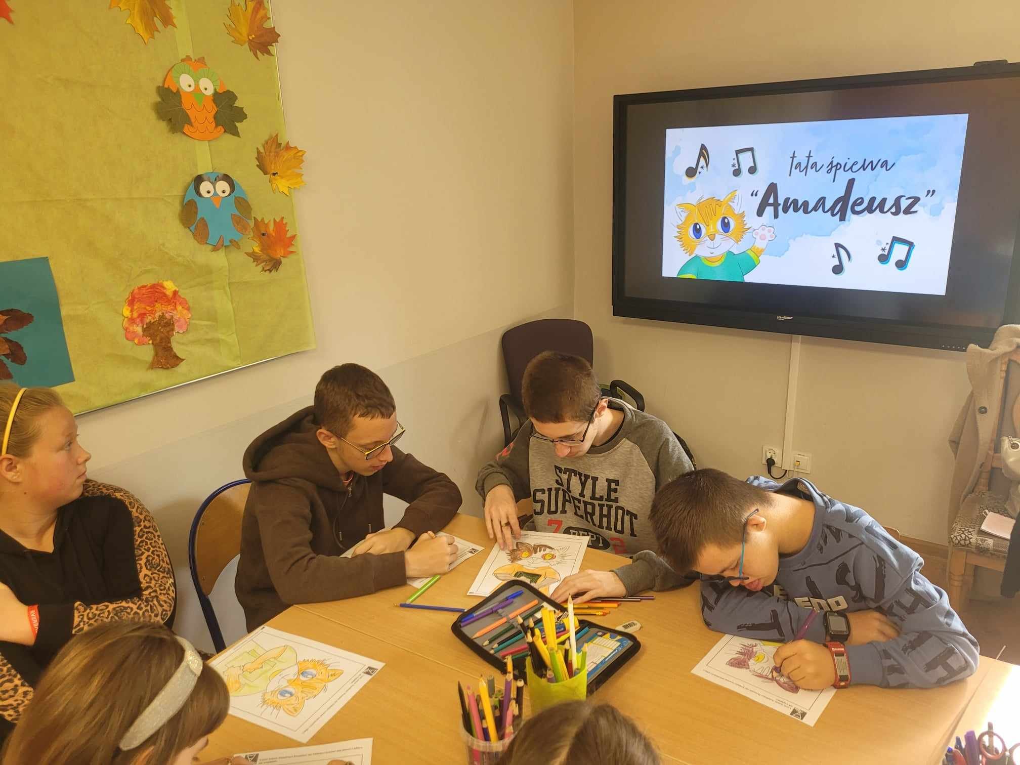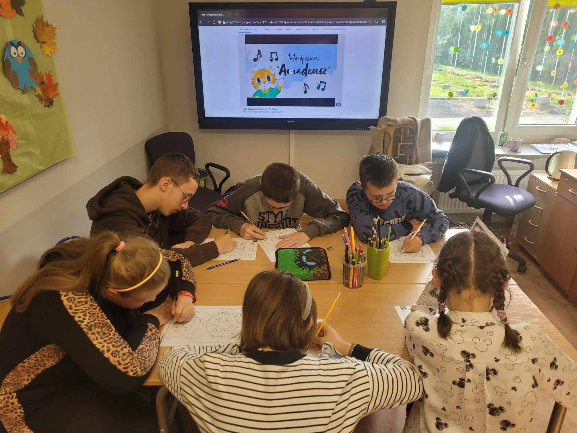 Uczniowie klas 4k i 6d zapoznali się z kotem Amadeuszem bohaterem projektu edukacyjnego "Z kotem Amadeuszem przez świat uczuć i emocji". Na zajęciach wysłuchali autoprezentacji kota, stworzyli jego portret oraz uczyli się śpiewać piosenkę o kocie. Już nie mogą doczekać się następnego spotkania z głównym bohaterem.