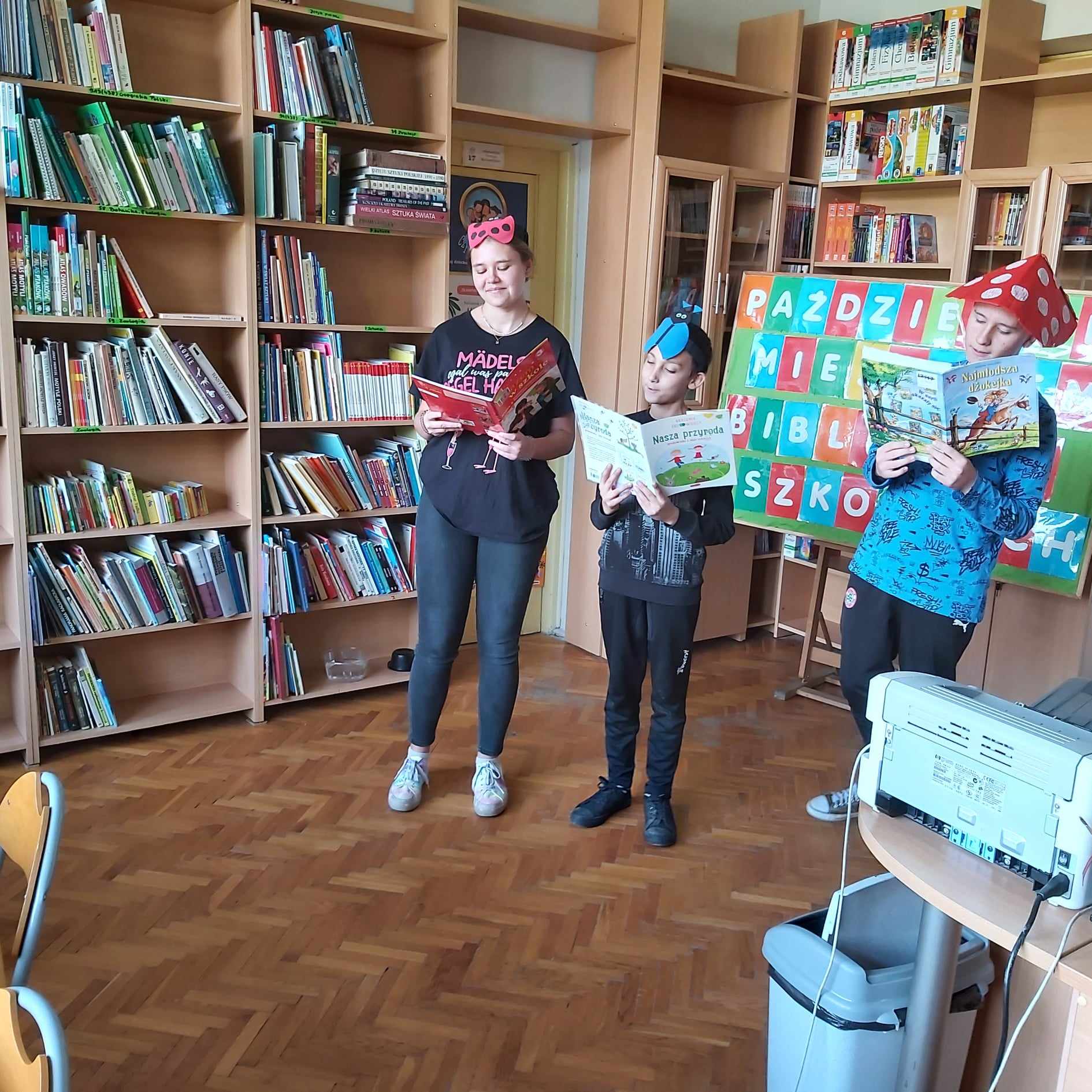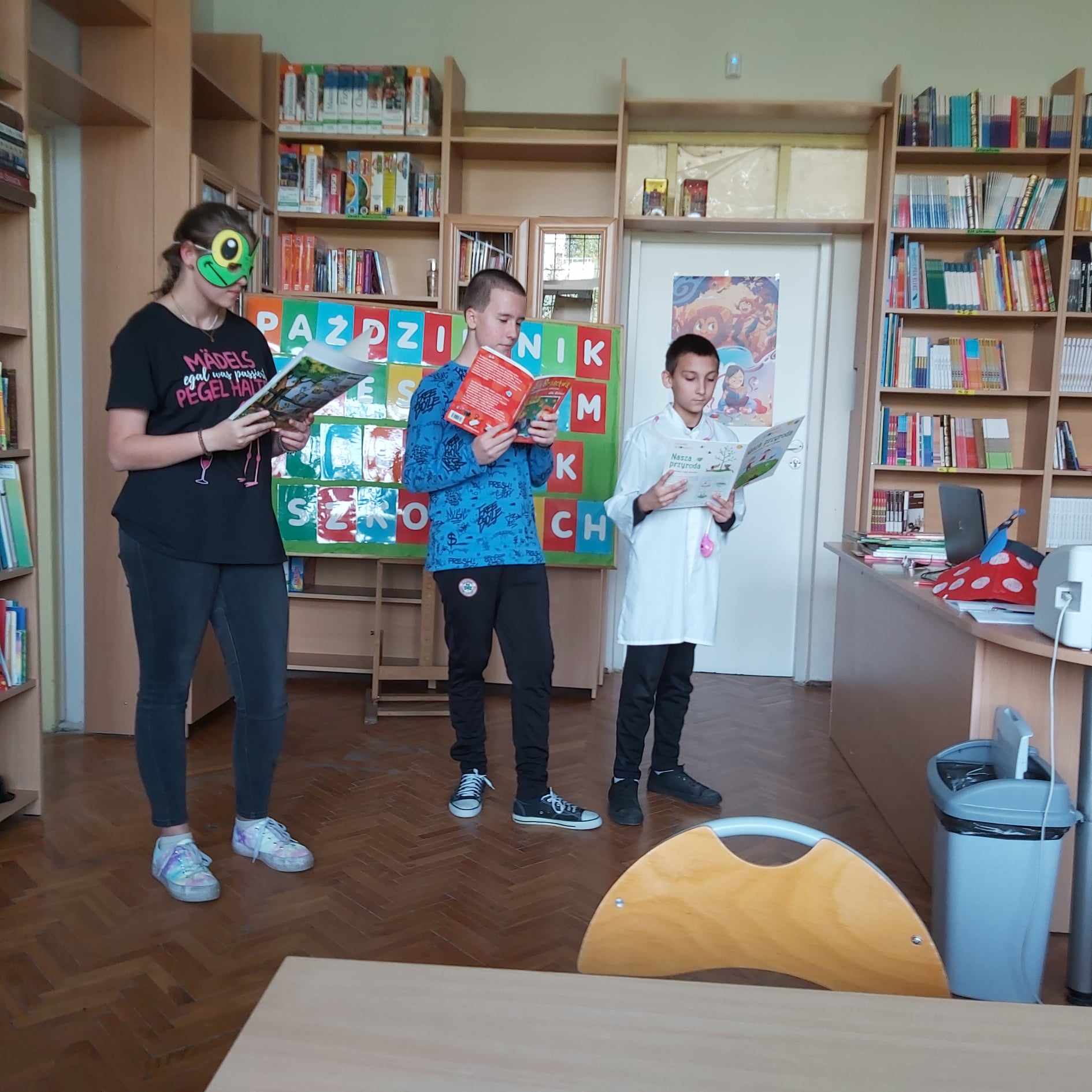 Natomiast Misie uczestniczyły w zajęciach zorganizowanych przez bibliotekę szkolną z okazji Dnia Głośnego Czytania: wysłuchały inscenizowanego wiersza czytanego przez starszych kolegów, wykonały pracę plastyczną i zapoznały się z księgozbiorem biblioteki.