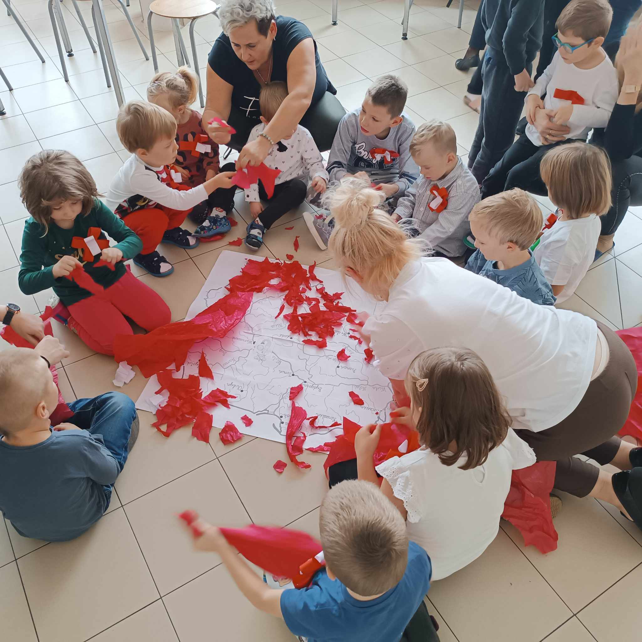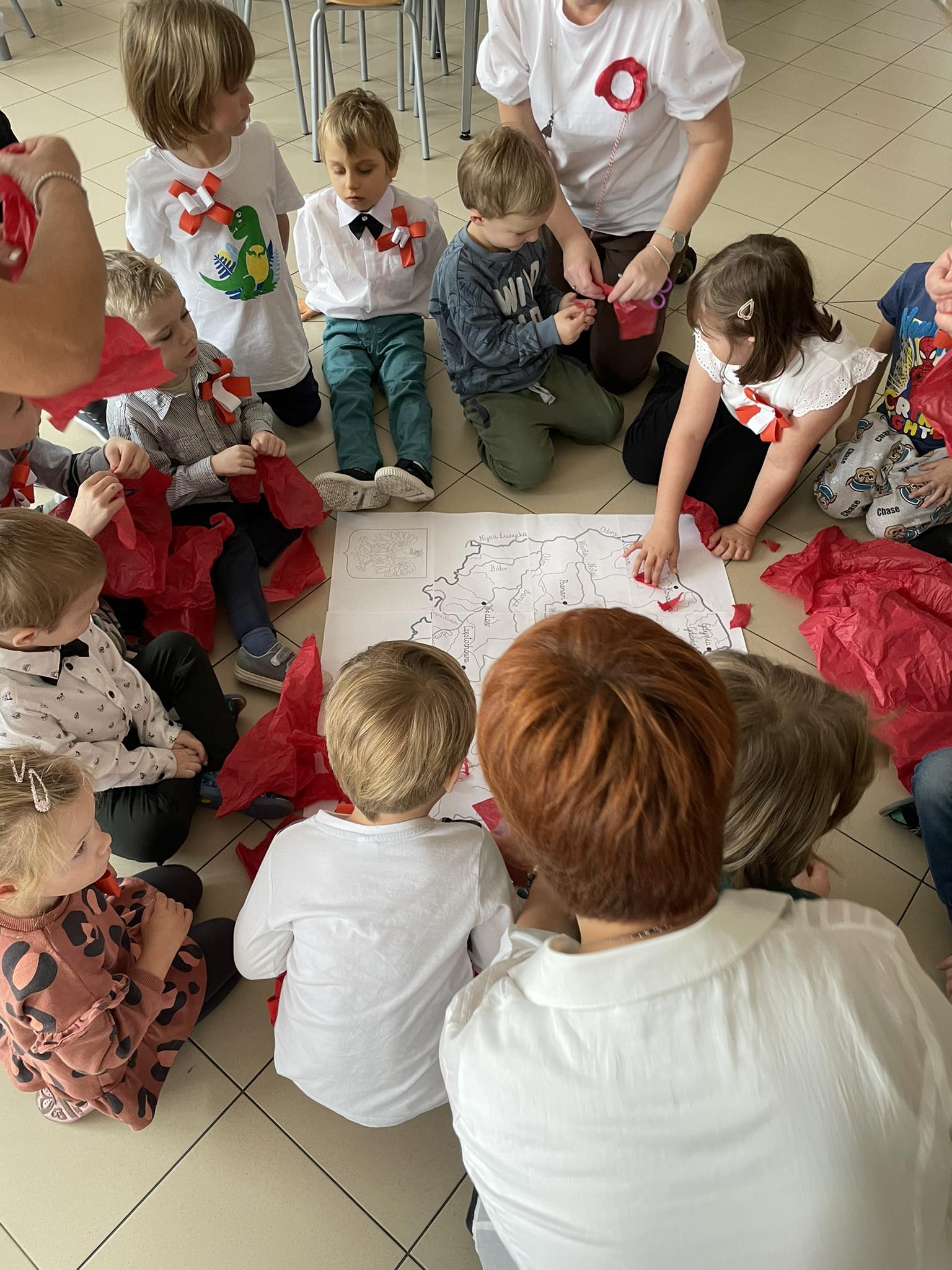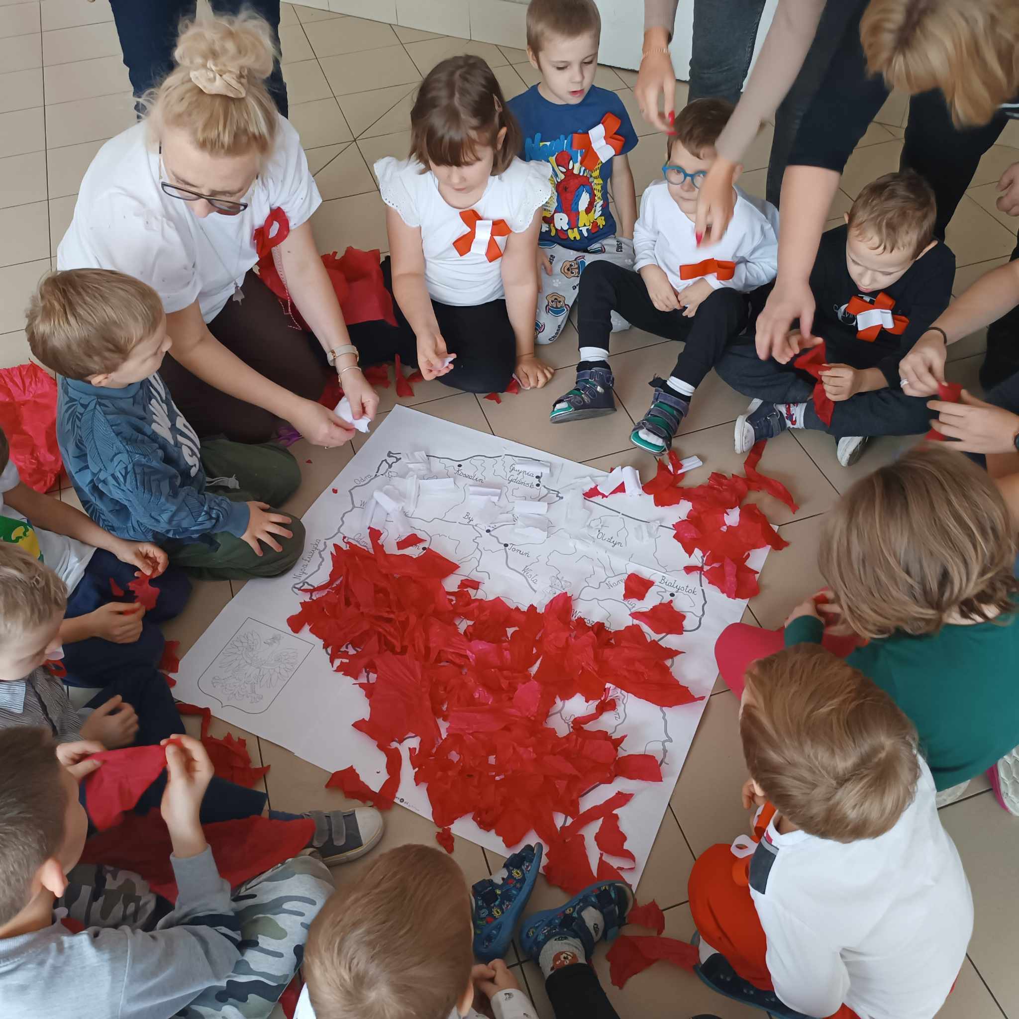W piątek 10 listopada dzieci przedszkolne uczestniczyły w zajęciach patriotycznych dotyczących obchodów Święta Niepodległości. Wszyscy uczestnicy zaśpiewały hymn Polski oraz uczestniczyli w warsztacie przygotowania biało- czerwonego kotyliona. Trójwymiarowe mapa Polski w kolorach narodowych również była ciekawym zadaniem.