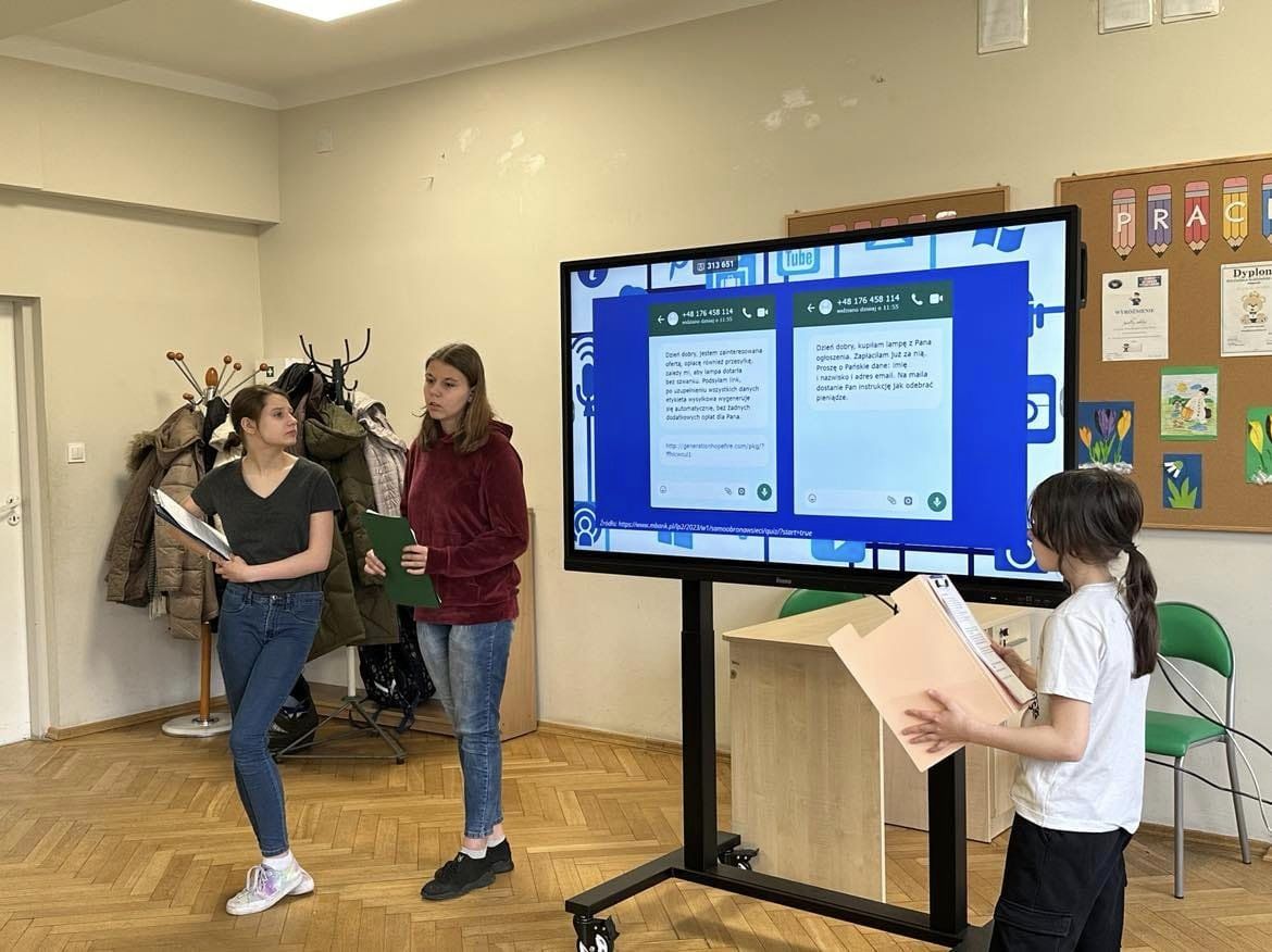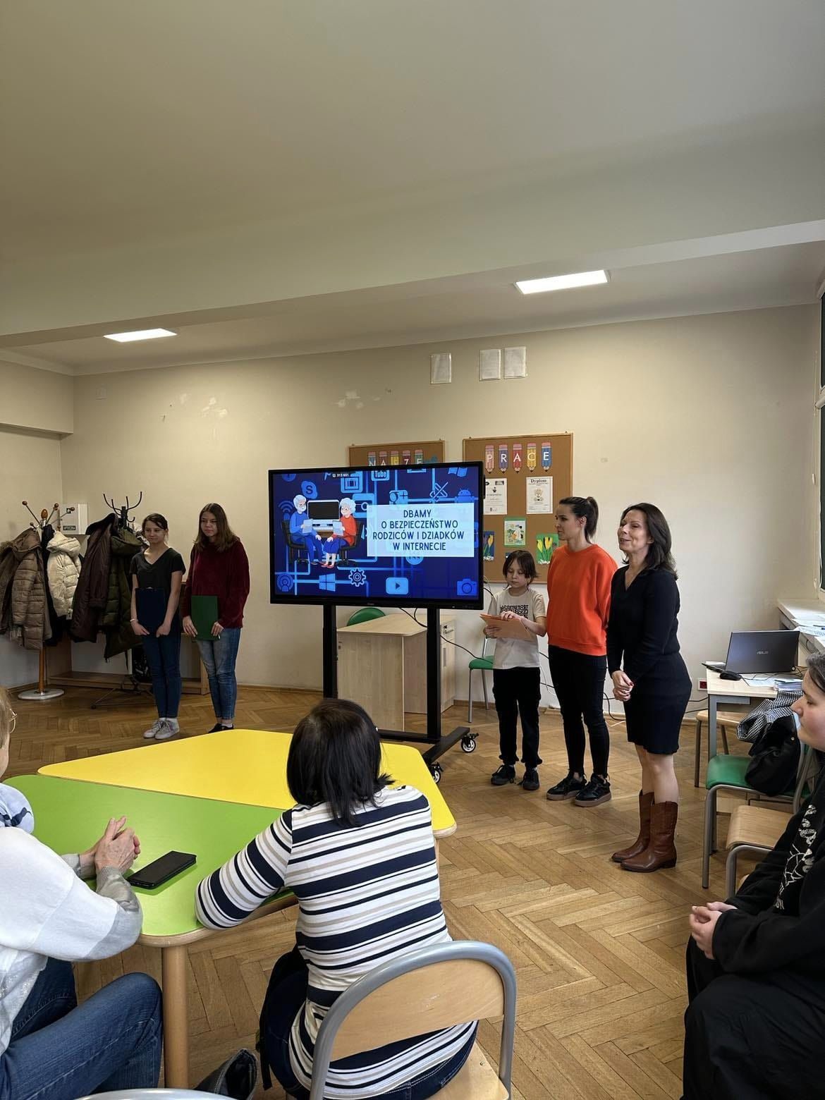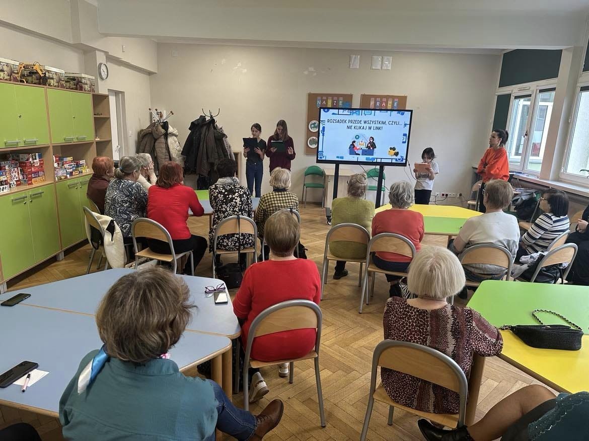29 lutego 2024 r. uczennice klasy 4-5p pod kierunkiem pani Igi Andrzejewskiej przygotowały i przeprowadziły prelekcję pt. "Dbamy o bezpieczeństwo rodziców i dziadków w Internecie" dla Słuchaczy Zgierskiego Uniwersytetu Trzeciego Wieku. Zajęcia bogate w treści i praktyczne przykłady poruszały wiele zagadnień związanych z bezpiecznym używaniem urządzeń cyfrowych. Spotkanie przebiegało pod hasłem "BĄDŹ UWAŻNY I NIE DAJ SIĘ ZŁOWIĆ W SIECI".