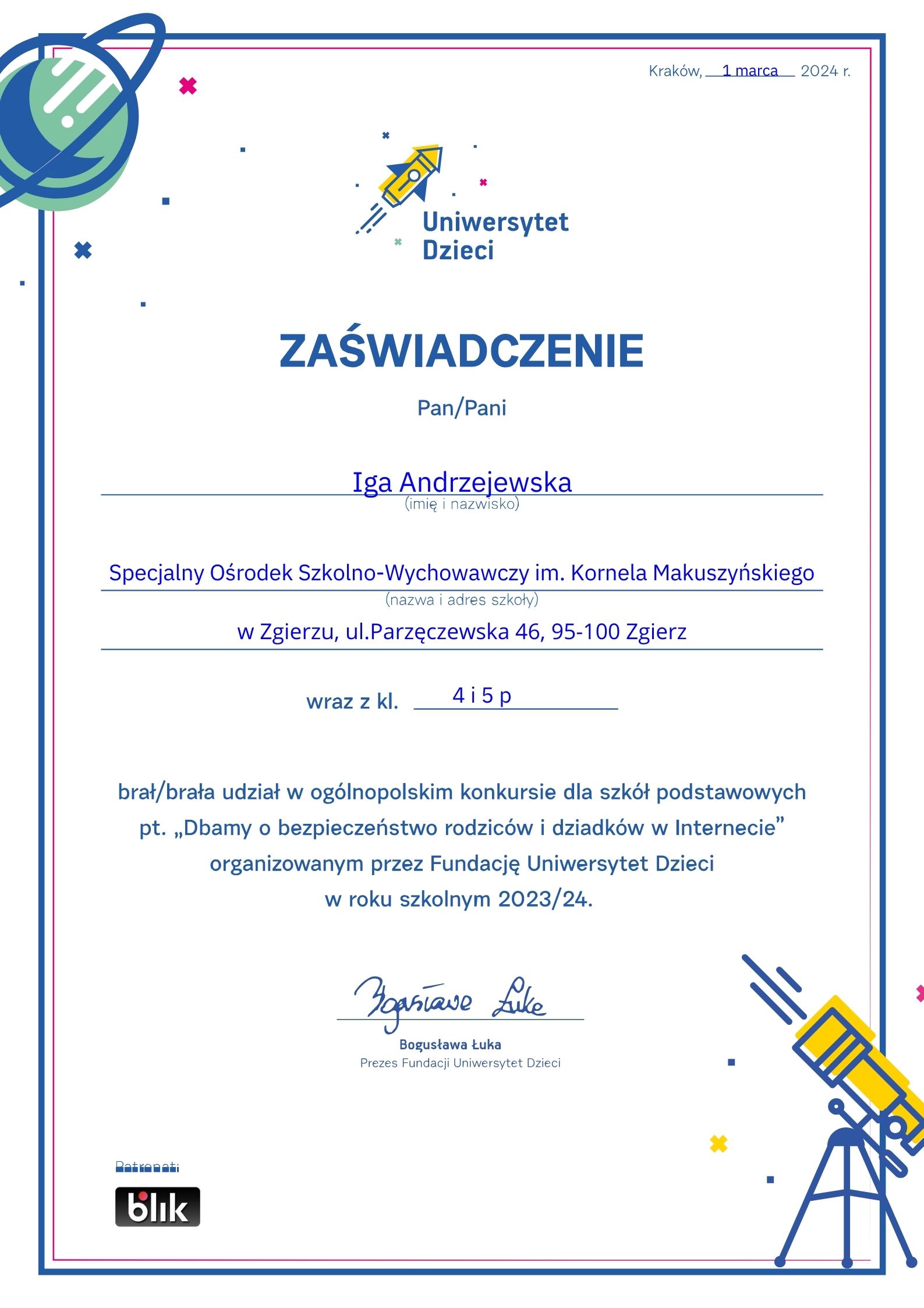 Przygotowana inicjatywa została zgłoszona w ogólnopolskim konkursie pt. "Dbamy o bezpieczeństwo rodziców i dziadków w Internecie" organizowanym przez Uniwersytet Dzieci. O jego wynikach dowiemy się wkrótce.