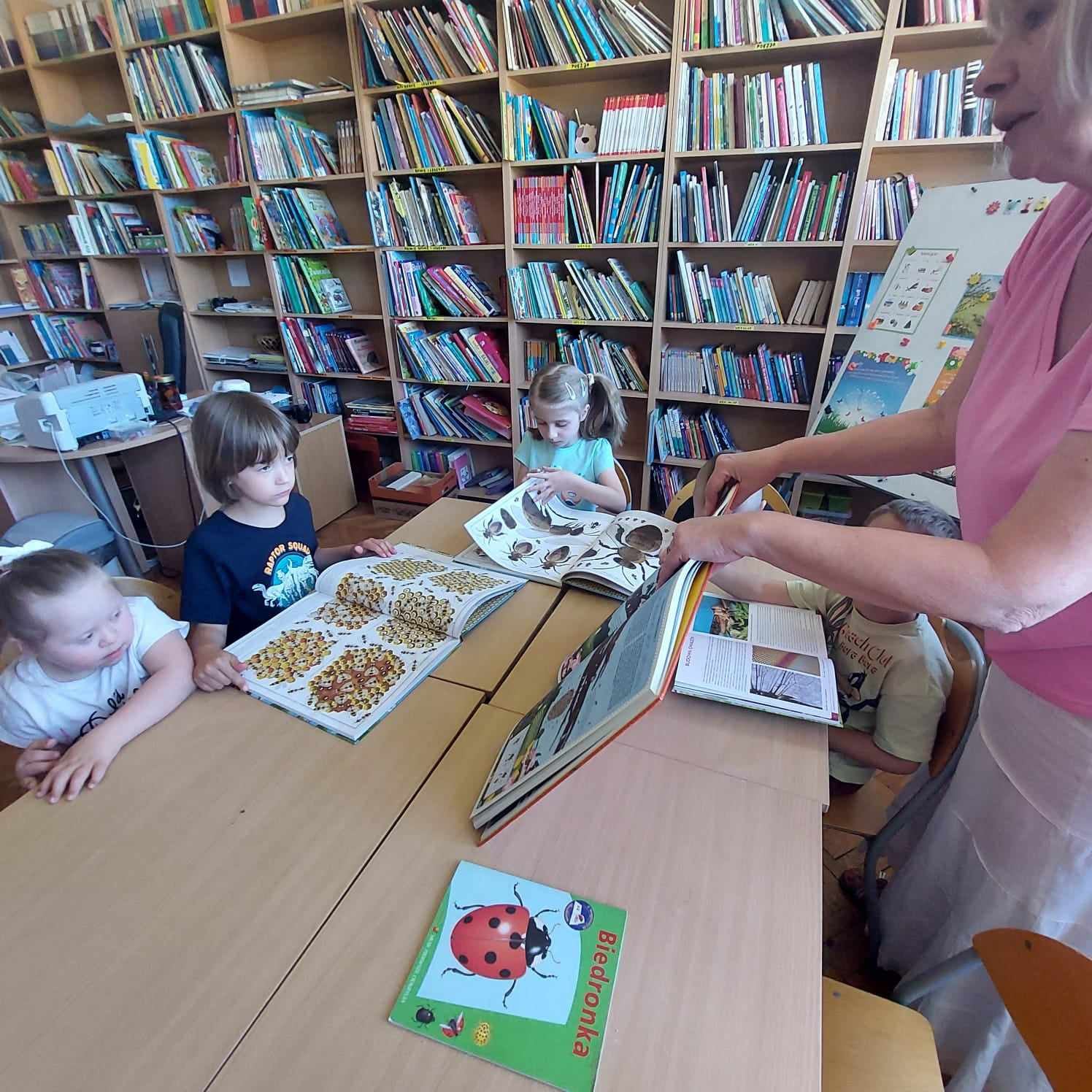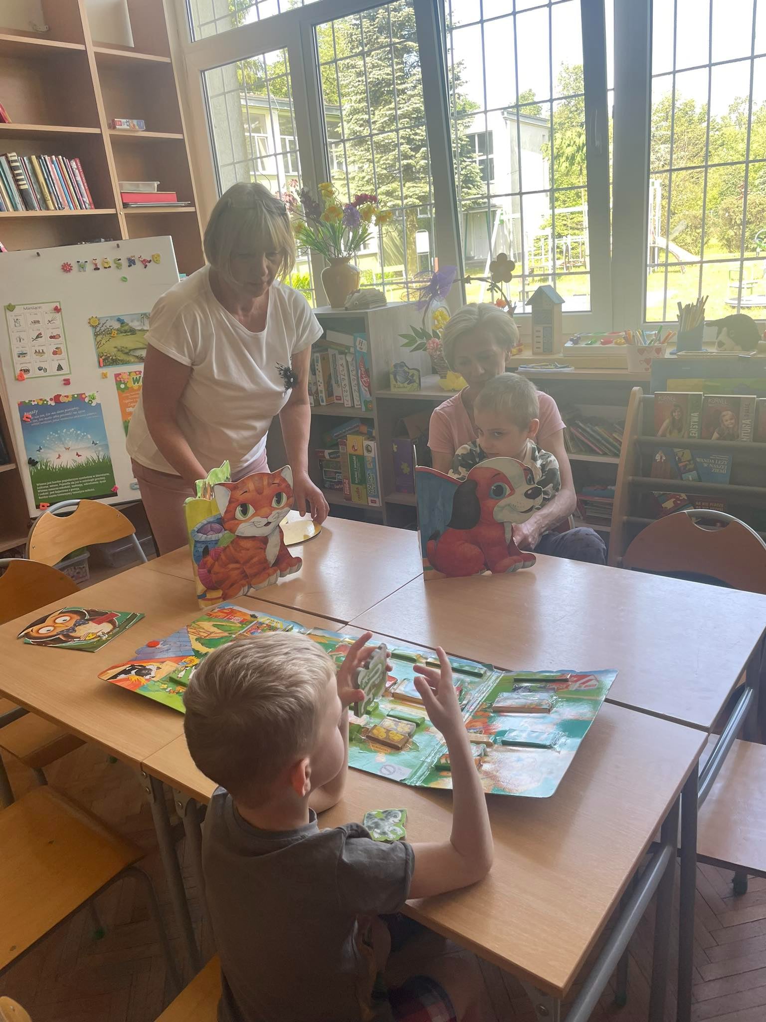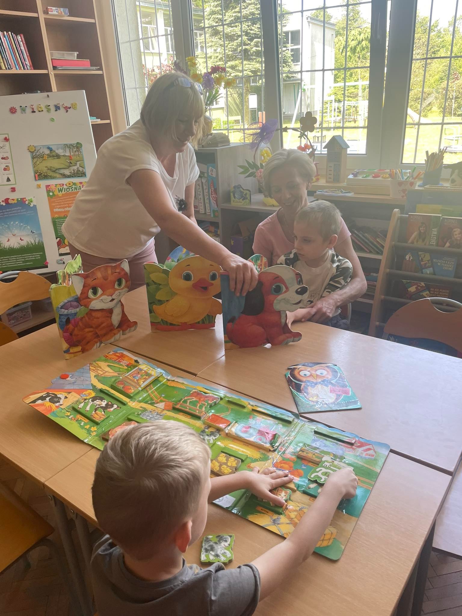 Biedronki, Misie i Puchatki wzięły udział w zajęciach edukacyjnych w bibliotece szkolnej. Przedszkolaki z zainteresowaniem wysłuchały ciekawostek o życiu pszczół i jeży, wykonały prace plastyczne, obejrzały teatrzyk oraz chętnie zapoznały się z księgozbiorem.