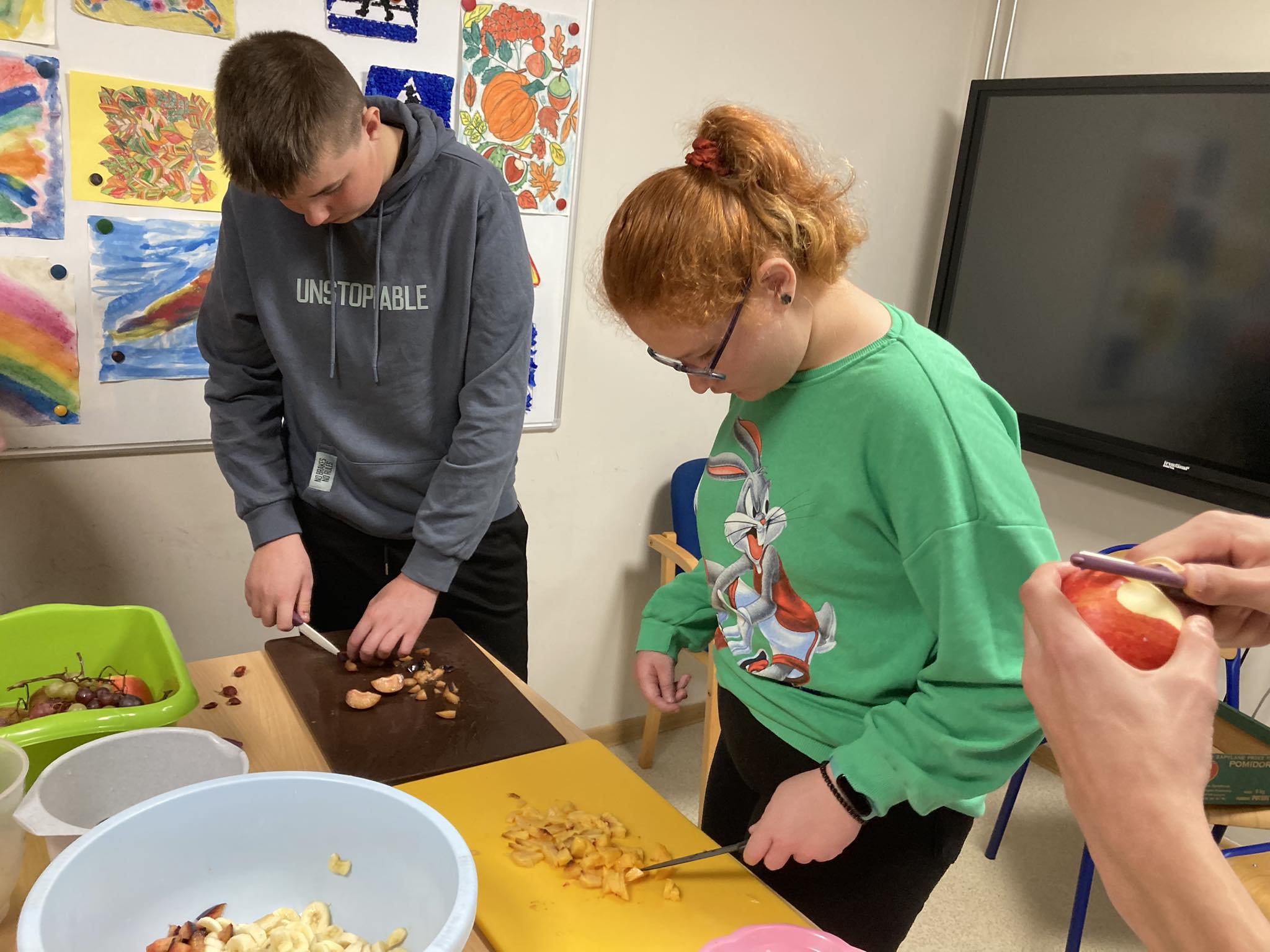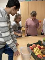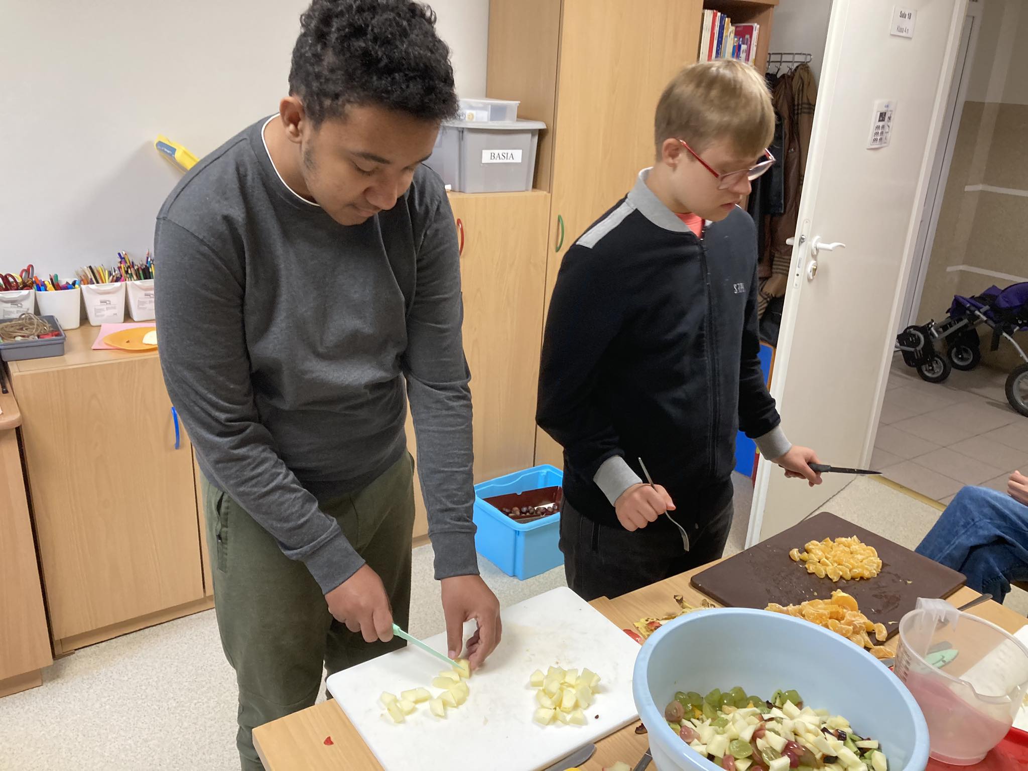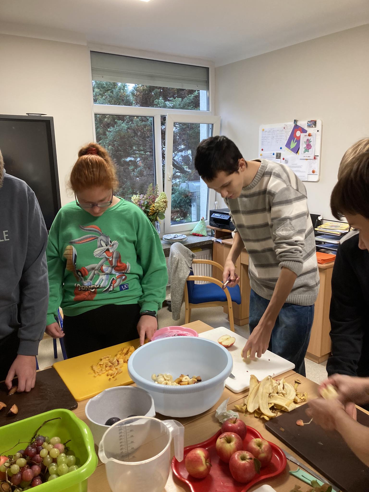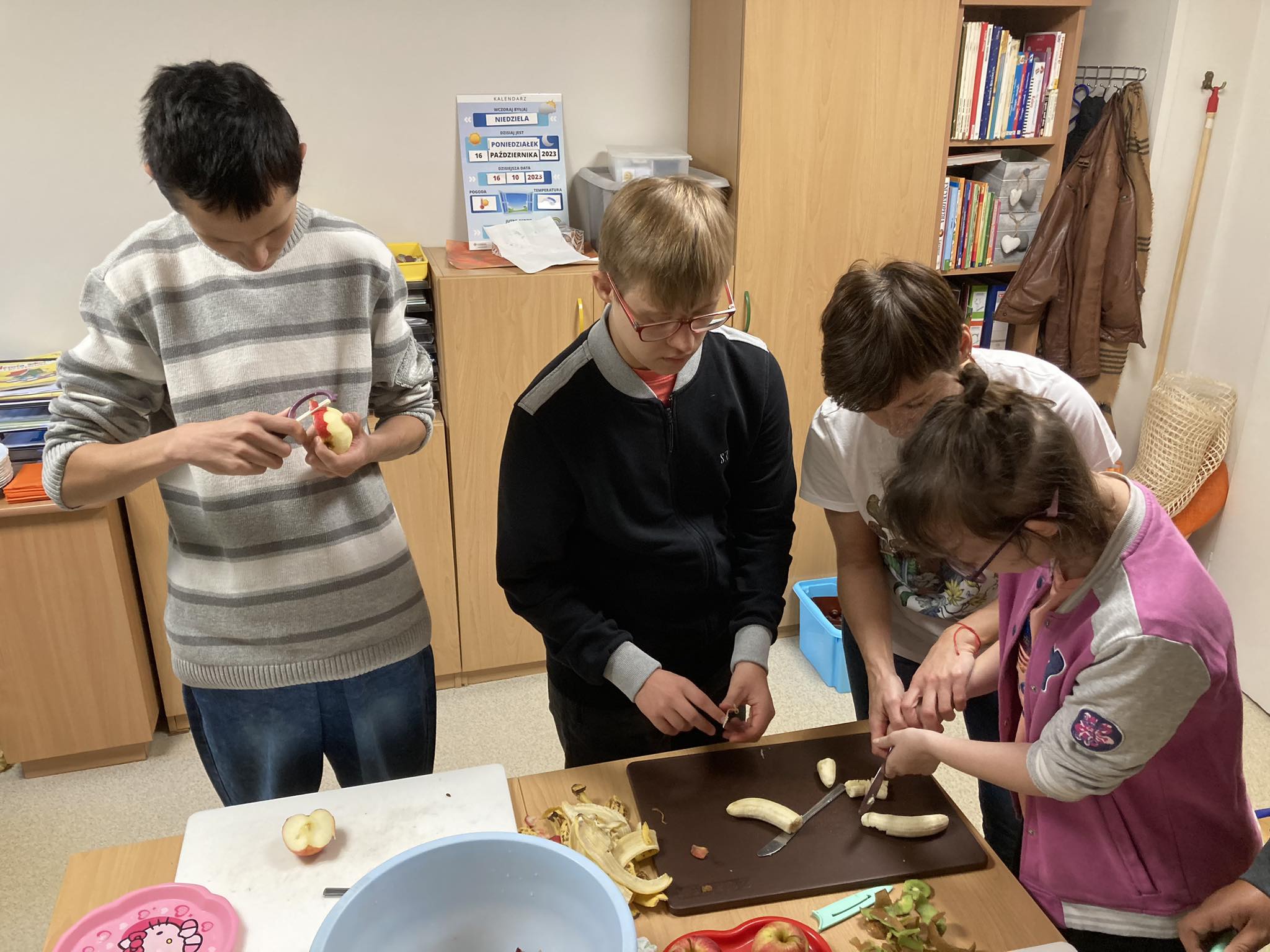Uczniowie z zaangażowaniem myli, obierali i kroili owoce, a gdy wszystko było już gotowe rozpoczęła się degustacja. Przygotowaną słodkością poczęstowaliśmy też naszych kolegów z innych klas. Wszystkim bardzo smakowała kolorowa sałatka, bo przecież wiedzą jest powszechną, że posiłek własnoręcznie przygotowany smakuje najlepiej.