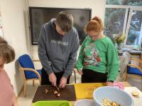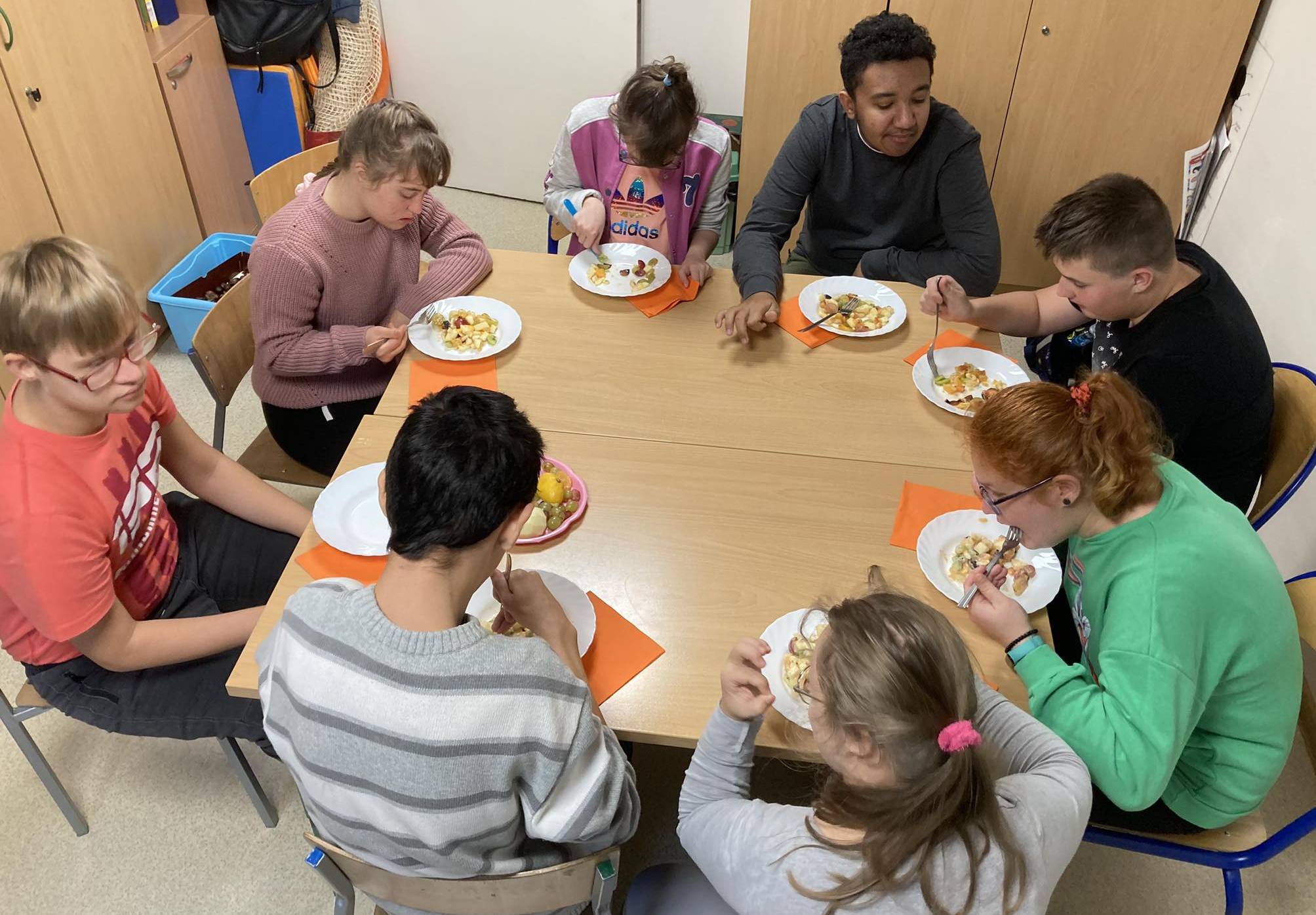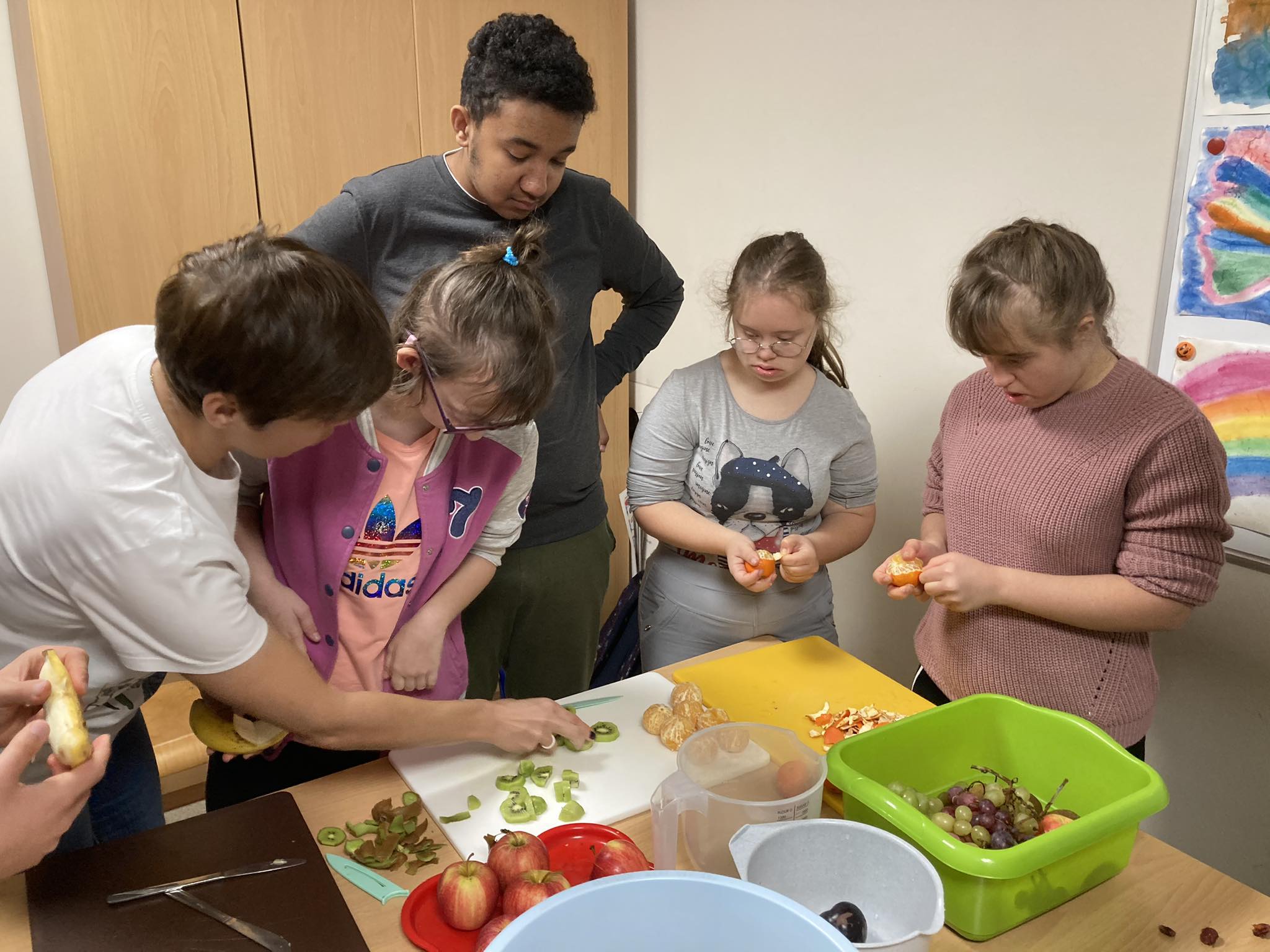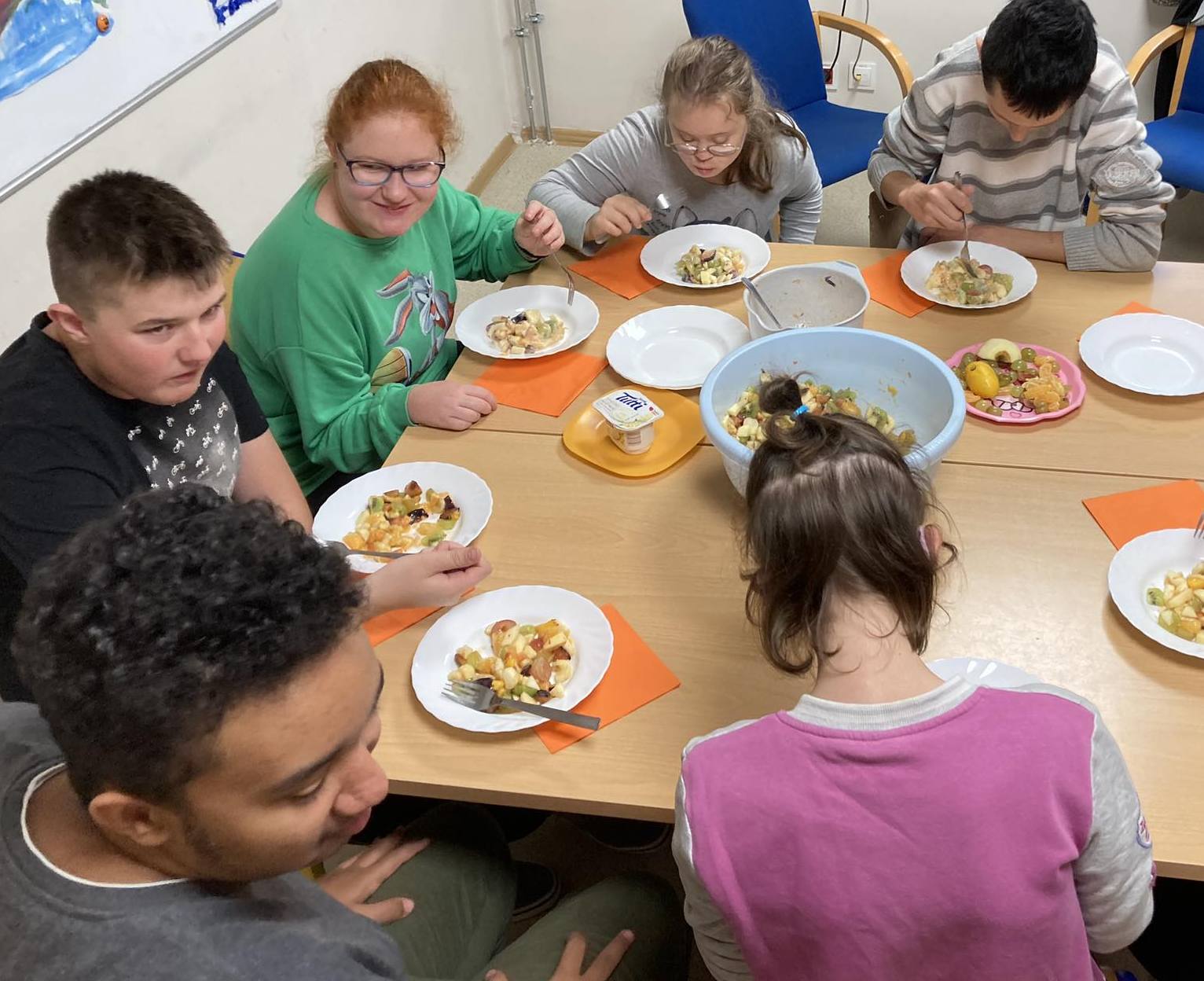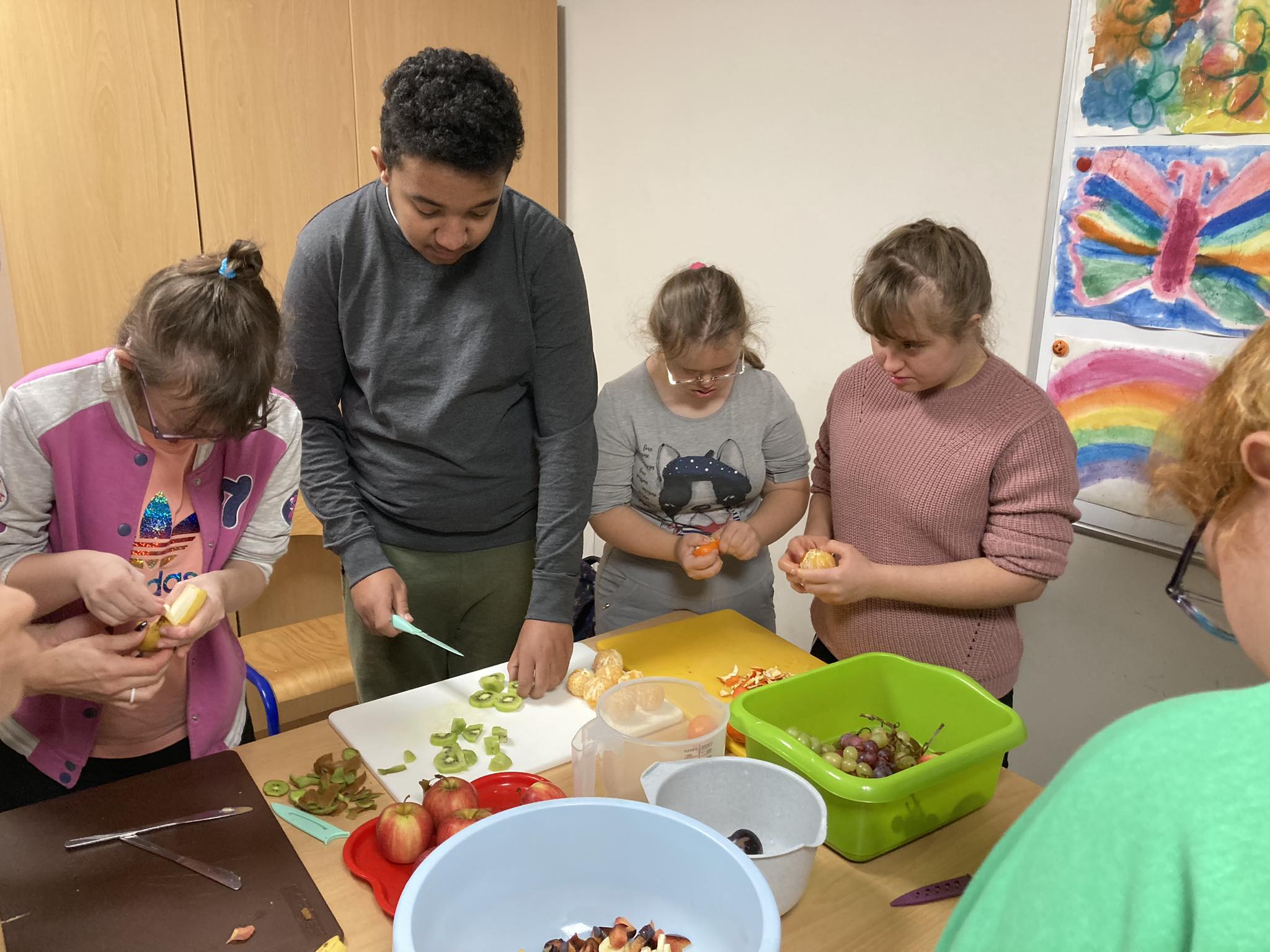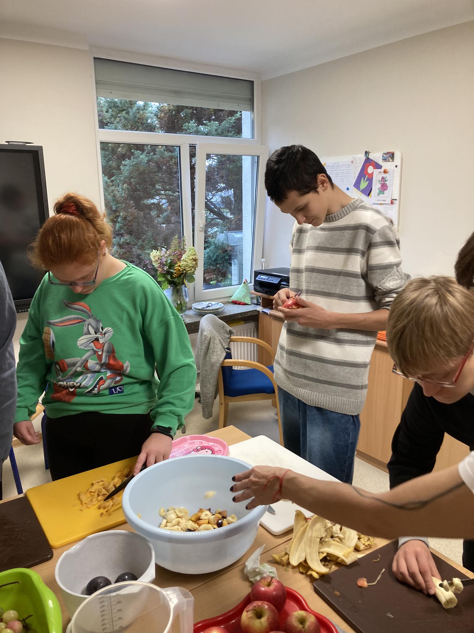 Uczniowie z zaangażowaniem myli, obierali i kroili owoce, a gdy wszystko było już gotowe rozpoczęła się degustacja. Przygotowaną słodkością poczęstowaliśmy też naszych kolegów z innych klas. Wszystkim bardzo smakowała kolorowa sałatka, bo przecież wiedzą jest powszechną, że posiłek własnoręcznie przygotowany smakuje najlepiej.